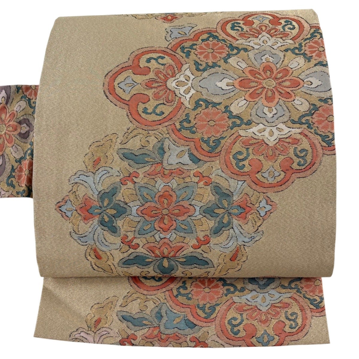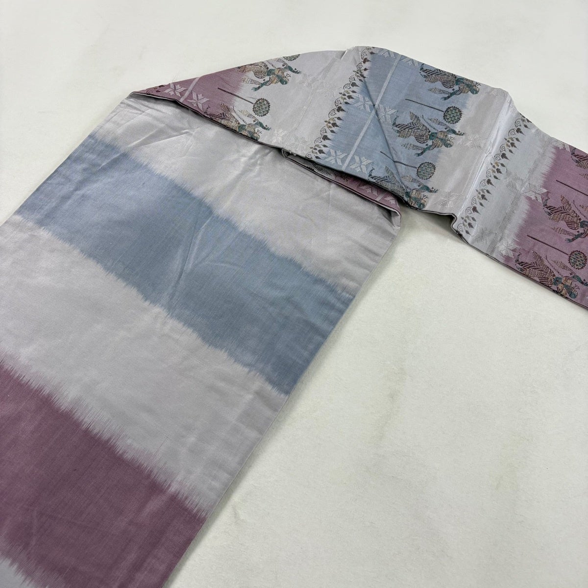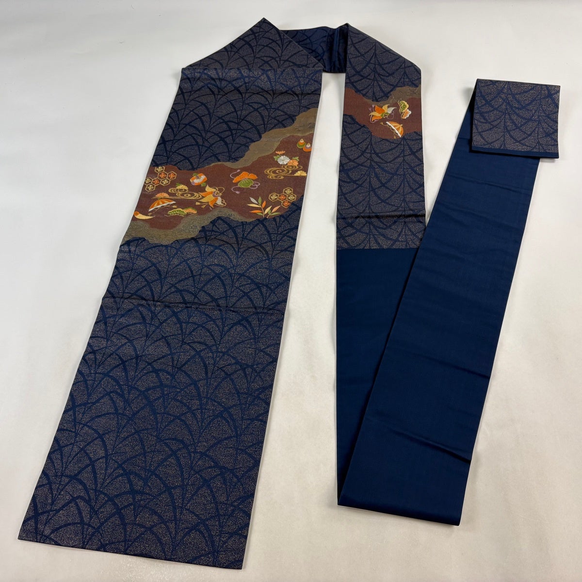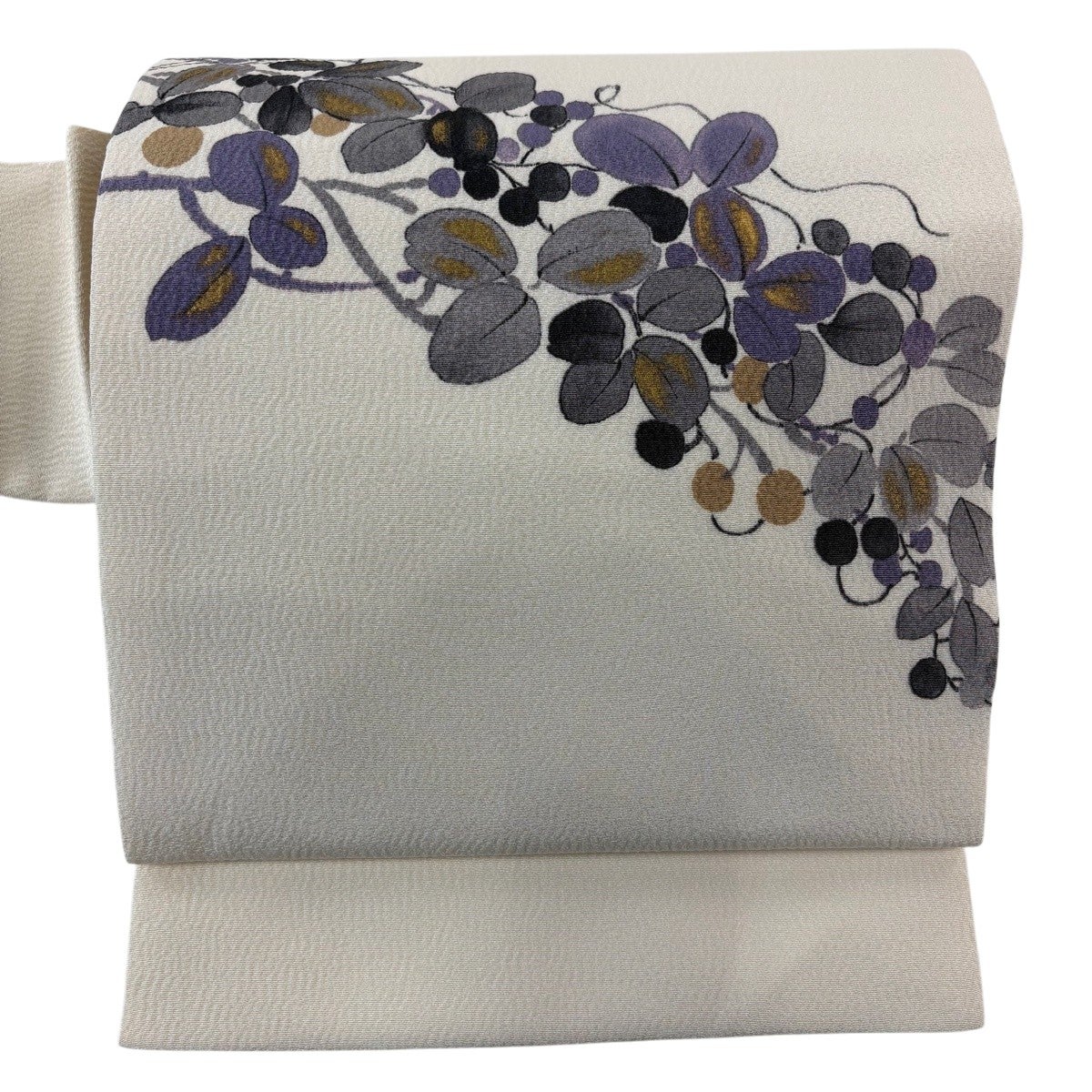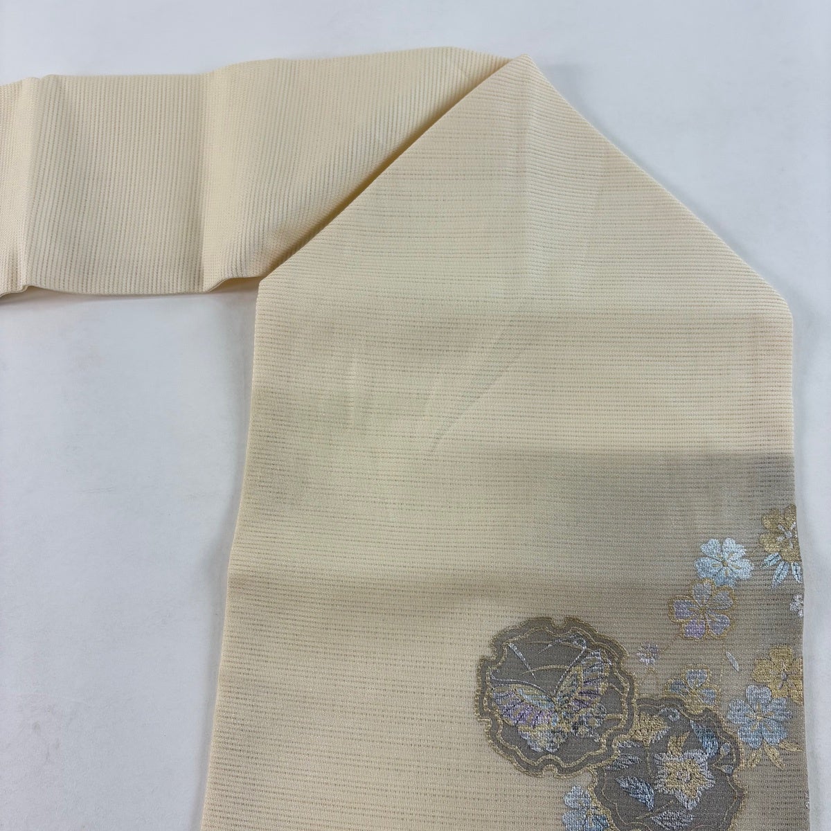 帯の格は着物とは逆で染よりも織のほうが格式が高く、名古屋帯は袋帯よりも格が低く様々な技法や生地で作成されているため組み合わせ数も多く場面によって使い分けることでセミフォーマルからカジュアルまで幅広く着用する事ができる帯です。 名古屋帯の名前の由来は名古屋の女学校の先生が考案したと言われるため名古屋帯という名前で呼ばれるようになりました。 形状はお太鼓部分までは通常の帯幅ですがそれ以降は幅が半分になっていることが多く、袋帯よりも短い作りになっているため一重太鼓でしか結ぶ事ができません。