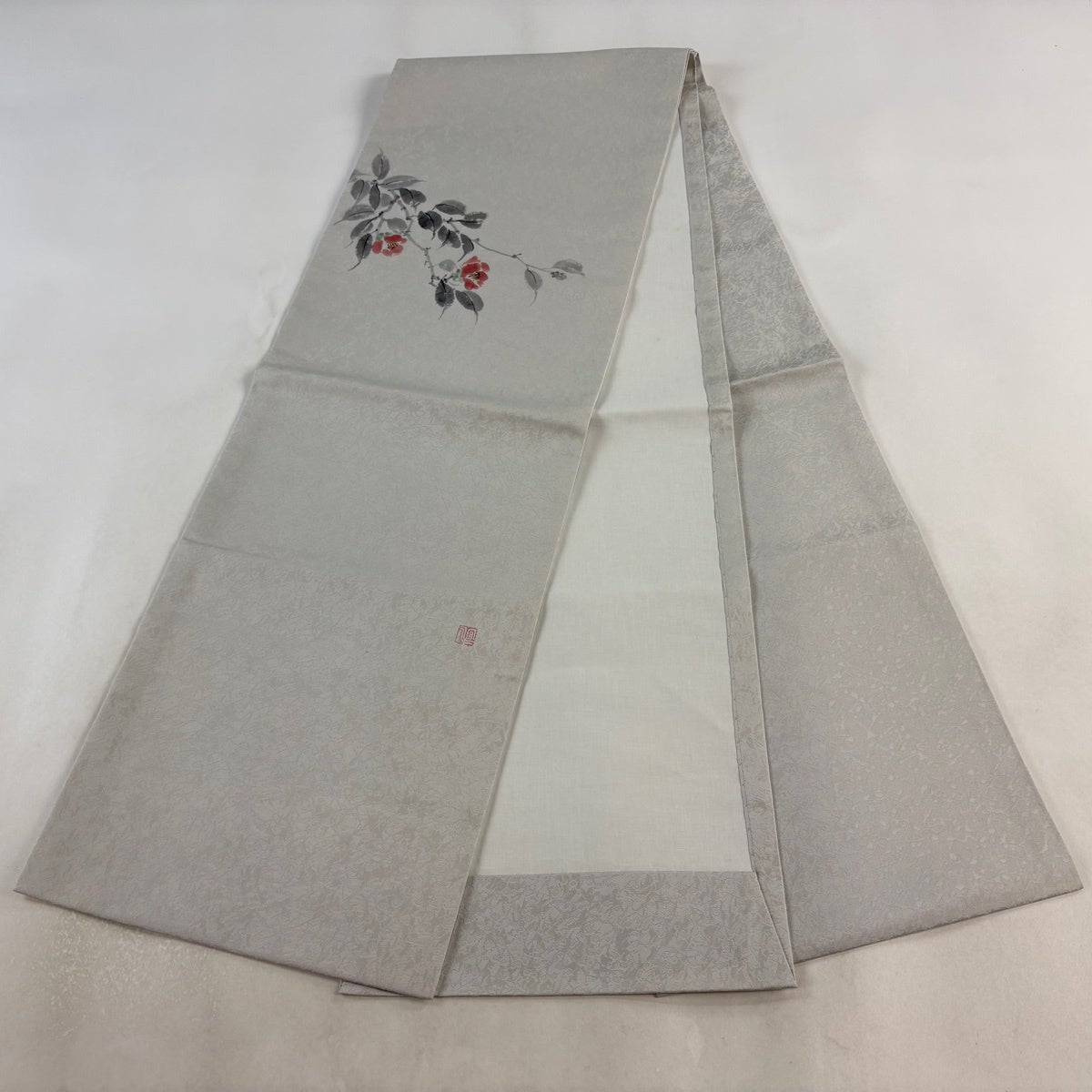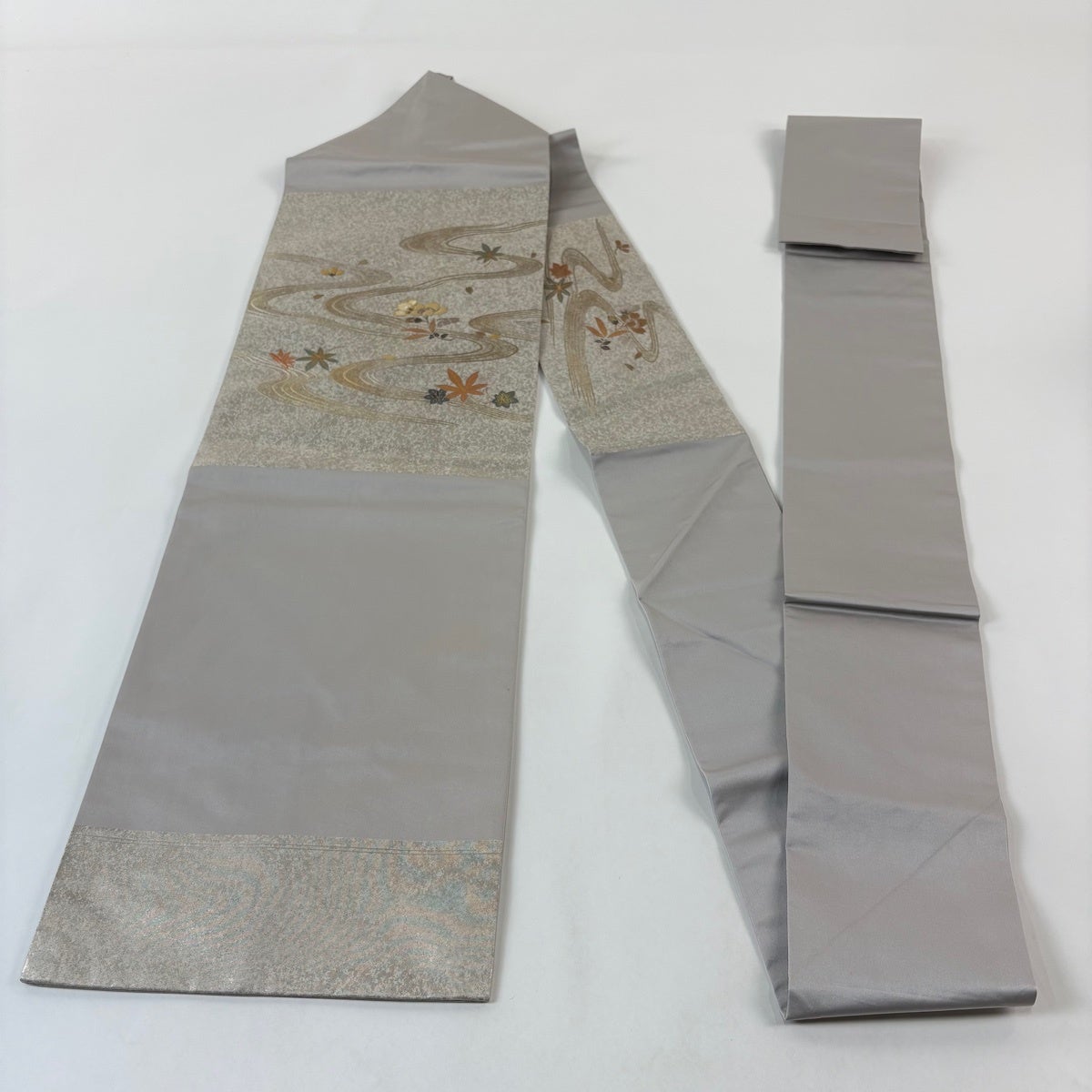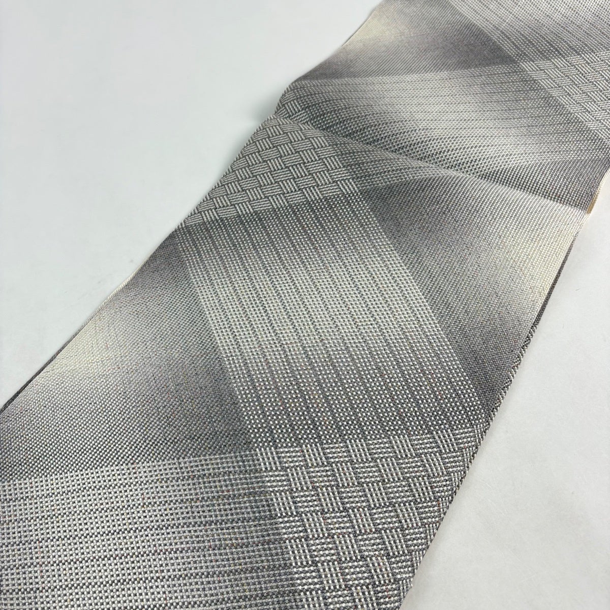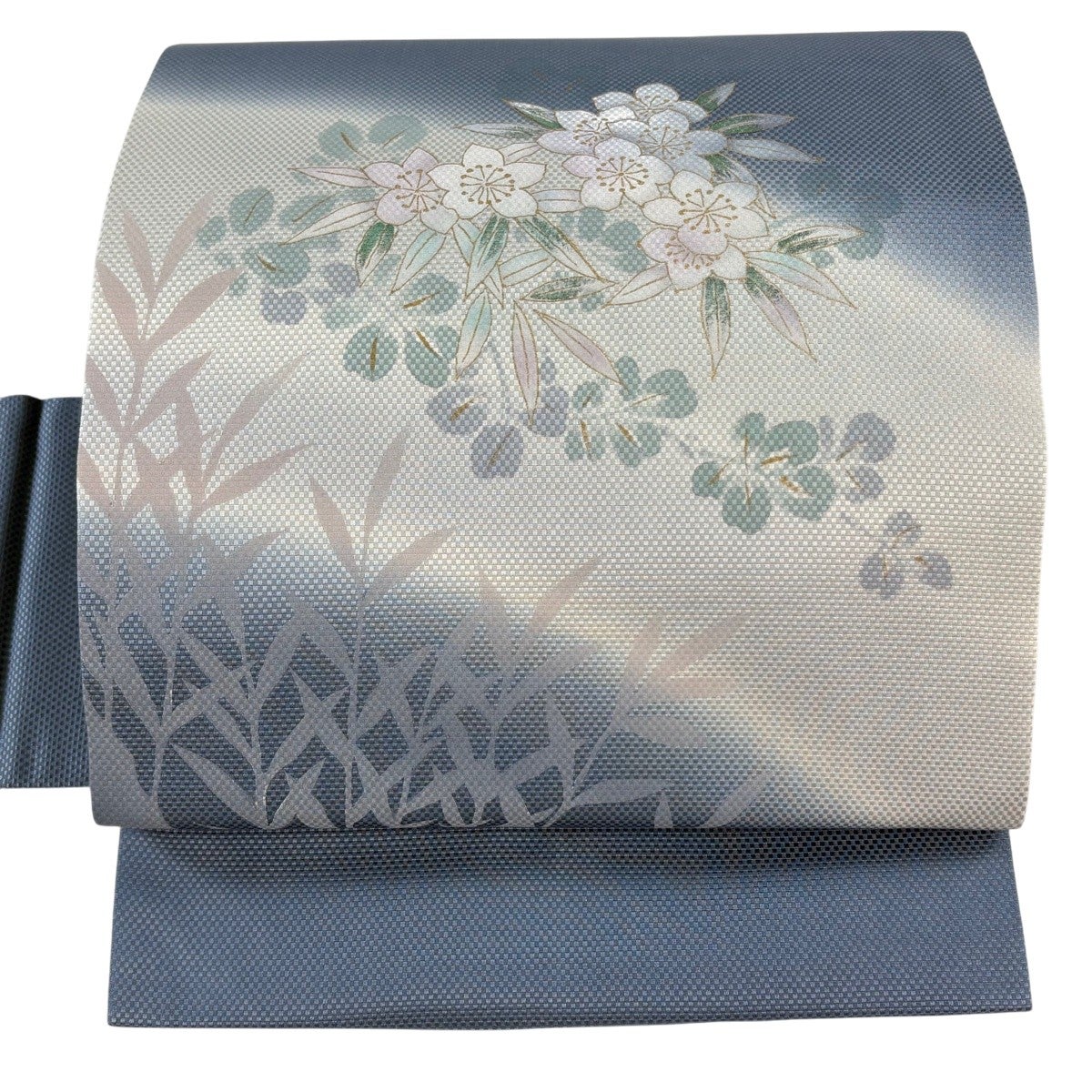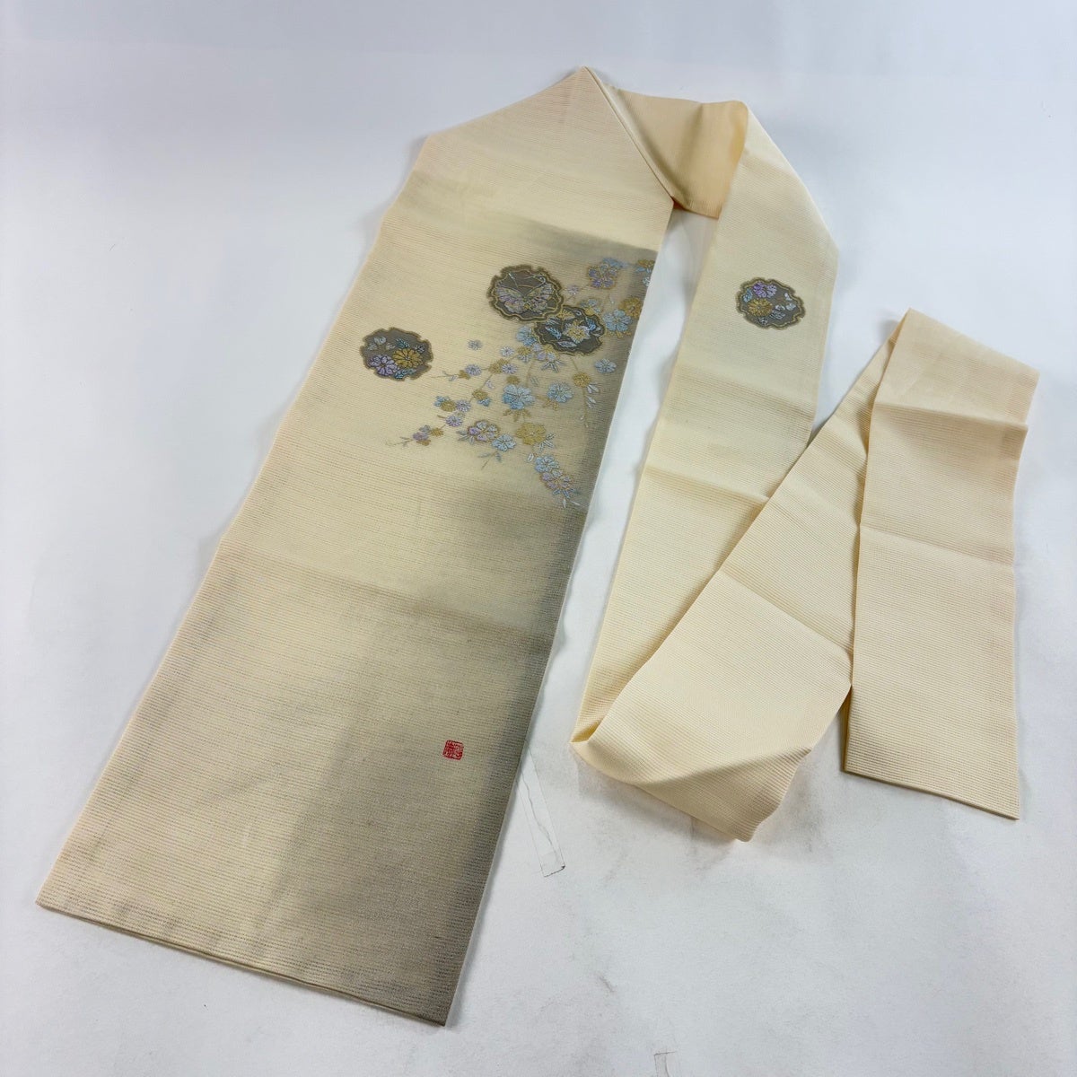 帯の格は着物とは逆で染よりも織のほうが格式が高く、名古屋帯は袋帯よりも格が低く様々な技法や生地で作成されているため組み合わせ数も多く場面によって使い分けることでセミフォーマルからカジュアルまで幅広く着用する事ができる帯です。 名古屋帯の名前の由来は名古屋の女学校の先生が考案したと言われるため名古屋帯という名前で呼ばれるようになりました。 形状はお太鼓部分までは通常の帯幅ですがそれ以降は幅が半分になっていることが多く、袋帯よりも短い作りになっているため一重太鼓でしか結ぶ事ができません。