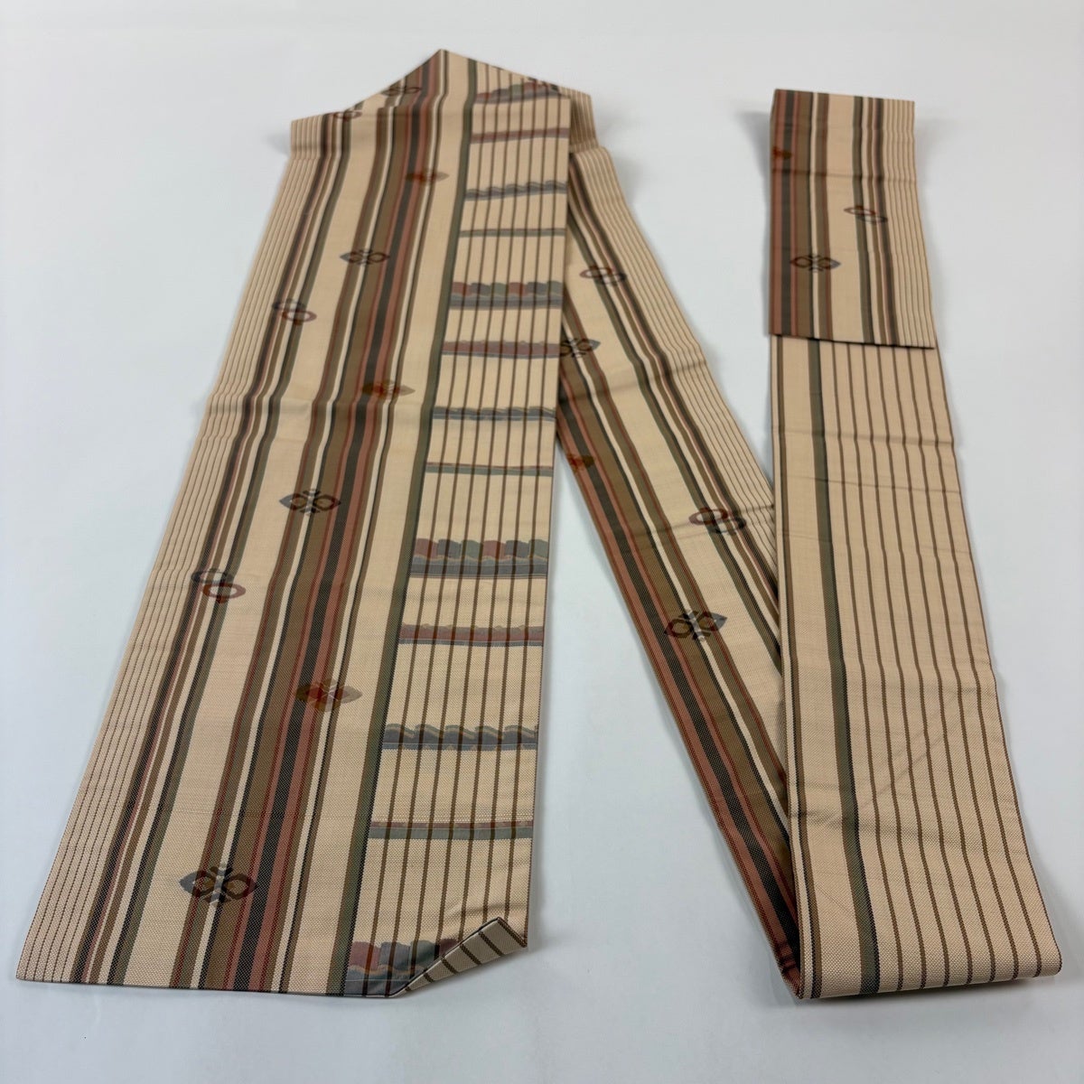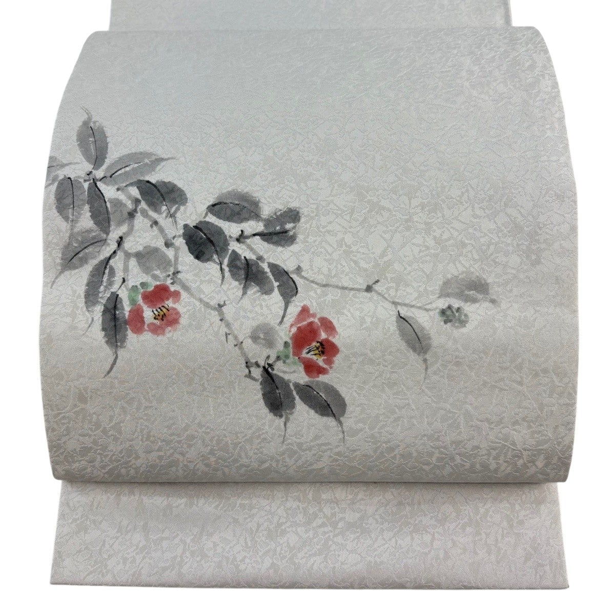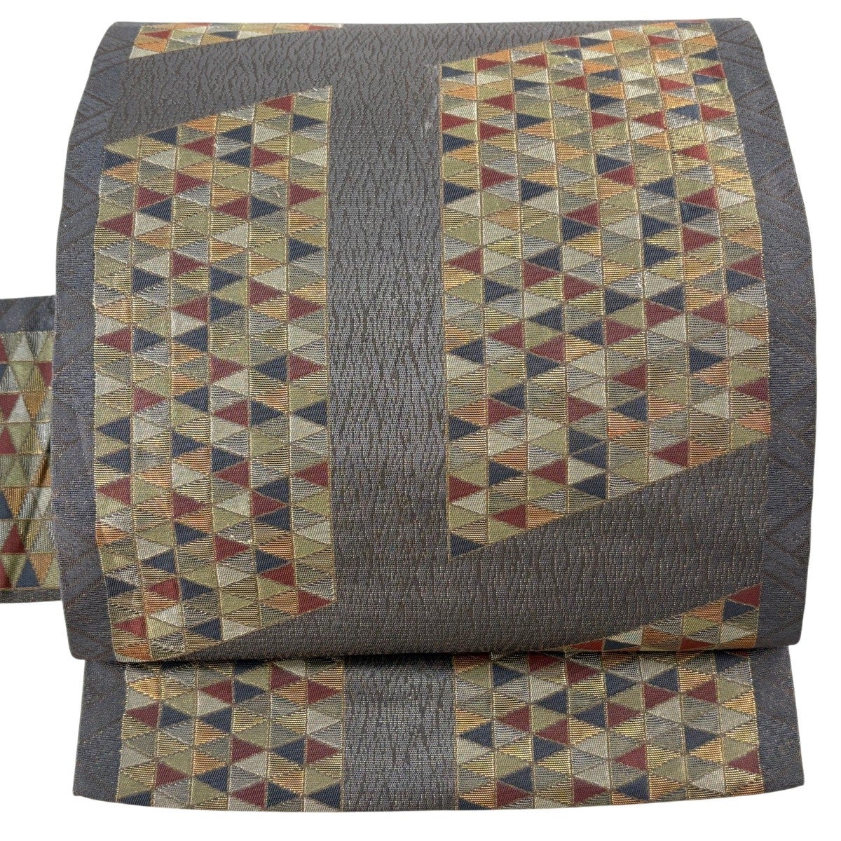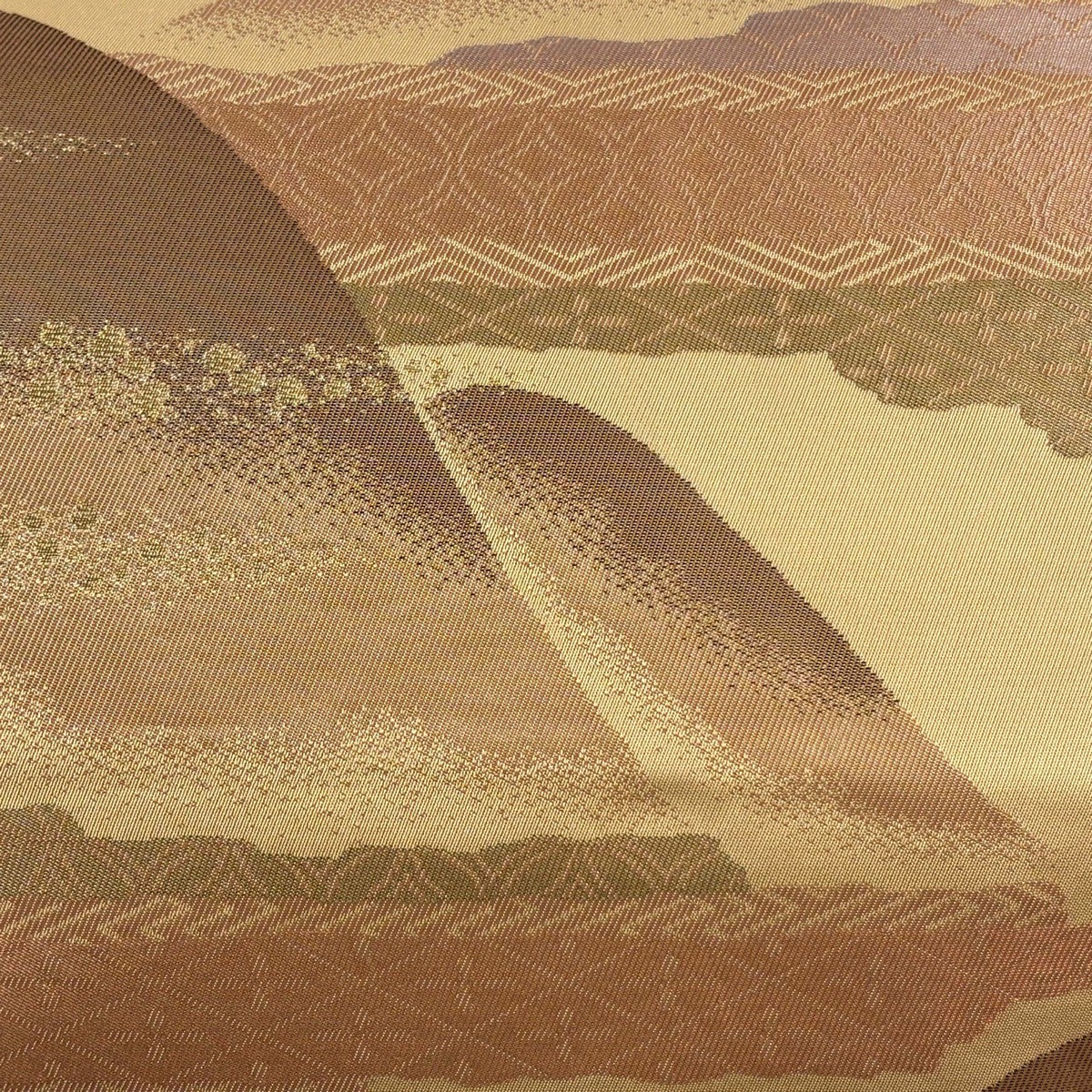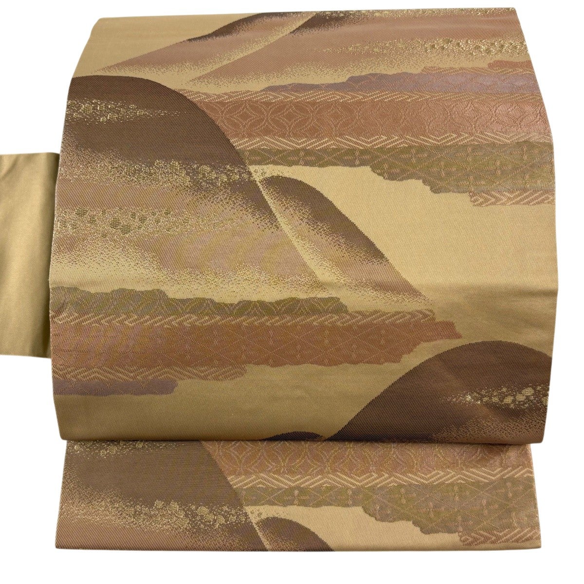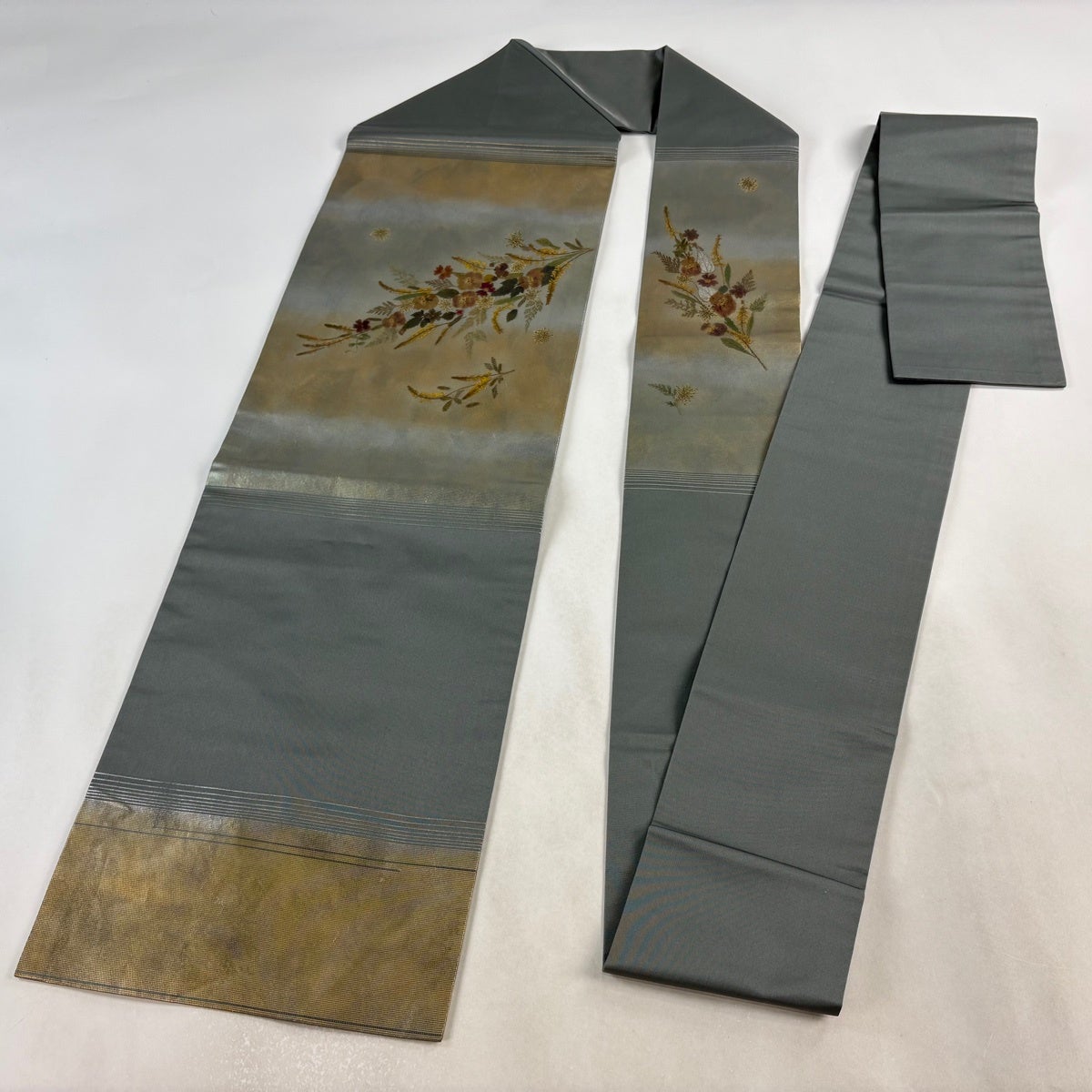 帯の格は着物とは逆で染よりも織のほうが格式が高く、名古屋帯は袋帯よりも格が低く様々な技法や生地で作成されているため組み合わせ数も多く場面によって使い分けることでセミフォーマルからカジュアルまで幅広く着用する事ができる帯です。 名古屋帯の名前の由来は名古屋の女学校の先生が考案したと言われるため名古屋帯という名前で呼ばれるようになりました。 形状はお太鼓部分までは通常の帯幅ですがそれ以降は幅が半分になっていることが多く、袋帯よりも短い作りになっているため一重太鼓でしか結ぶ事ができません。
