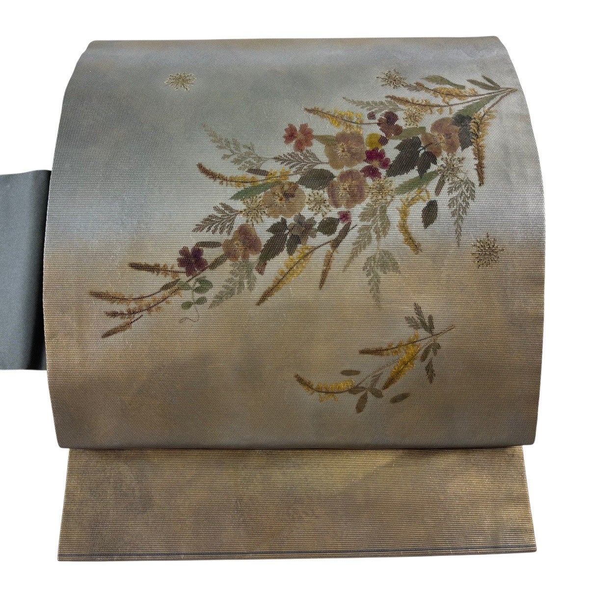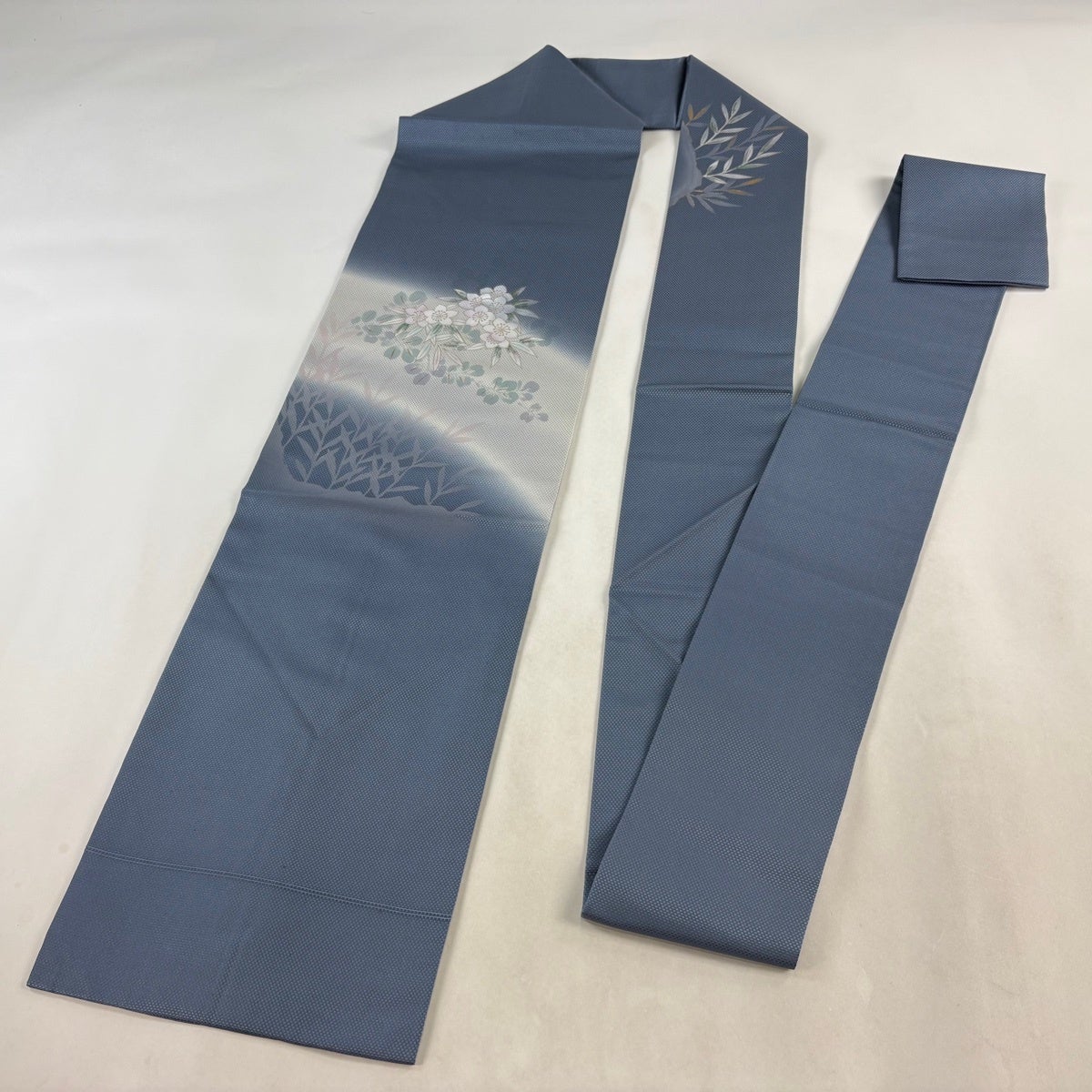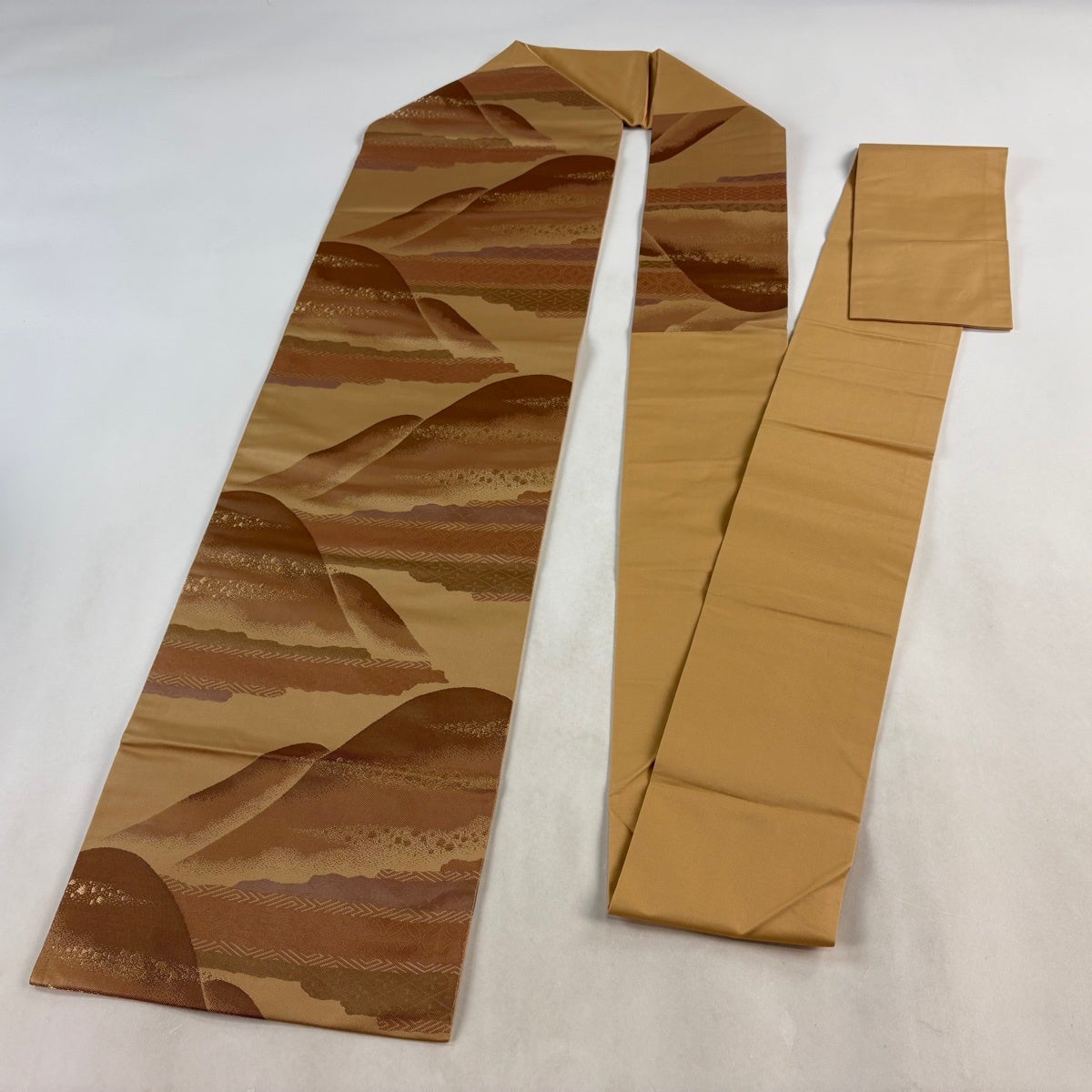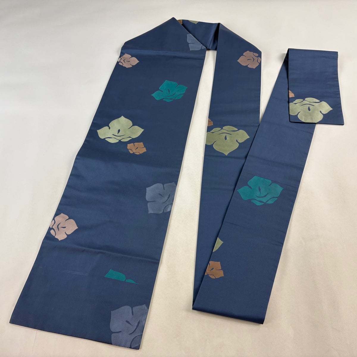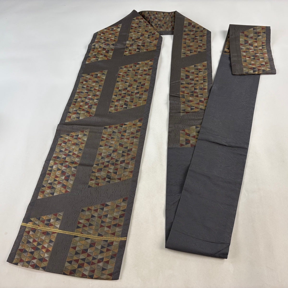 帯の格は着物とは逆で染よりも織のほうが格式が高く、名古屋帯は袋帯よりも格が低く様々な技法や生地で作成されているため組み合わせ数も多く場面によって使い分けることでセミフォーマルからカジュアルまで幅広く着用する事ができる帯です。 名古屋帯の名前の由来は名古屋の女学校の先生が考案したと言われるため名古屋帯という名前で呼ばれるようになりました。 形状はお太鼓部分までは通常の帯幅ですがそれ以降は幅が半分になっていることが多く、袋帯よりも短い作りになっているため一重太鼓でしか結ぶ事ができません。