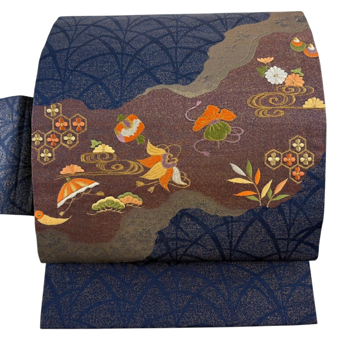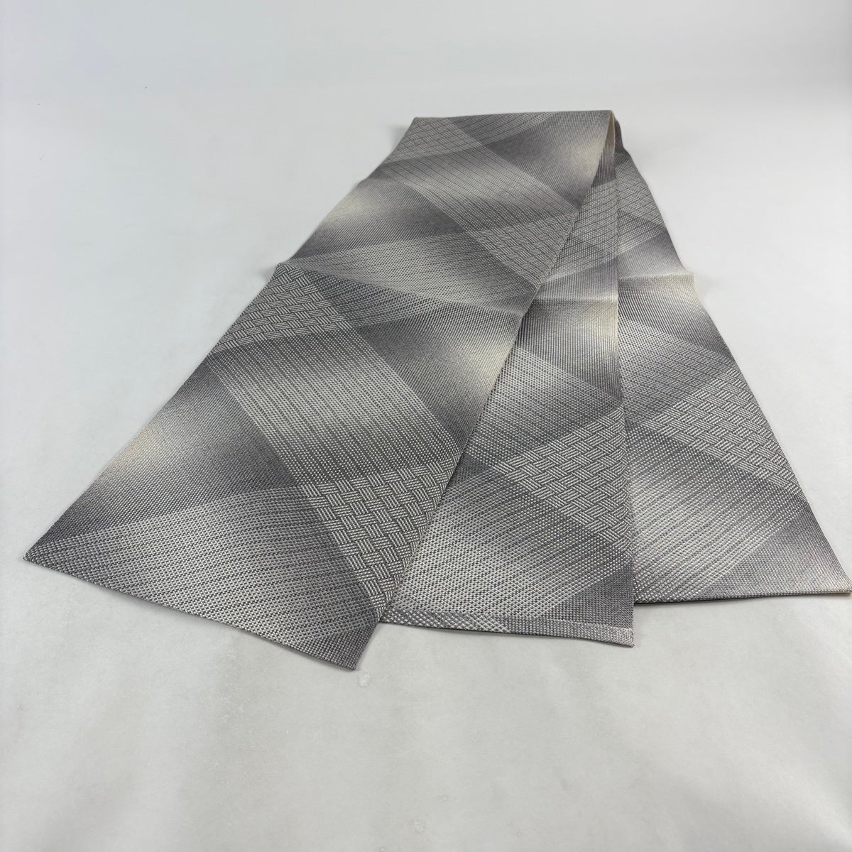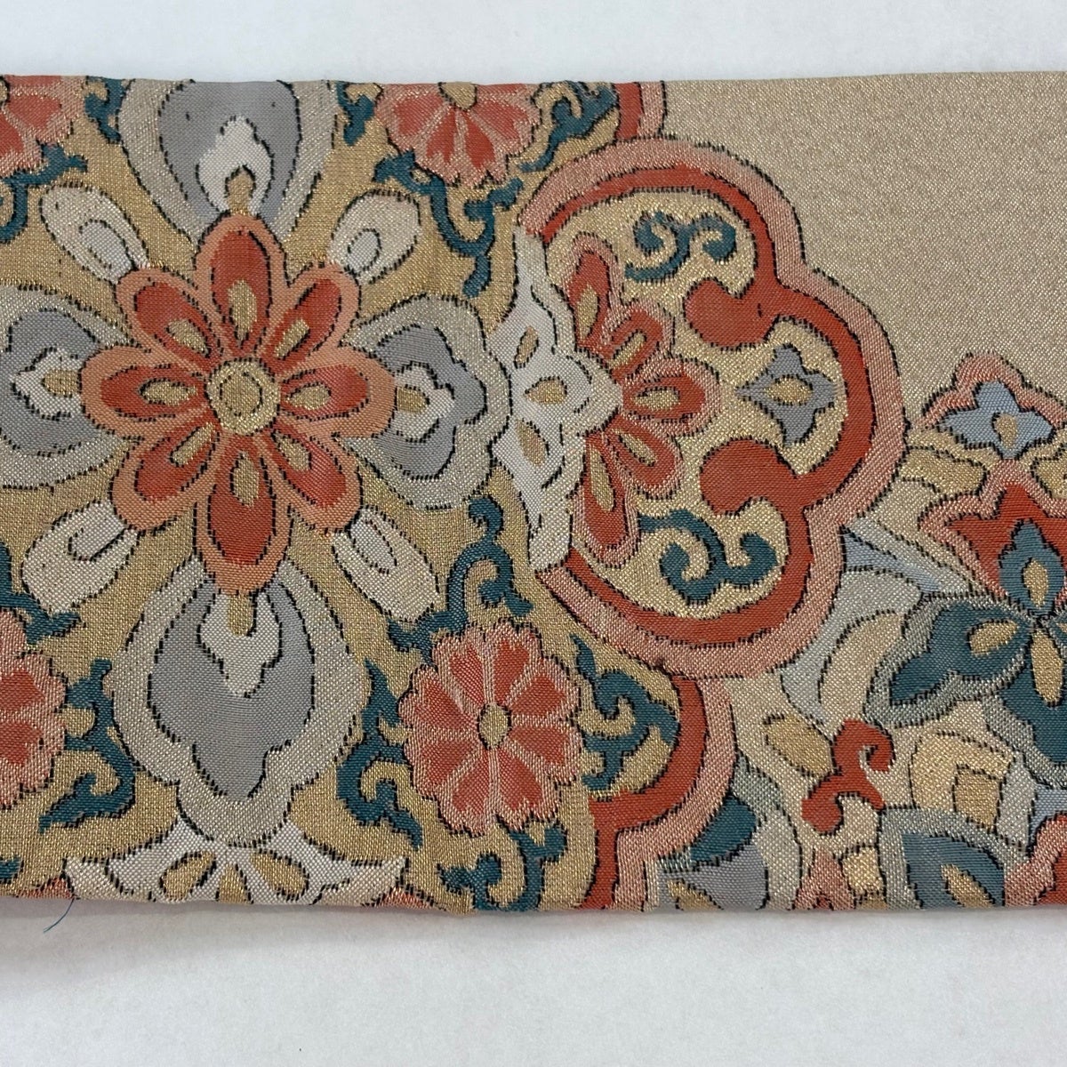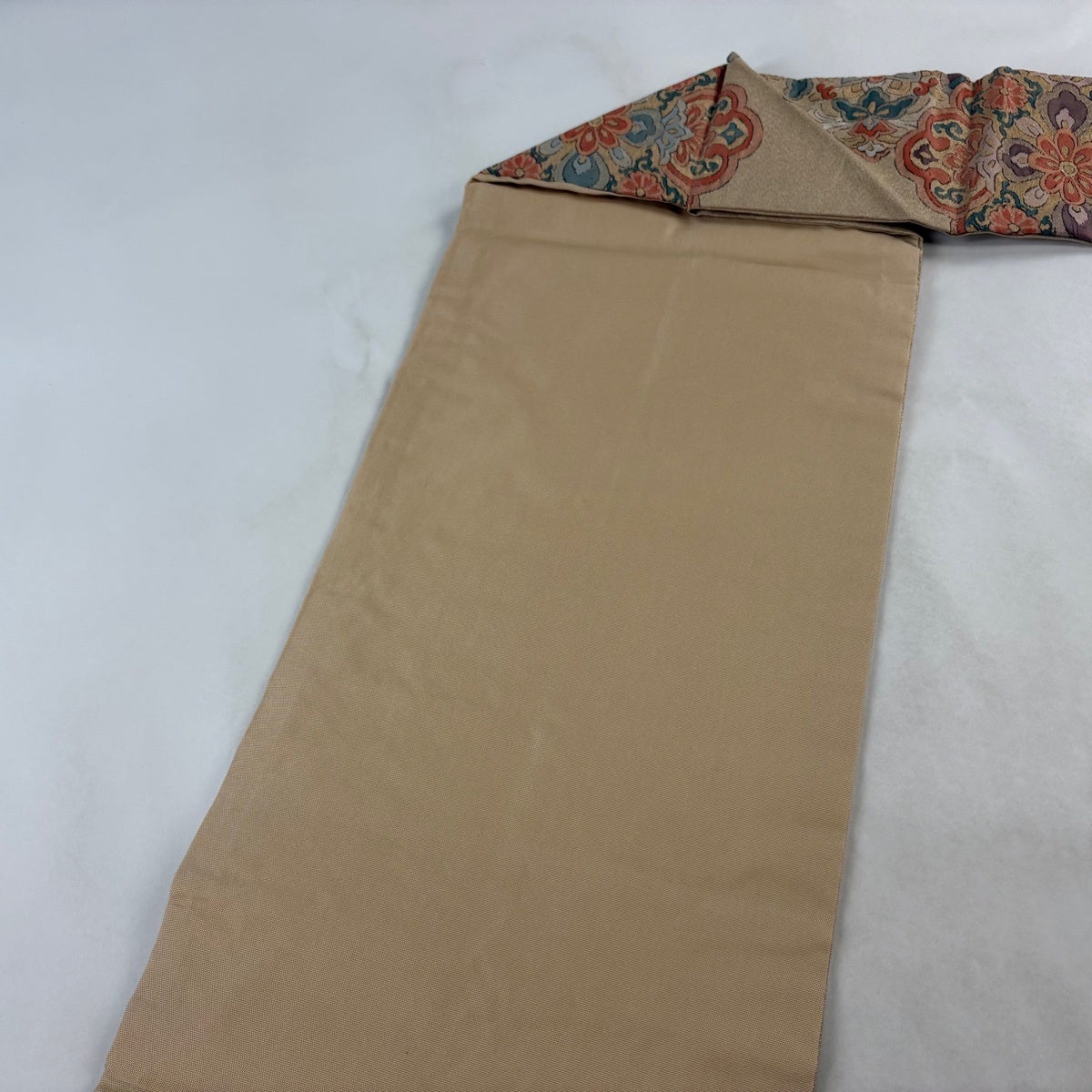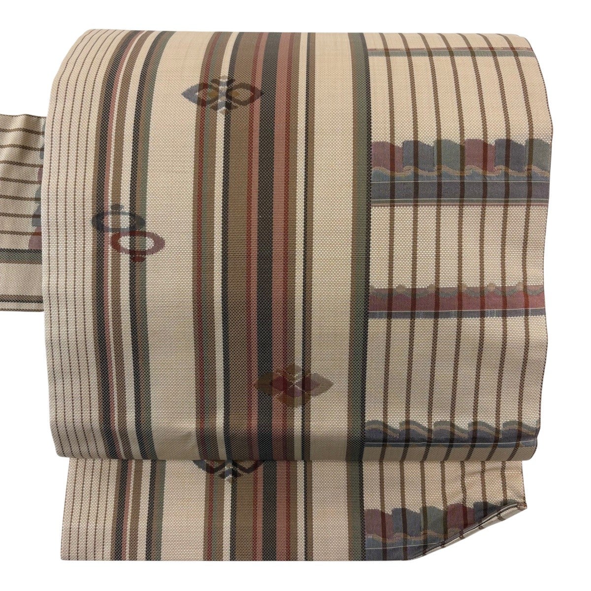 帯の格は着物とは逆で染よりも織のほうが格式が高く、名古屋帯は袋帯よりも格が低く様々な技法や生地で作成されているため組み合わせ数も多く場面によって使い分けることでセミフォーマルからカジュアルまで幅広く着用する事ができる帯です。 名古屋帯の名前の由来は名古屋の女学校の先生が考案したと言われるため名古屋帯という名前で呼ばれるようになりました。 形状はお太鼓部分までは通常の帯幅ですがそれ以降は幅が半分になっていることが多く、袋帯よりも短い作りになっているため一重太鼓でしか結ぶ事ができません。