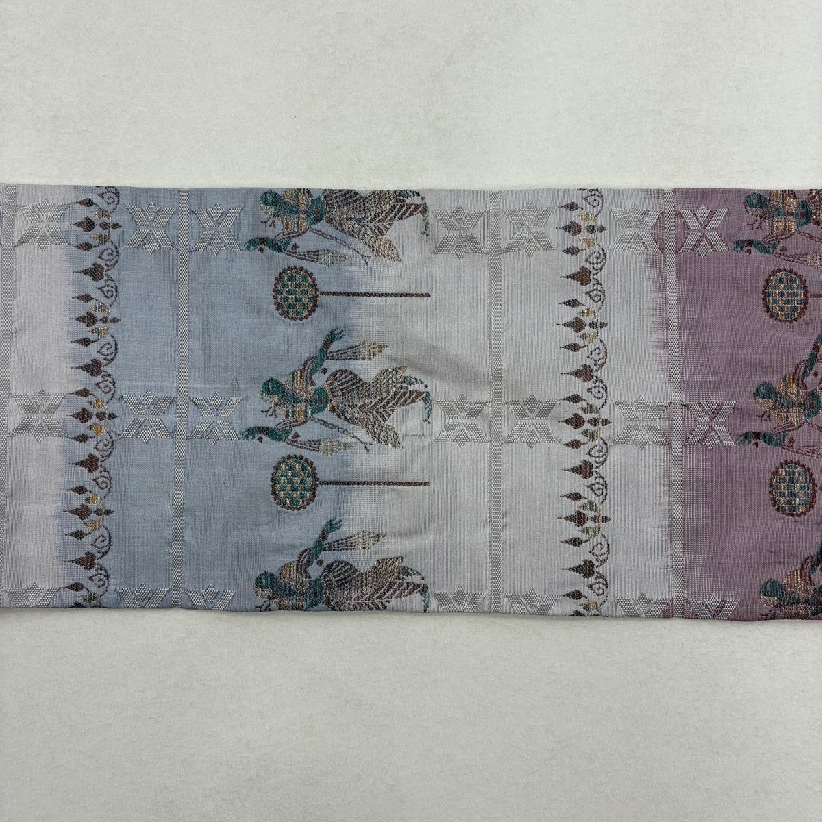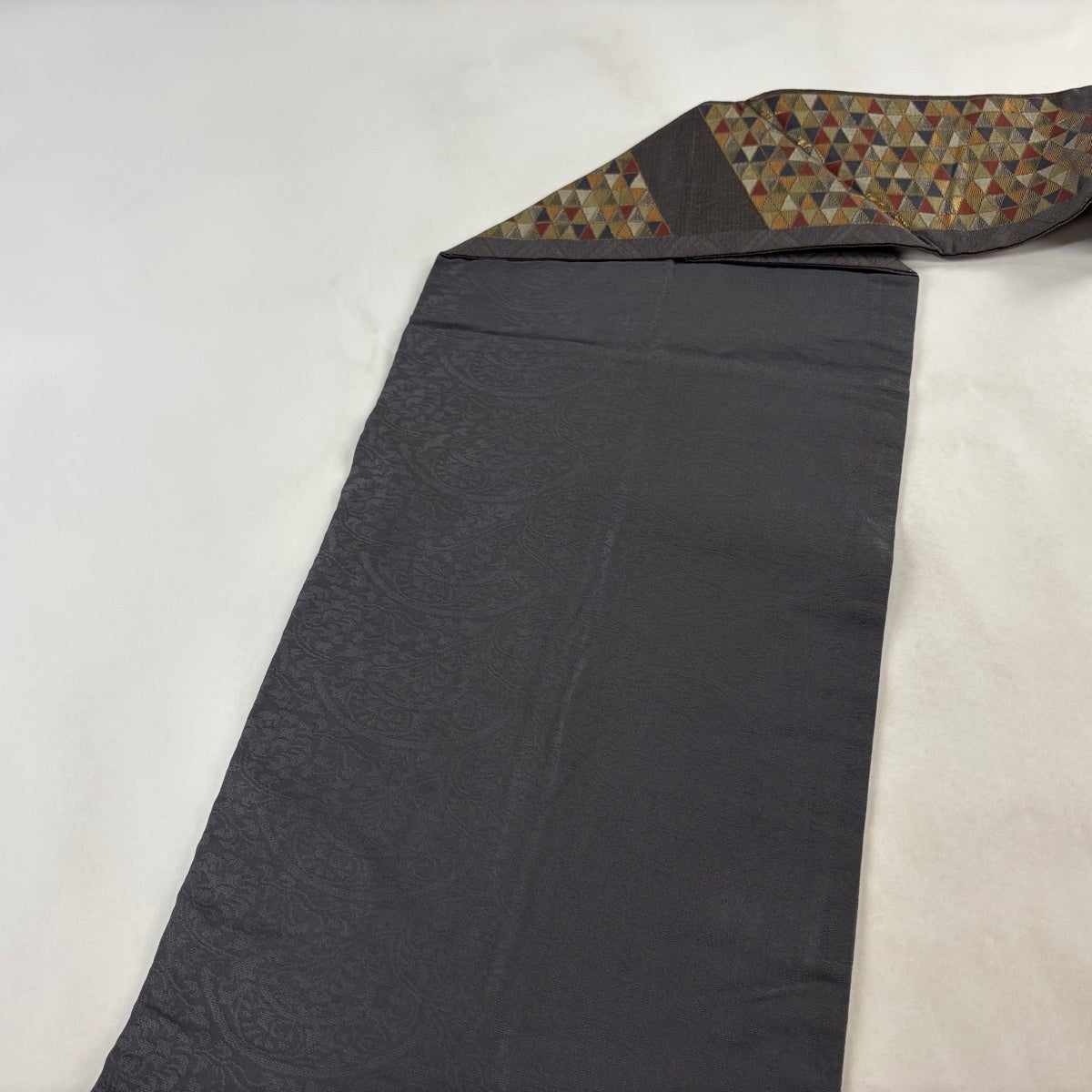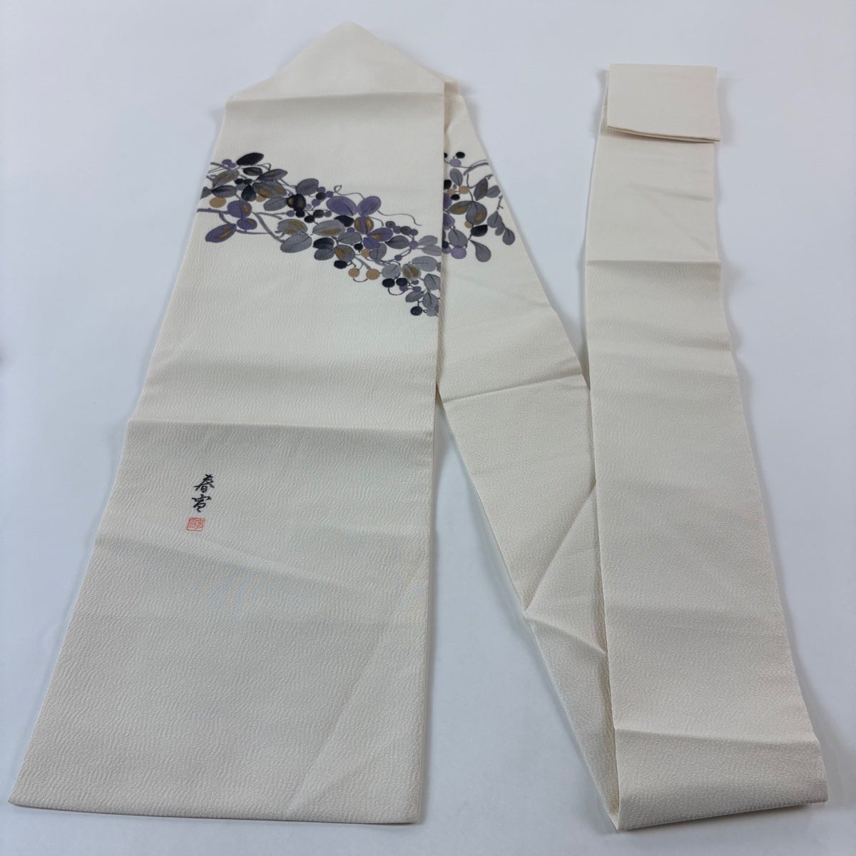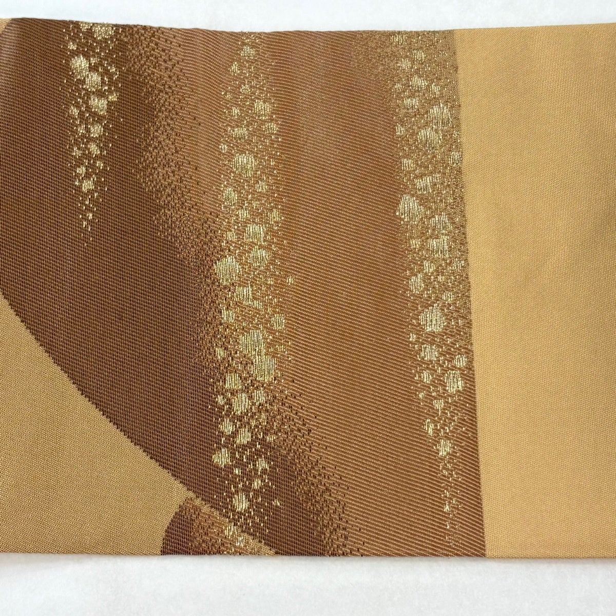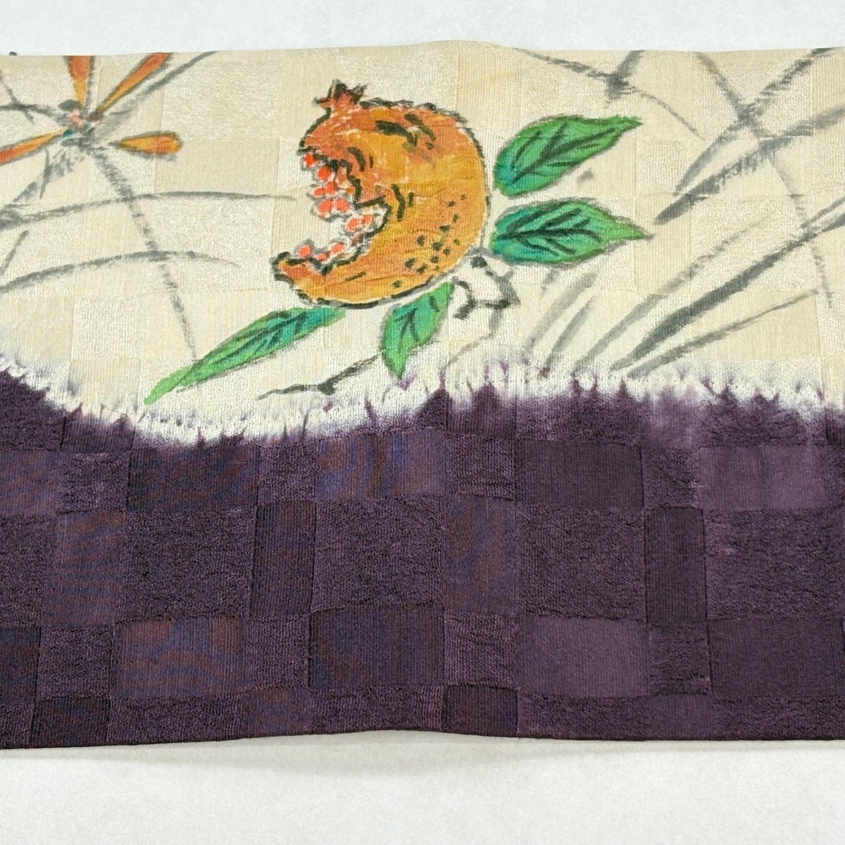 帯の格は着物とは逆で染よりも織のほうが格式が高く、名古屋帯は袋帯よりも格が低く様々な技法や生地で作成されているため組み合わせ数も多く場面によって使い分けることでセミフォーマルからカジュアルまで幅広く着用する事ができる帯です。 名古屋帯の名前の由来は名古屋の女学校の先生が考案したと言われるため名古屋帯という名前で呼ばれるようになりました。 形状はお太鼓部分までは通常の帯幅ですがそれ以降は幅が半分になっていることが多く、袋帯よりも短い作りになっているため一重太鼓でしか結ぶ事ができません。