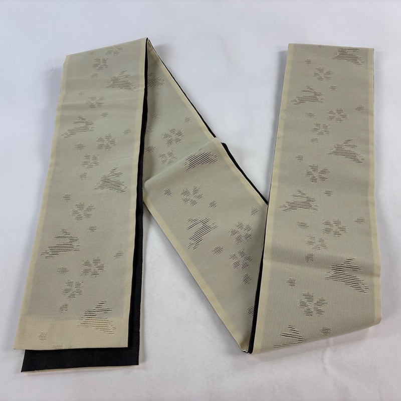 帯の幅が半分で扱いやすい夏帯の半幅帯でございます。 手軽に締められるのが魅力です。 浴衣や買い物などの普段使いのほか、色柄によってはお出かけや気軽なパーティにもご使用いただけます。 帯結びも色々ありますので可愛らしい装いから粋なスタイルまでお楽しみいただけます。 締め跡がございますが、目立ったシミ汚れは無くリユース品としては状態の良いお品でございます。 沢山の商品の中からご覧いただき誠にありがとうございます。