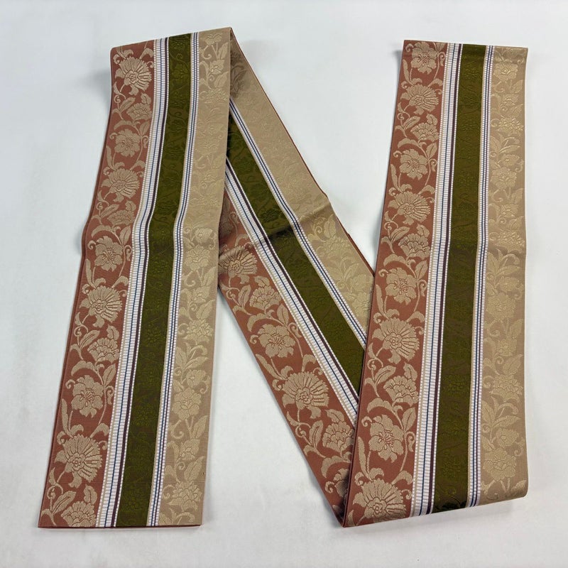博多織の半幅帯でございます。 締めた時にきゅっと絹鳴りのする博多帯。 初心者から上級者まで、定番の人気があります。 裏地の所々に生地のヨレがございますが、目立ったシミ汚れは無くリユース品としては状態の良いお品でございます。 沢山の商品の中からご覧いただき誠にありがとうございます。