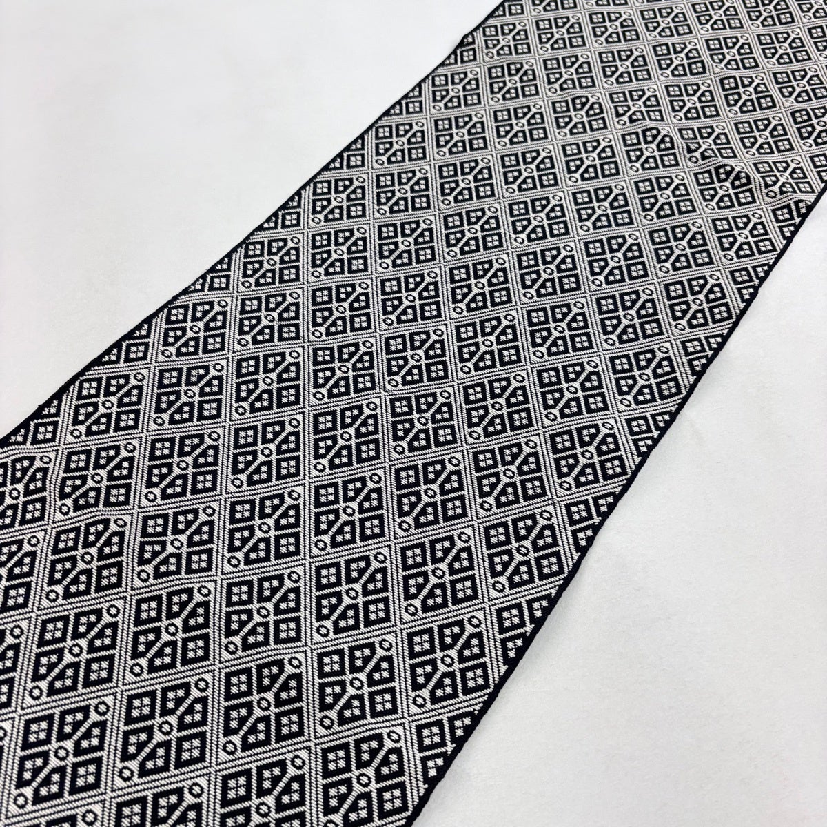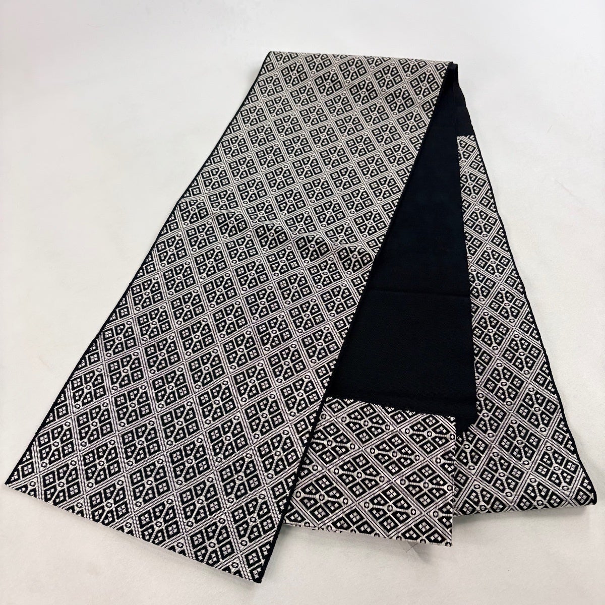【美品】 名古屋帯 逸品 松葉仕立て 八寸名古屋帯 菱 幾何学模様 黒 正絹