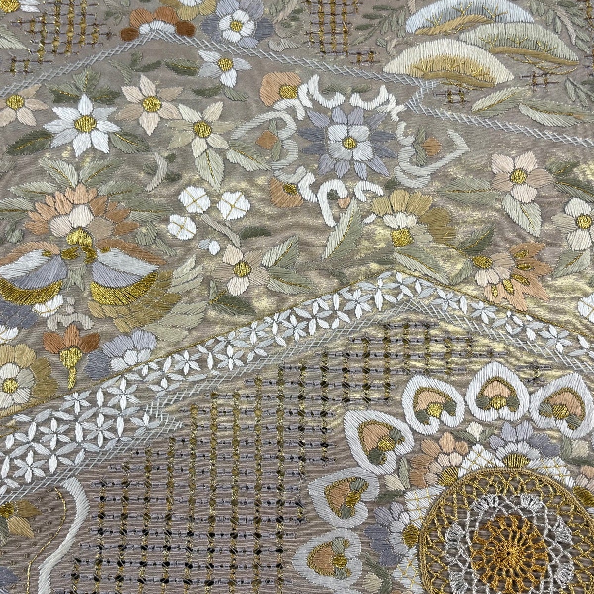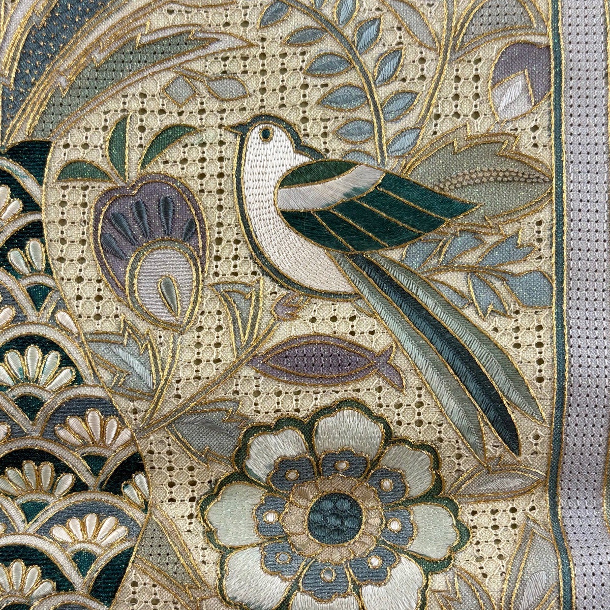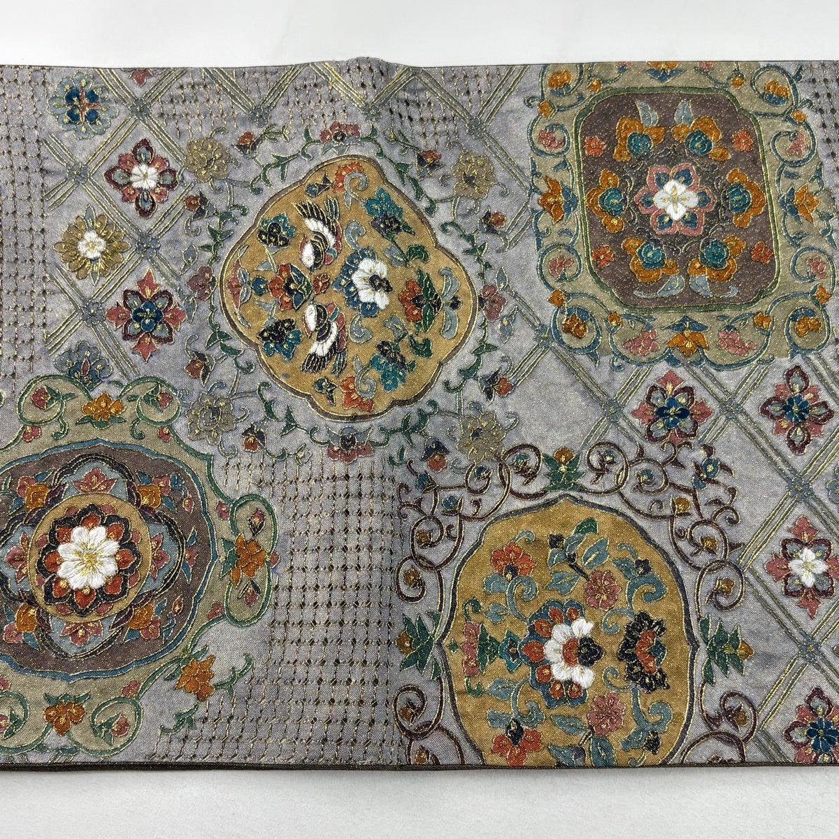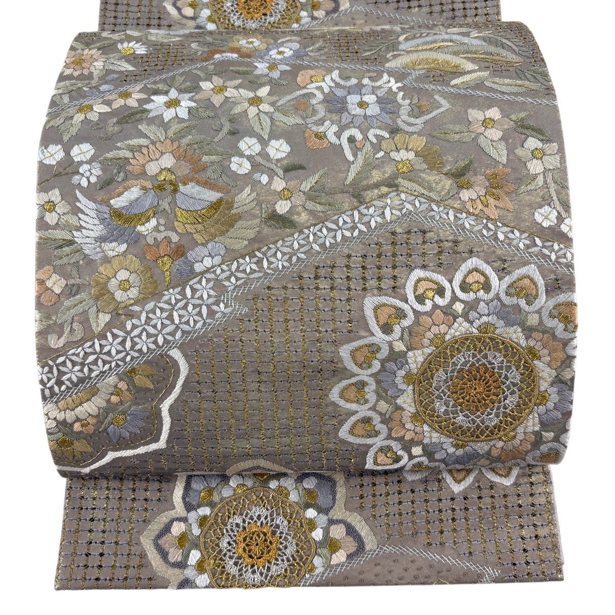 【美品】 袋帯 逸品 華文 花喰い鳥 金糸 相良刺繍 灰茶 お太鼓柄 正絹