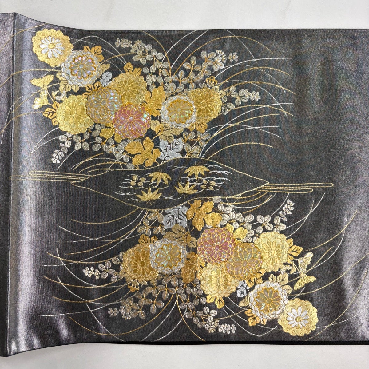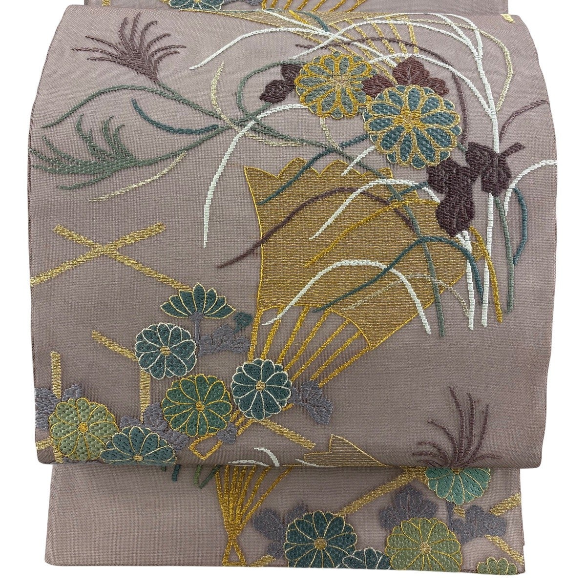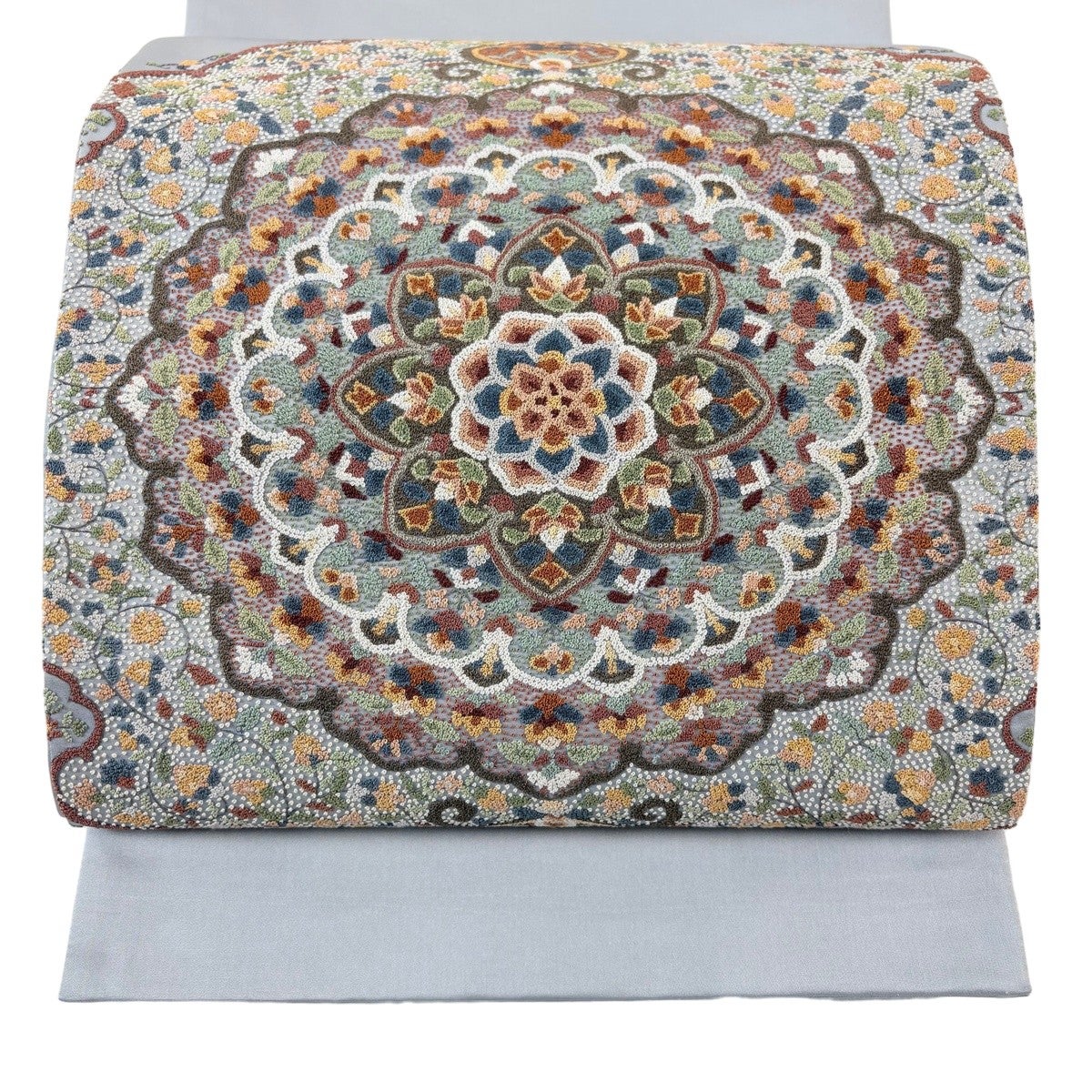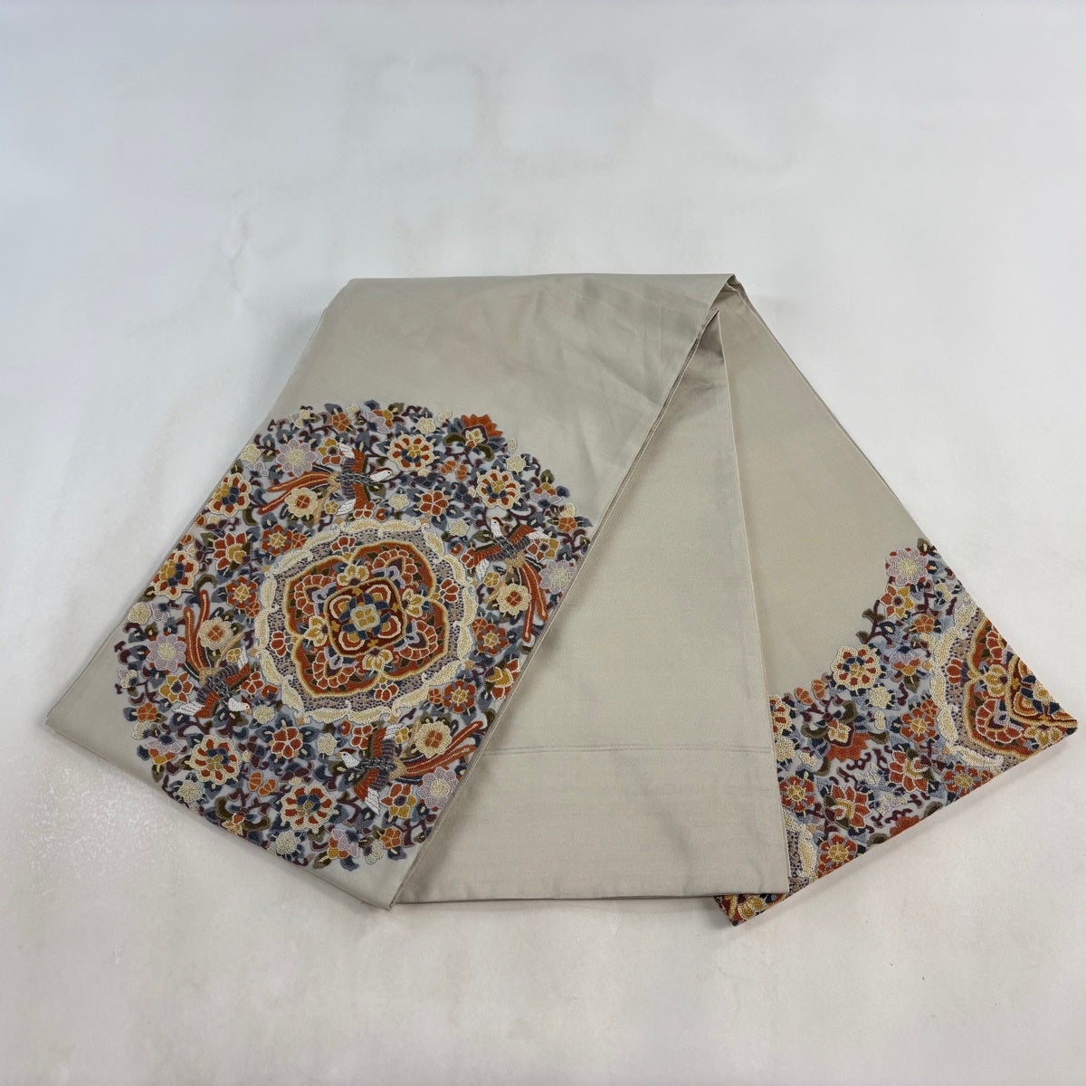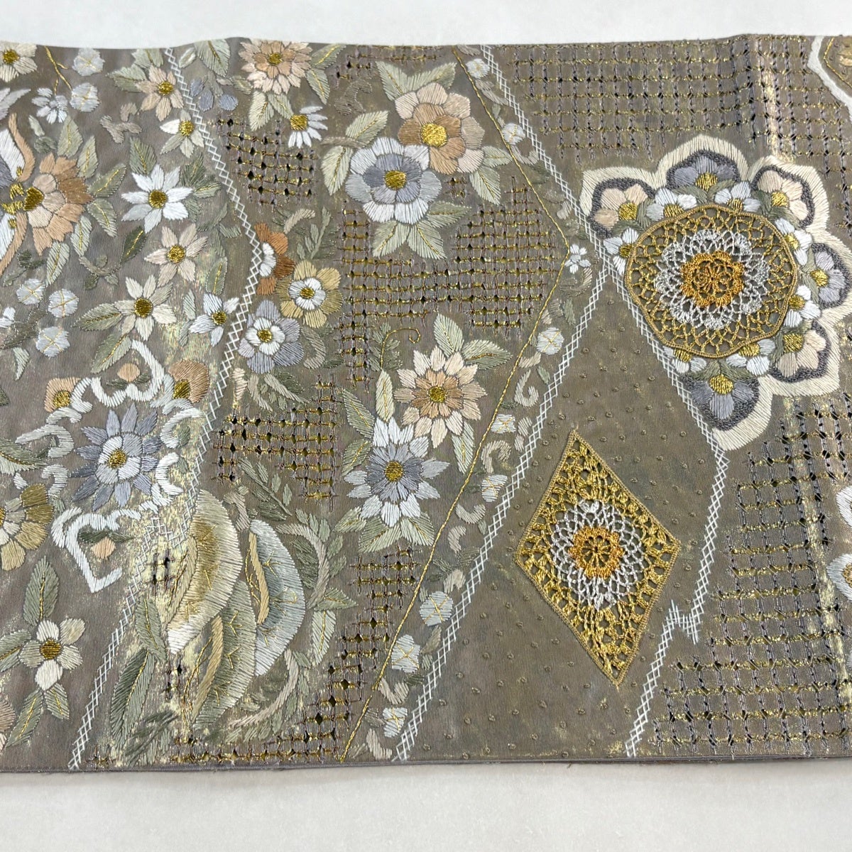 【美品】 袋帯 逸品 華文 花喰い鳥 金糸 相良刺繍 灰茶 お太鼓柄 正絹