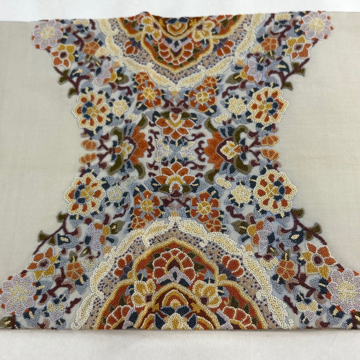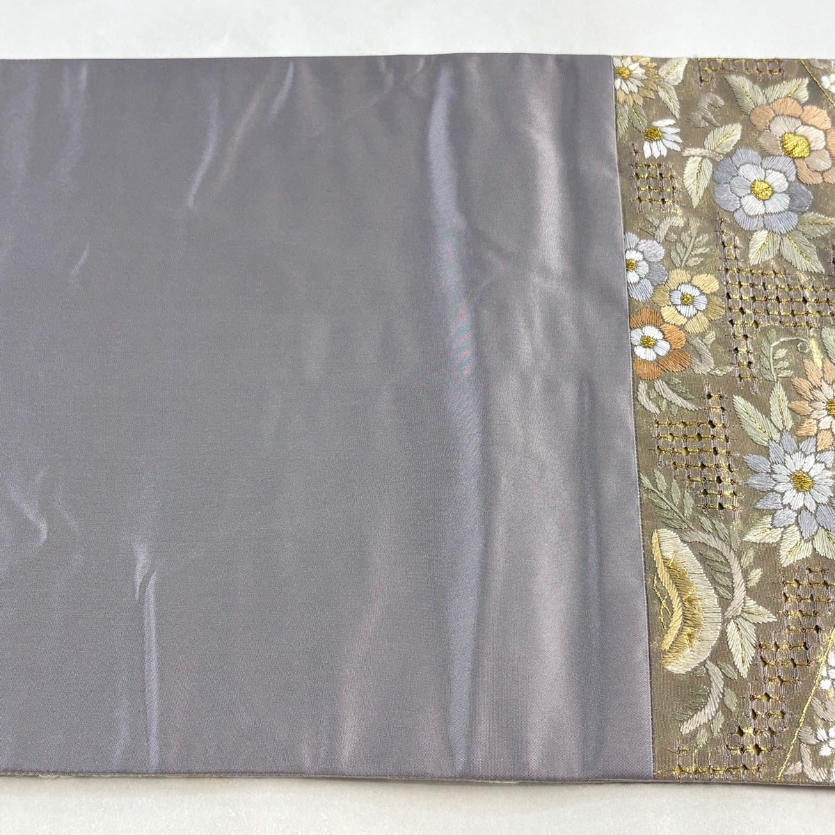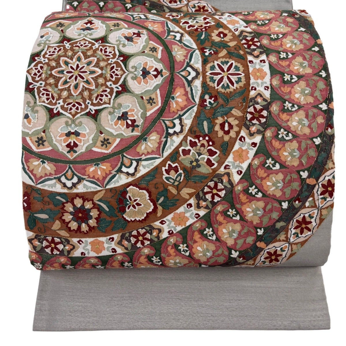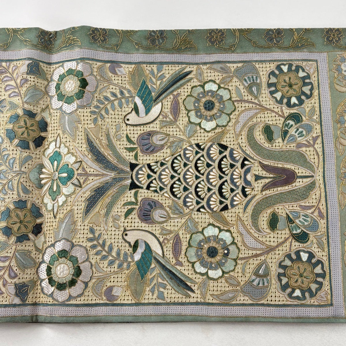 【美品】 袋帯 逸品 華文 花喰い鳥 金糸 相良刺繍 灰茶 お太鼓柄 正絹