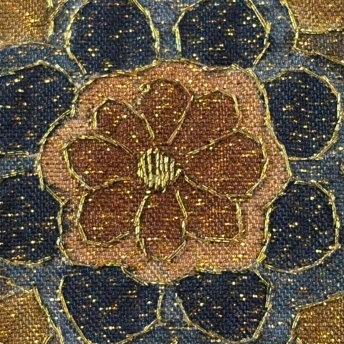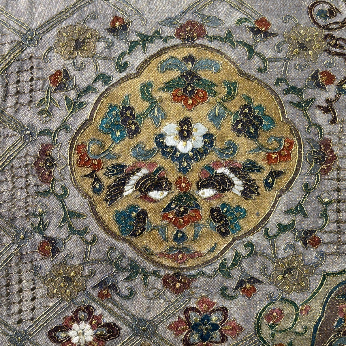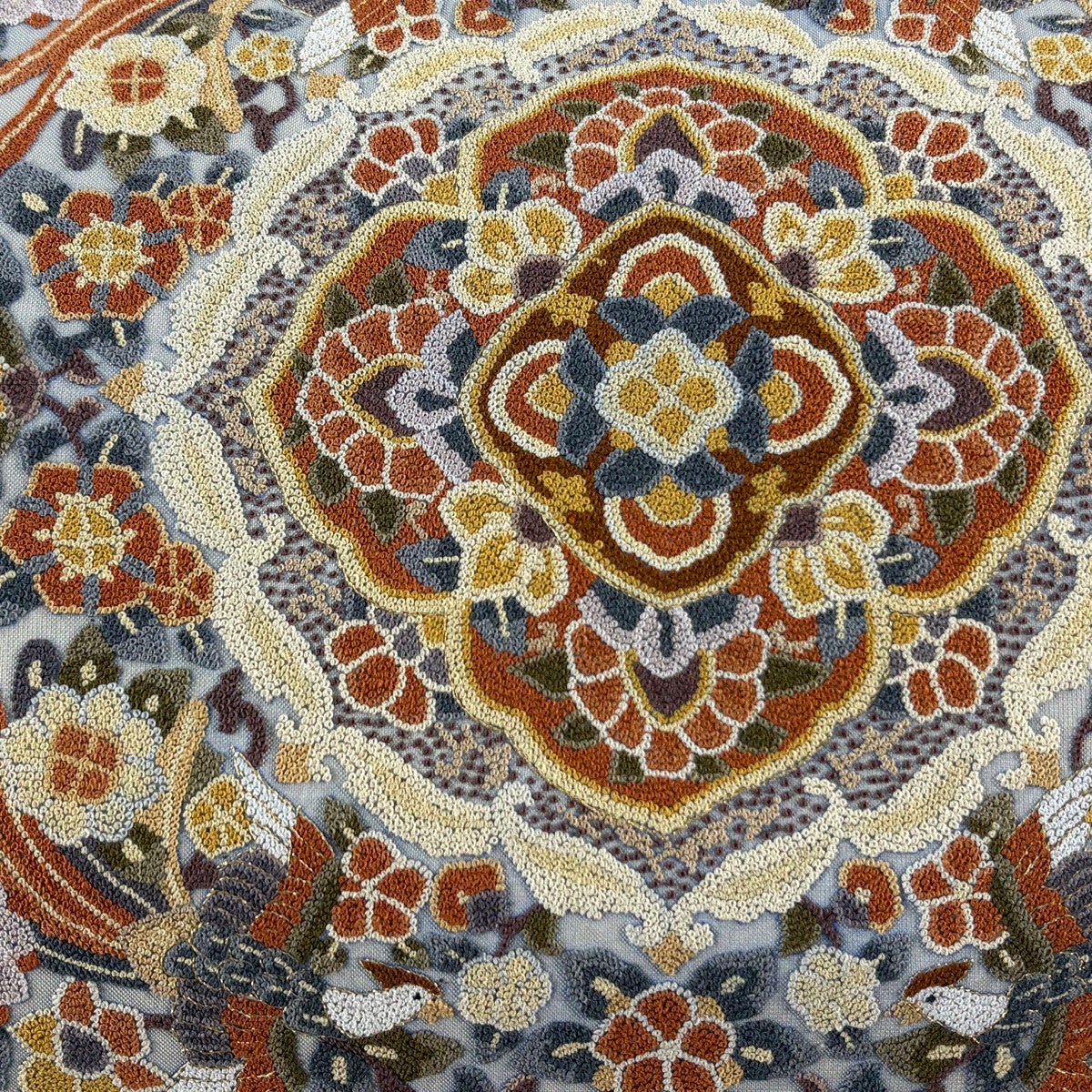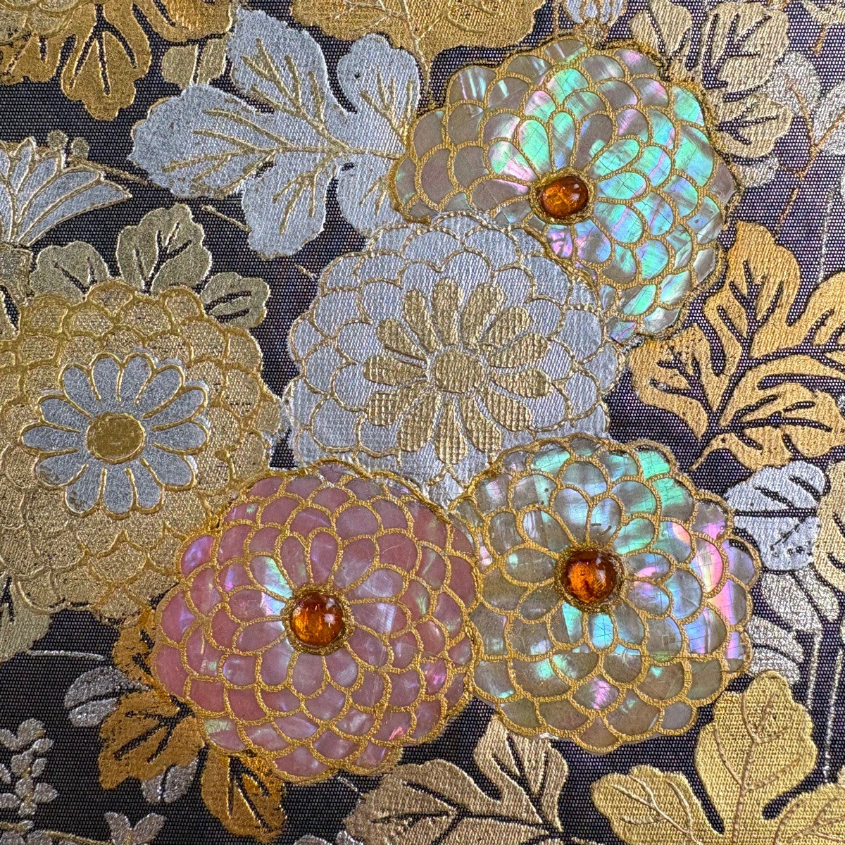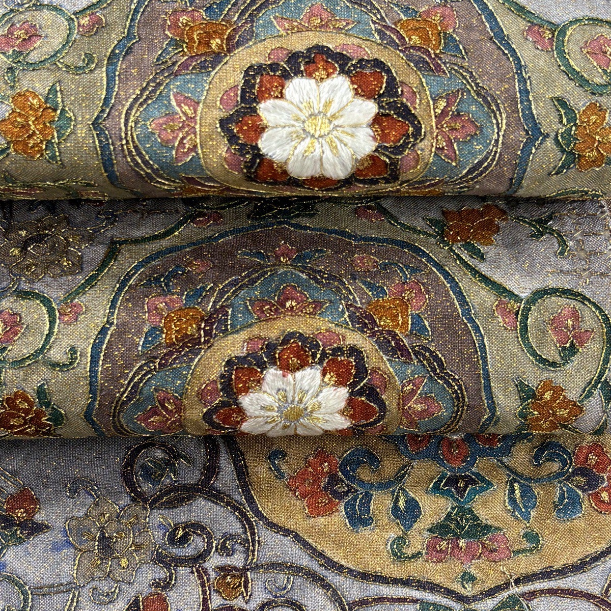 【美品】 袋帯 逸品 華文 花喰い鳥 金糸 相良刺繍 灰茶 お太鼓柄 正絹