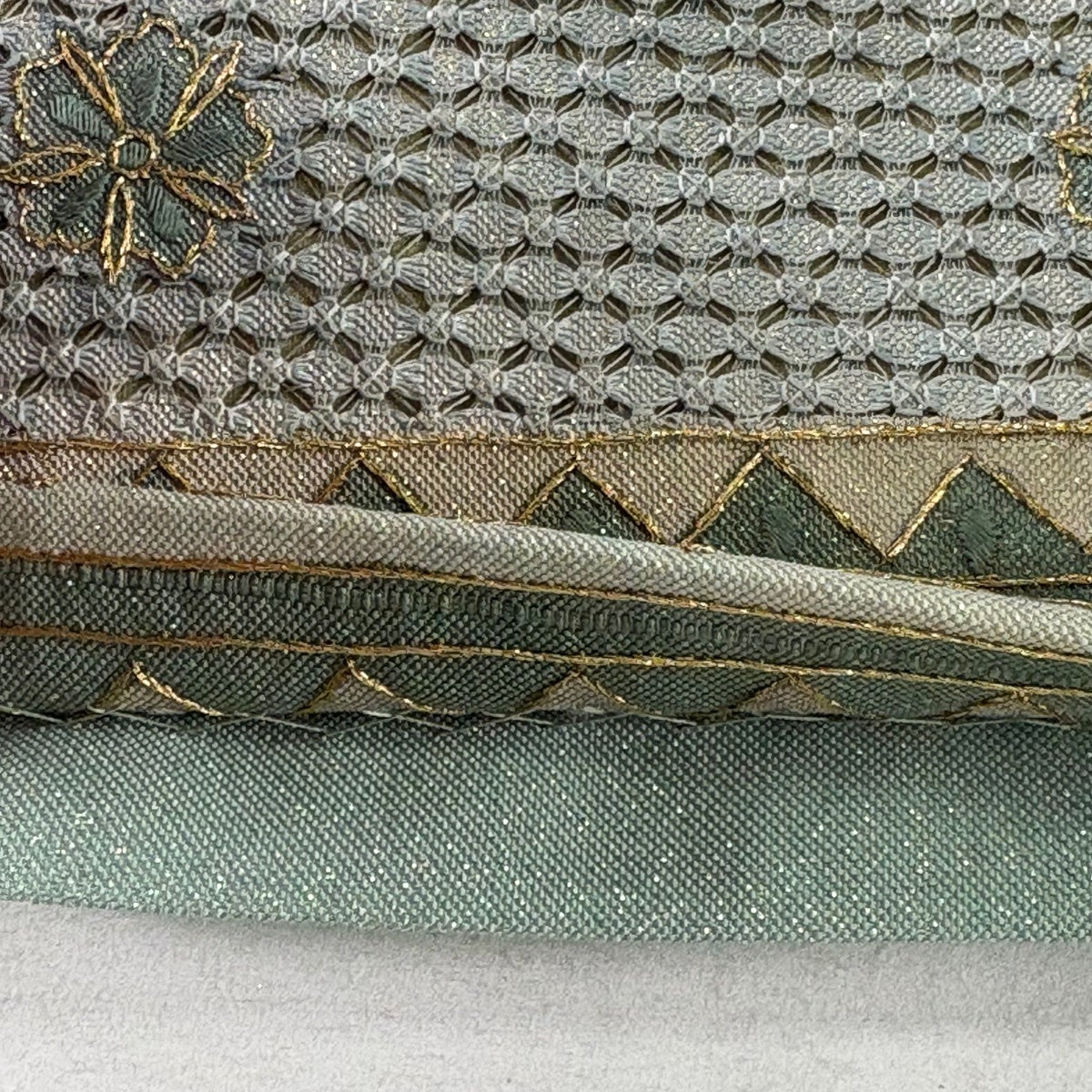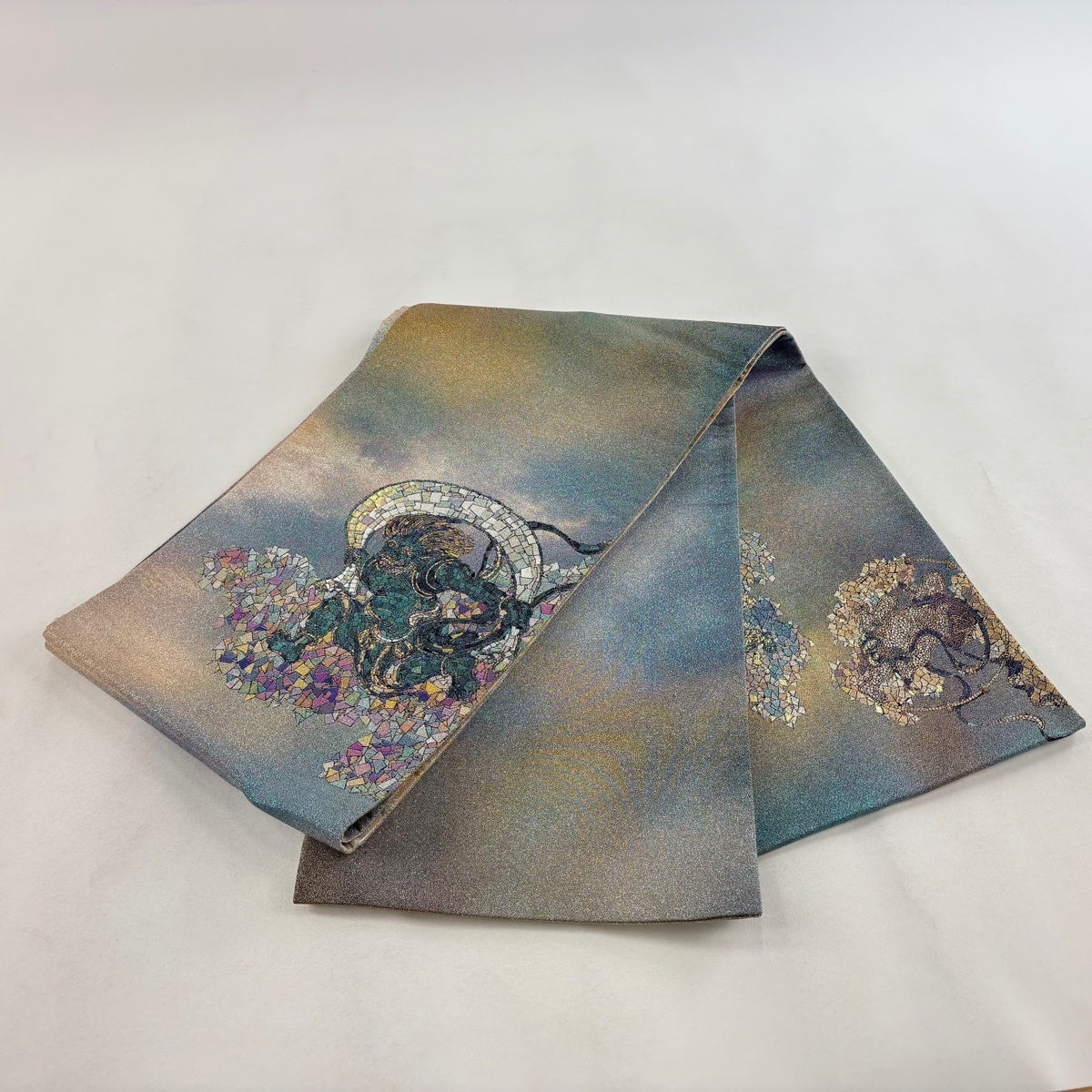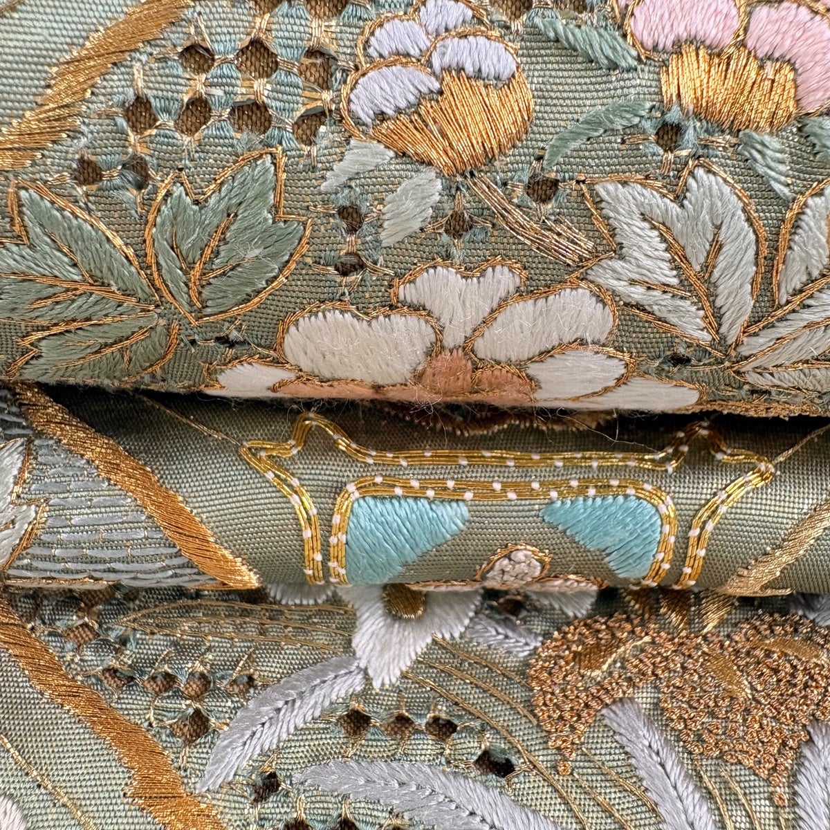 【美品】 袋帯 秀品 紬地 華文 ヱ霞 刺繍 ぼかし 灰緑 お太鼓柄 正絹