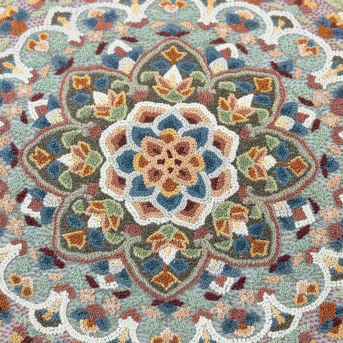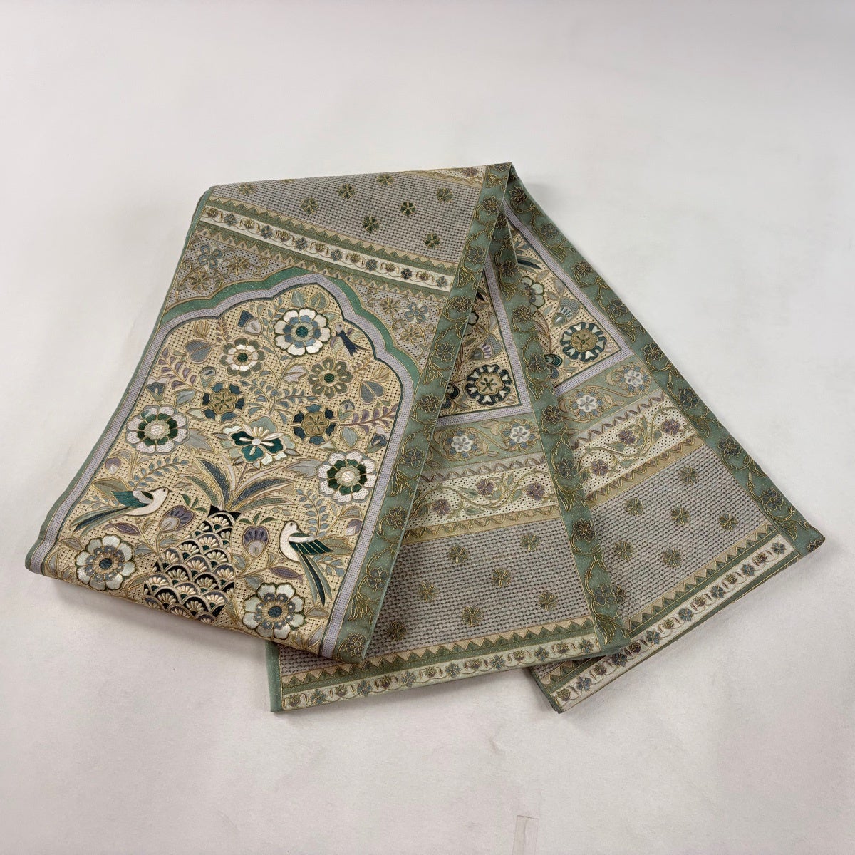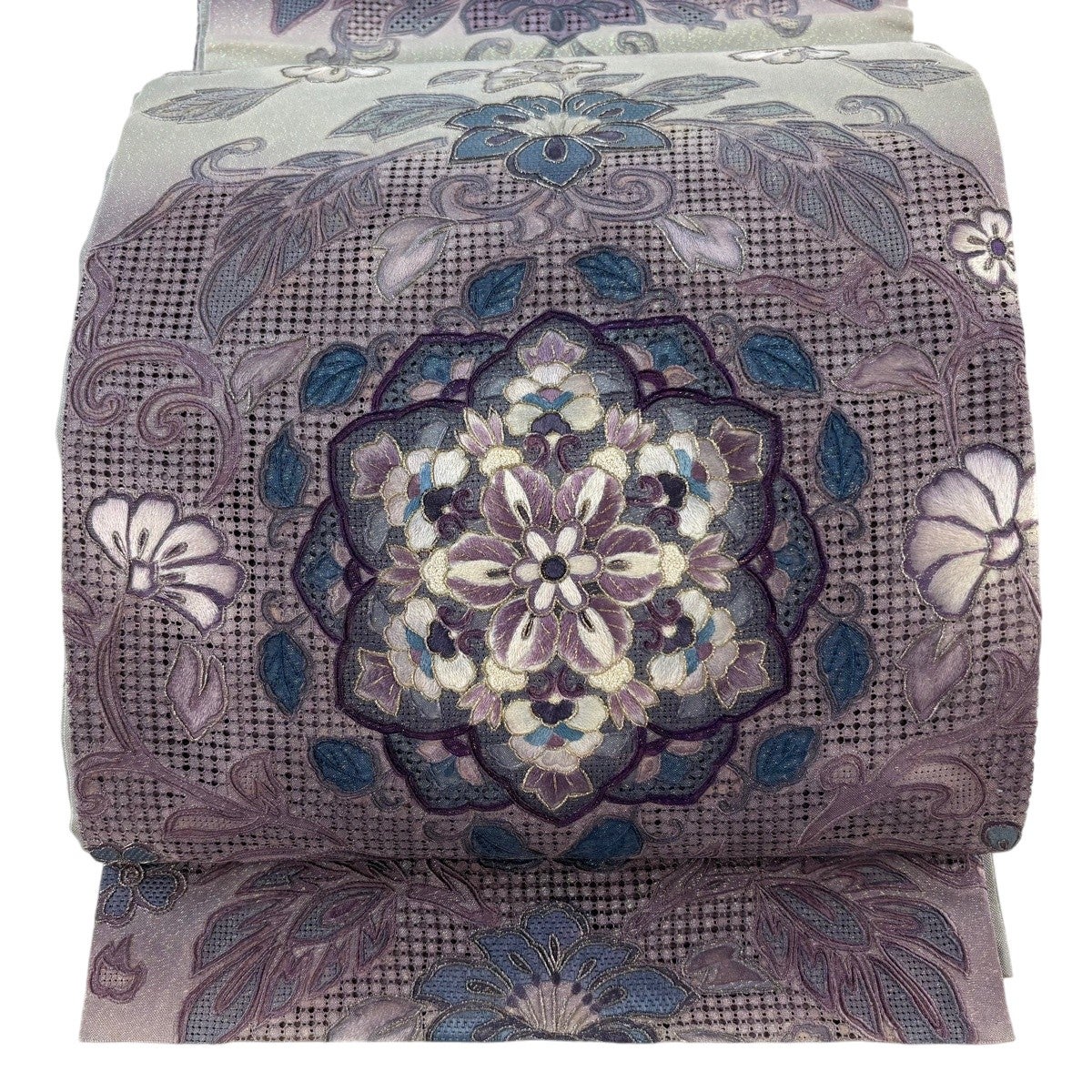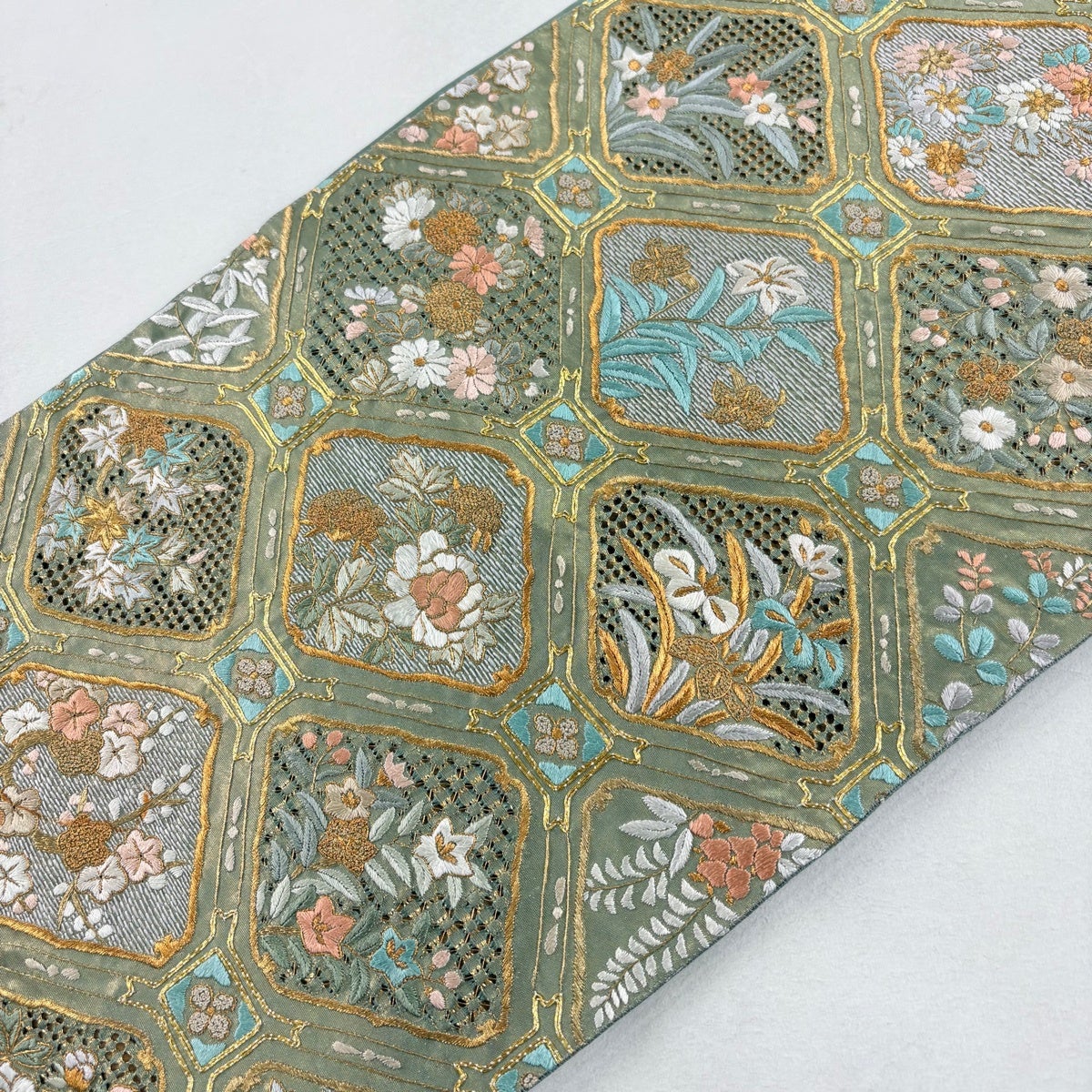 【美品】 袋帯 秀品 紬地 華文 ヱ霞 刺繍 ぼかし 灰緑 お太鼓柄 正絹