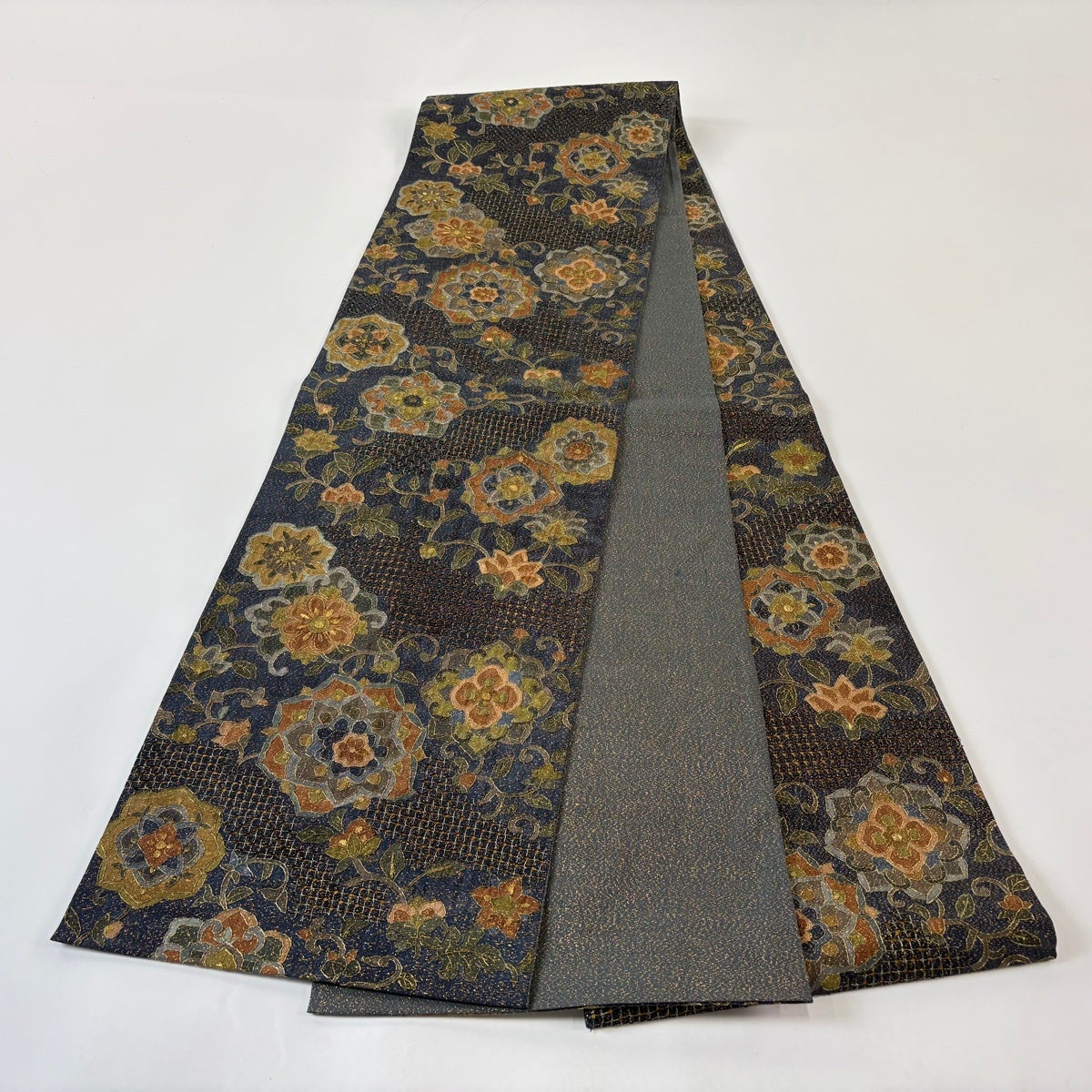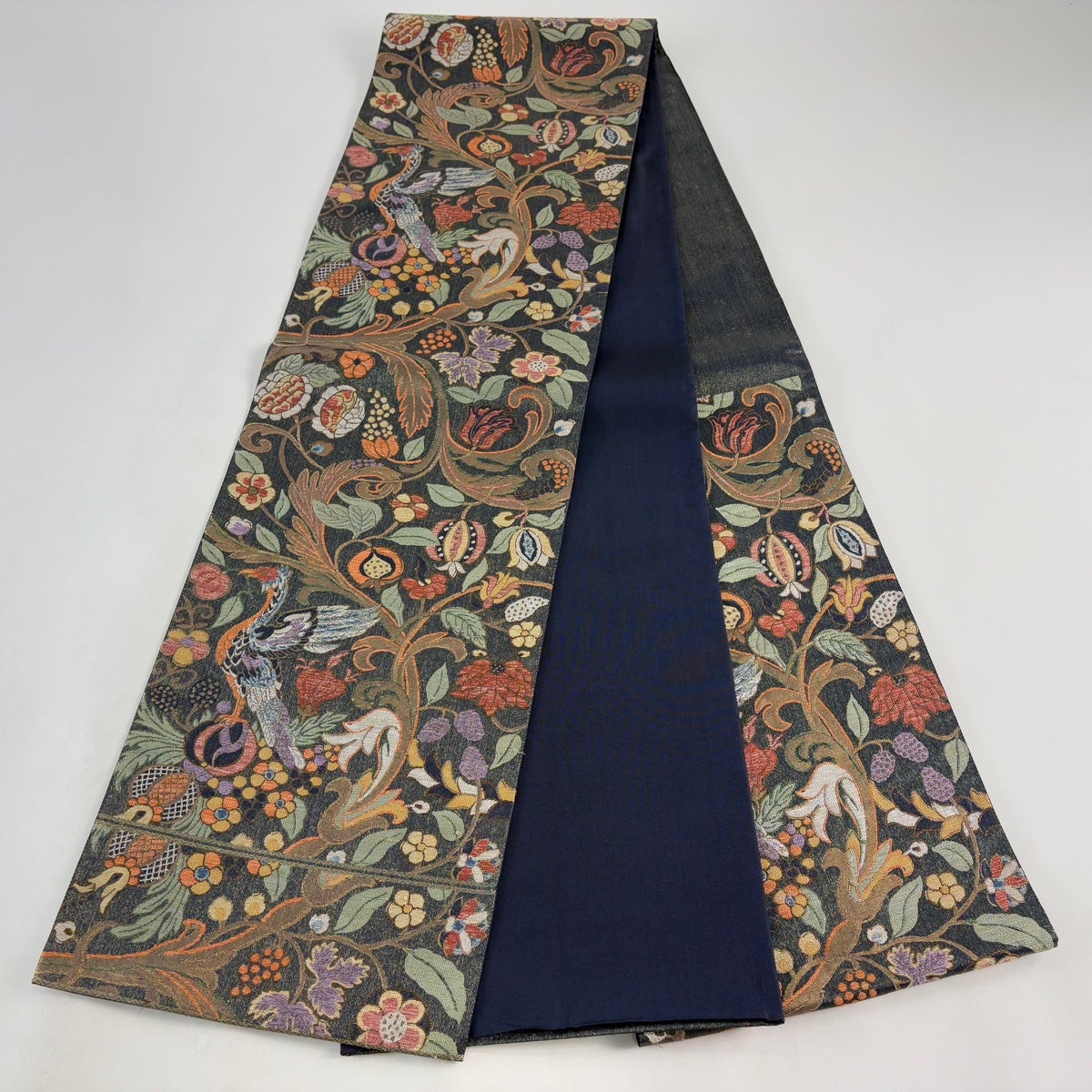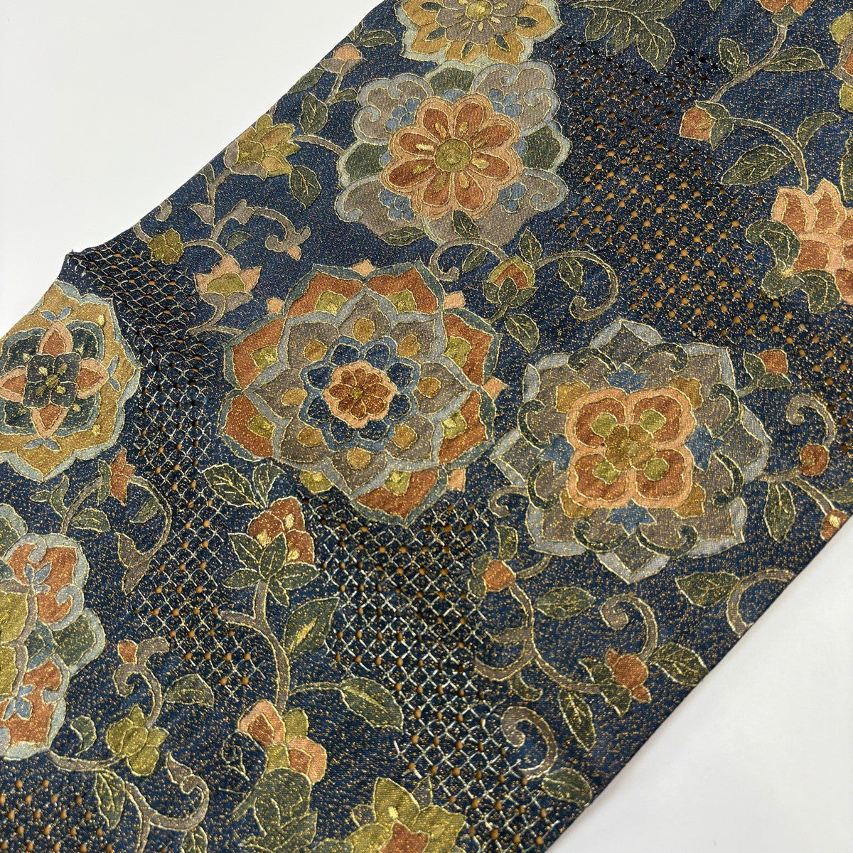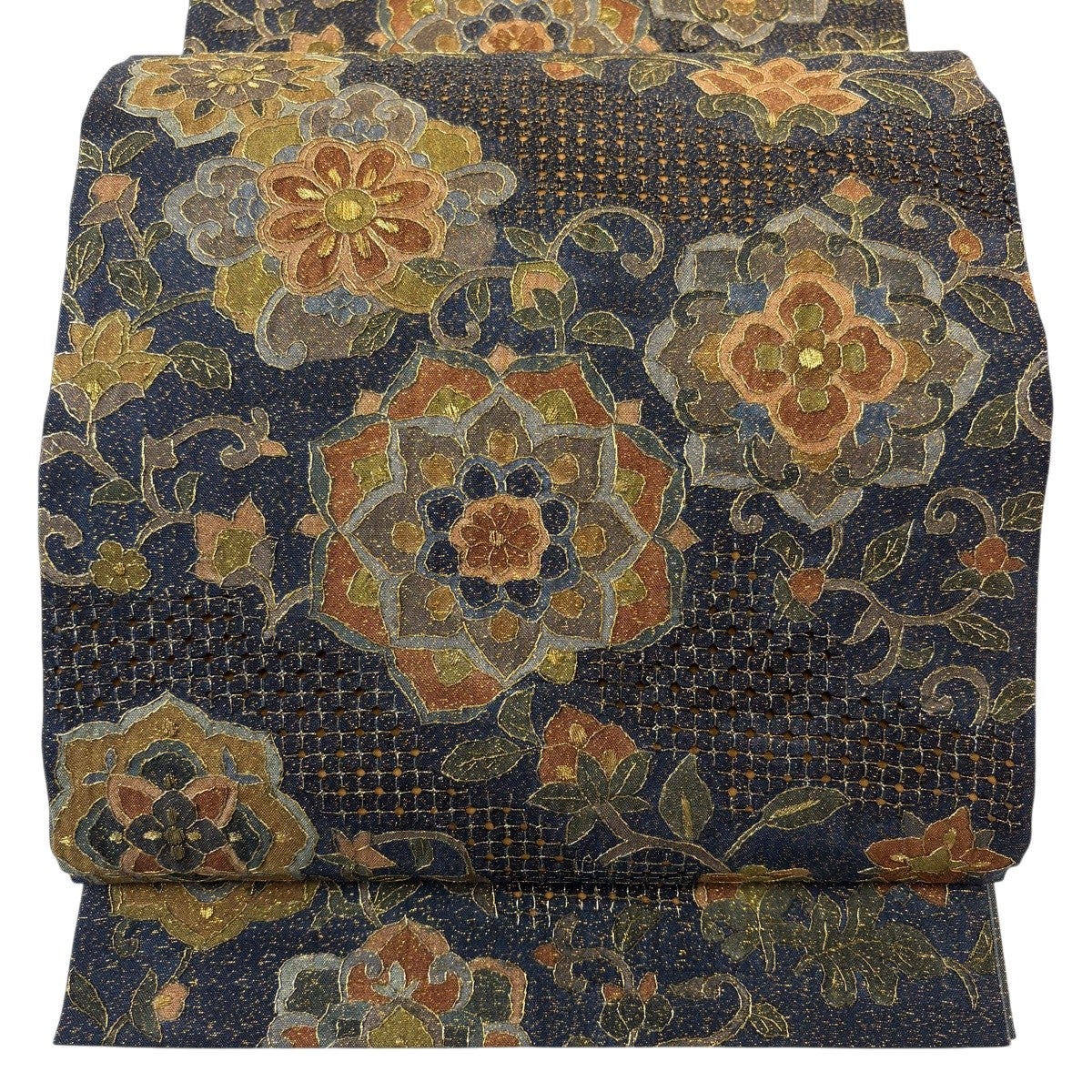 【美品】 袋帯 逸品 華文 華唐草 金糸 金通し 紺色 全通 正絹