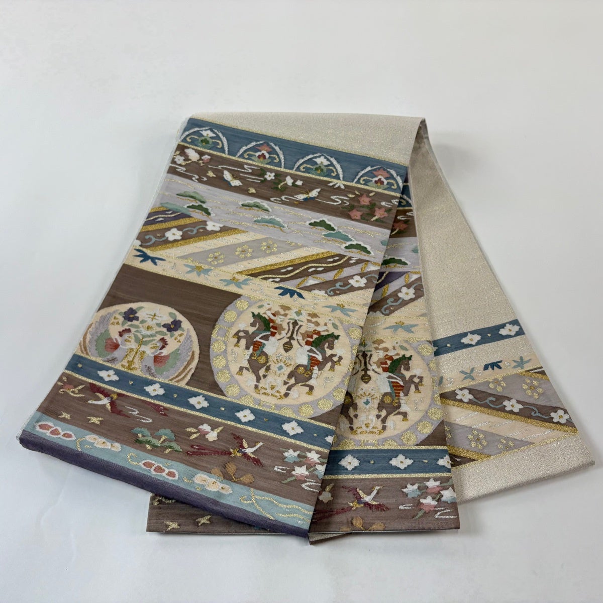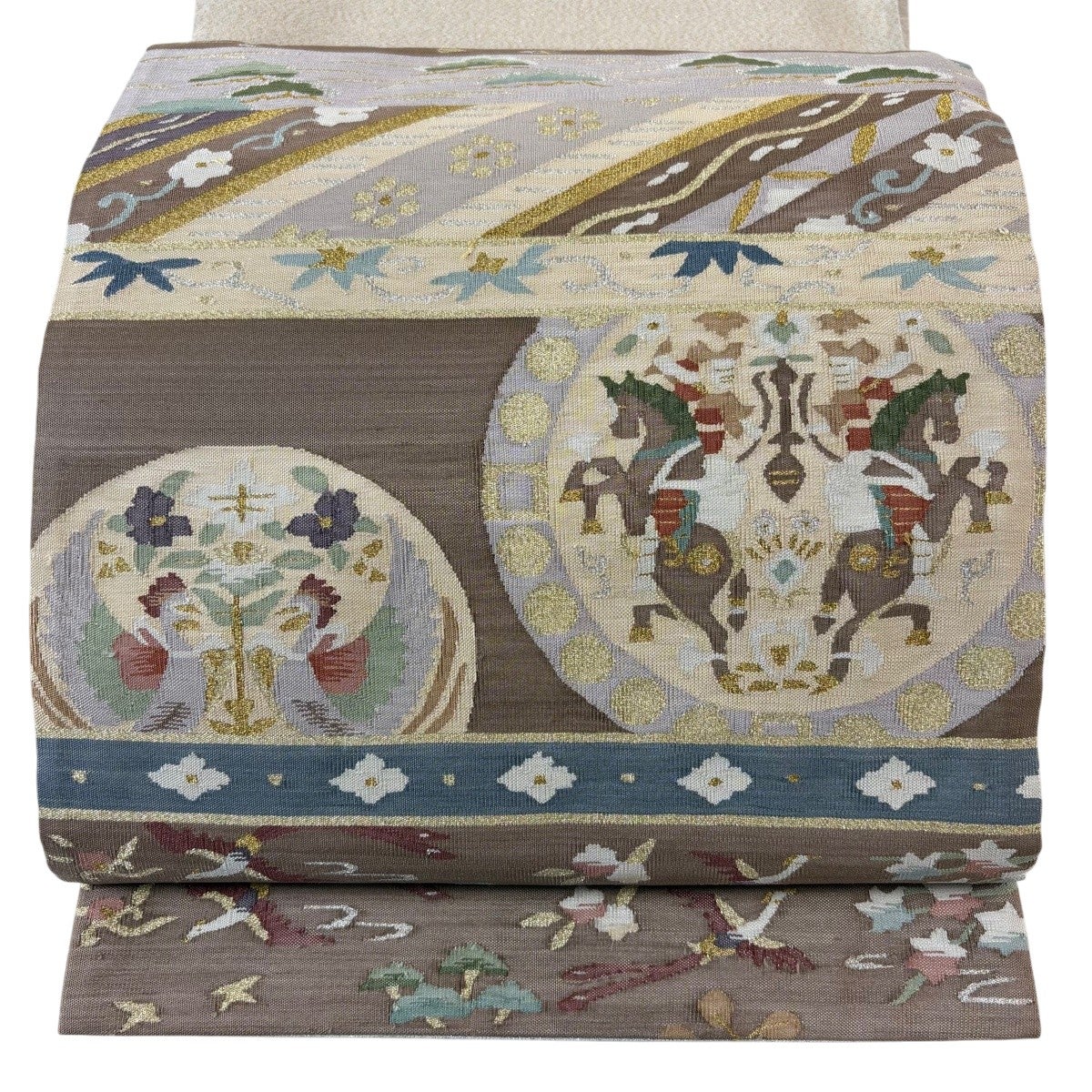 【美品】 袋帯 逸品 狩猟連珠文 花鳥 金銀糸 灰茶 お太鼓柄 正絹