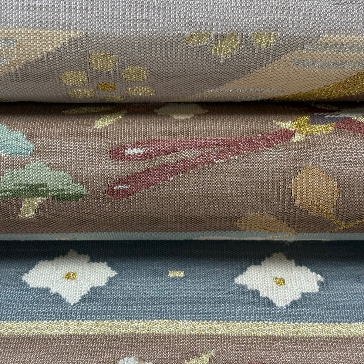 【美品】角帯 秀品 斉藤上太郎 落款 菊 幾何学模様 金銀糸 灰茶 正絹