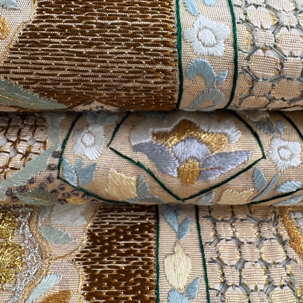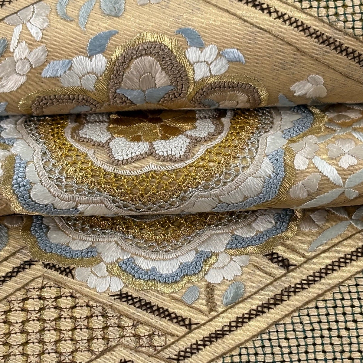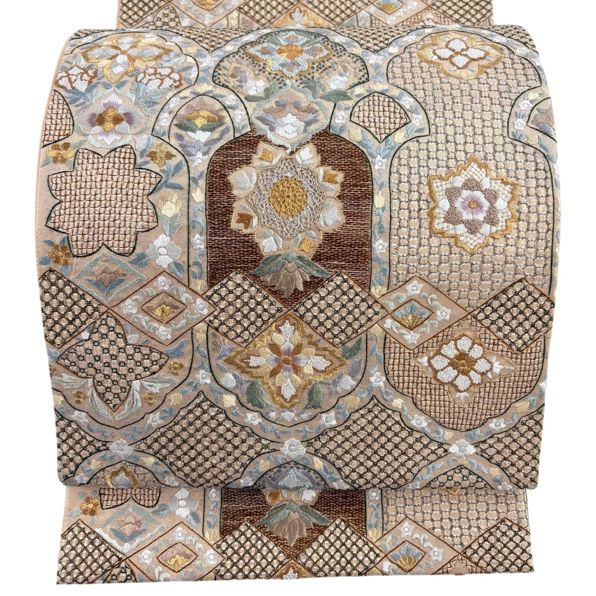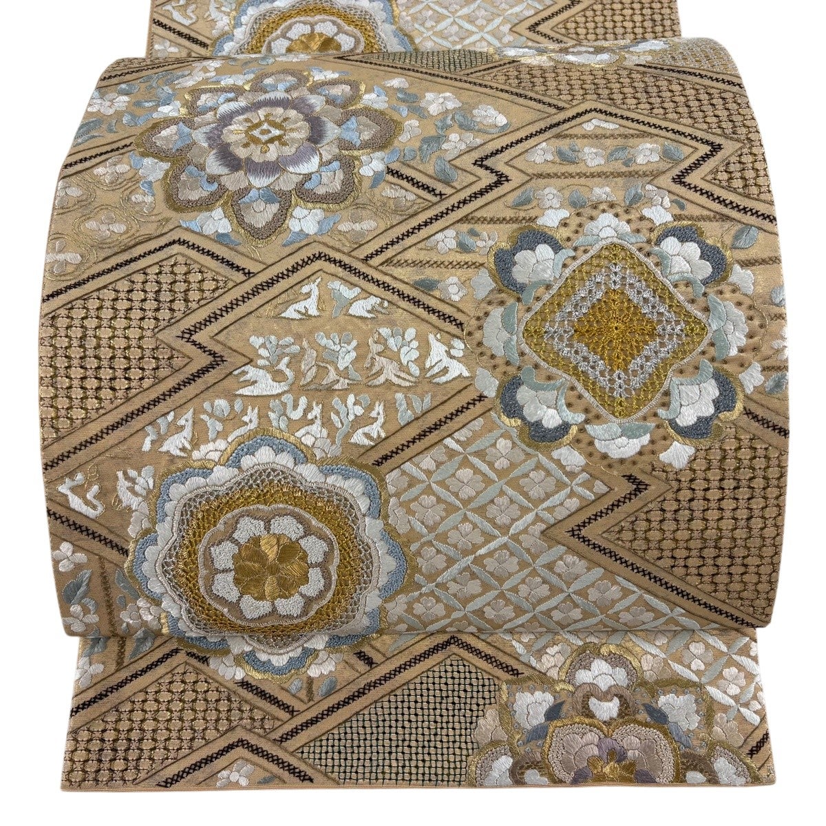 袋帯 逸品 華文 松皮菱 刺繍 金銀糸 ベージュ 六通 正絹