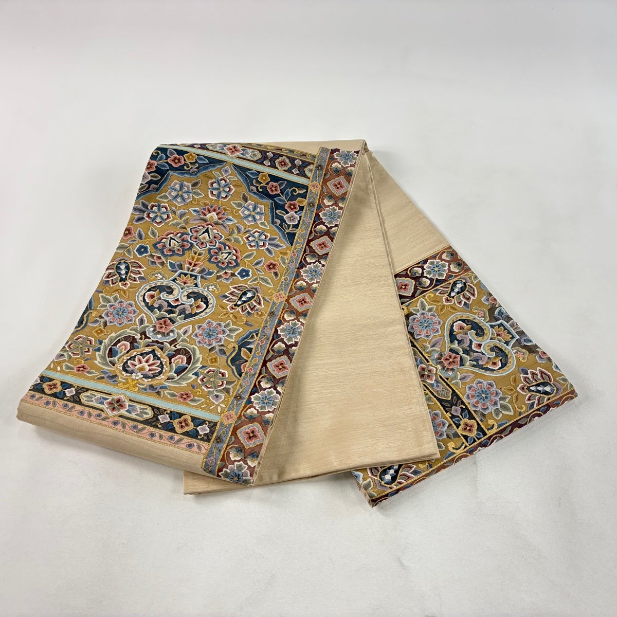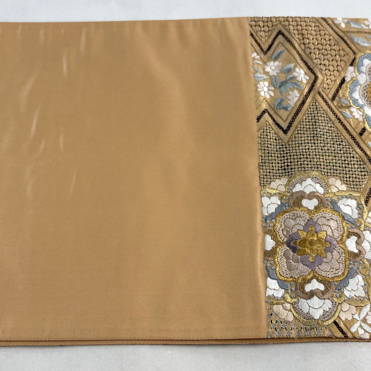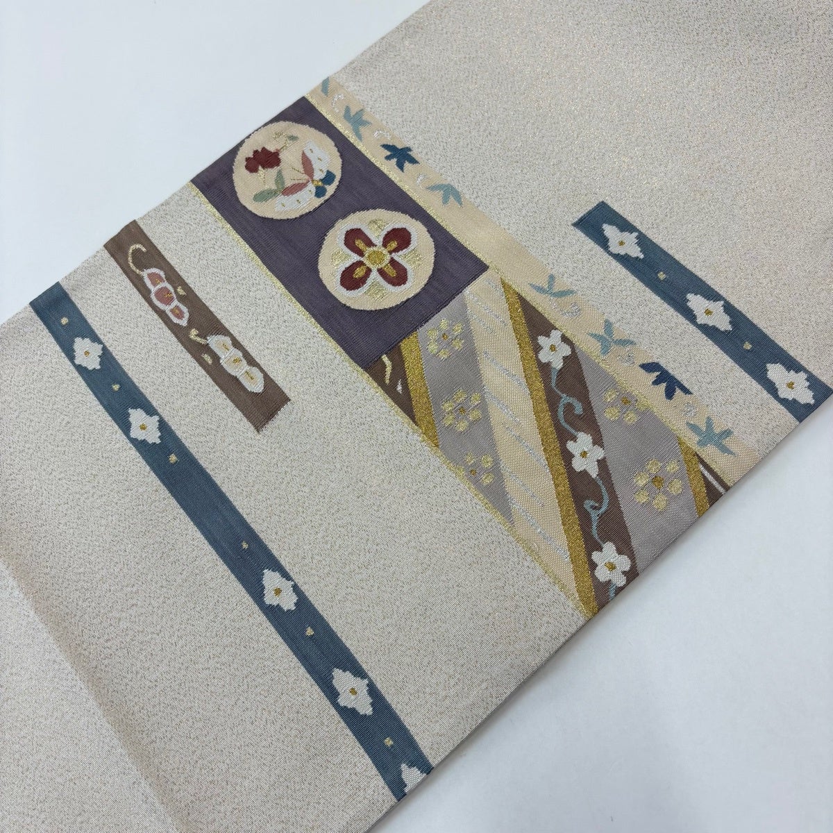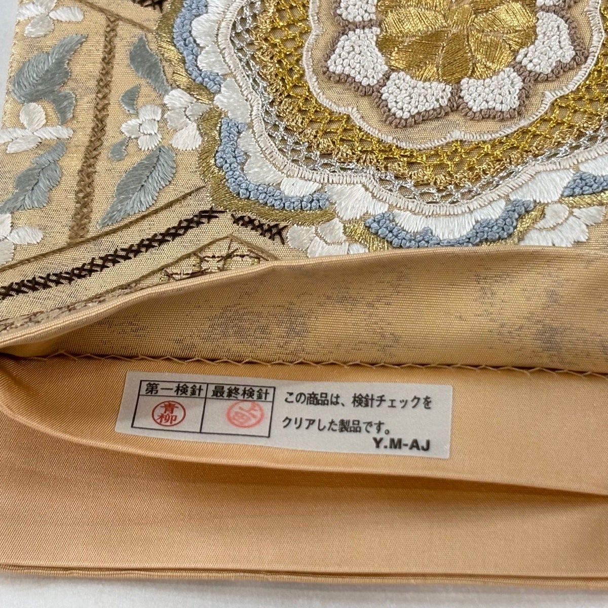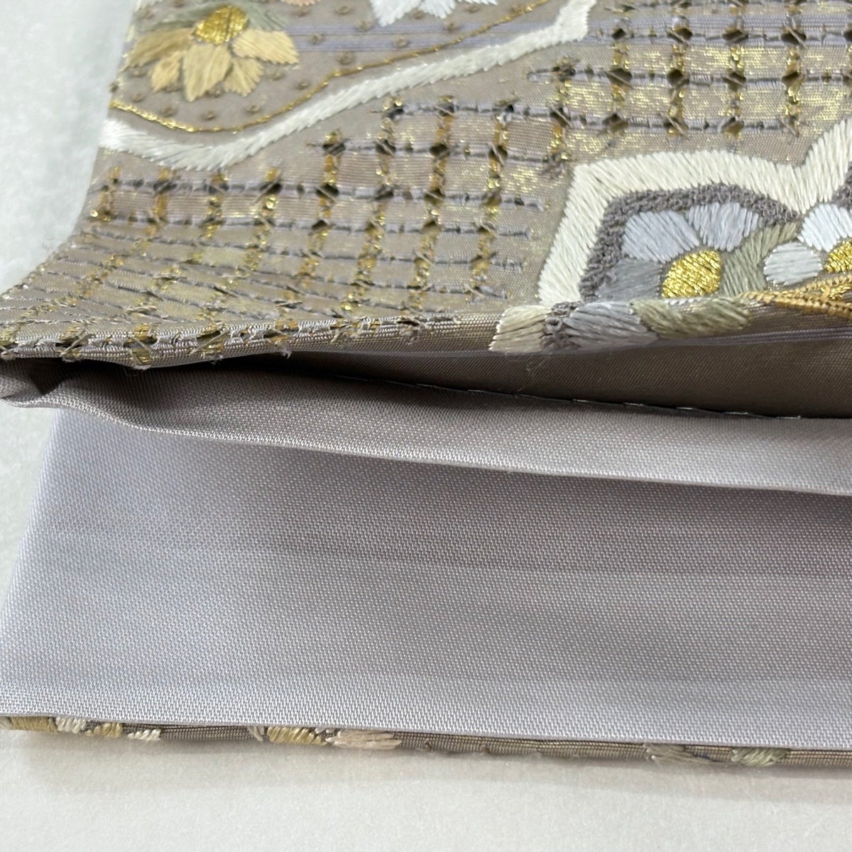 袋帯 逸品 華文 松皮菱 刺繍 金銀糸 ベージュ 六通 正絹