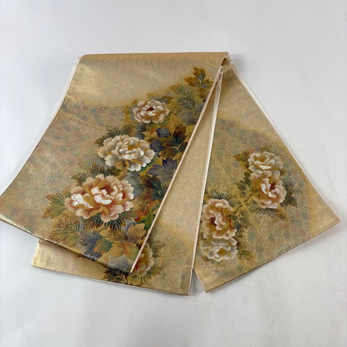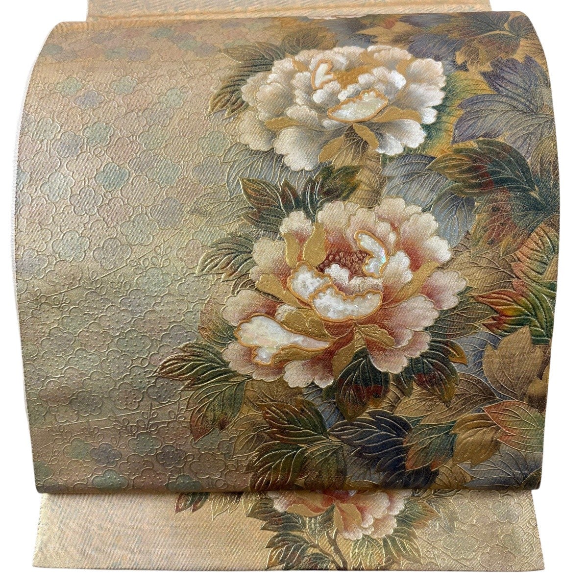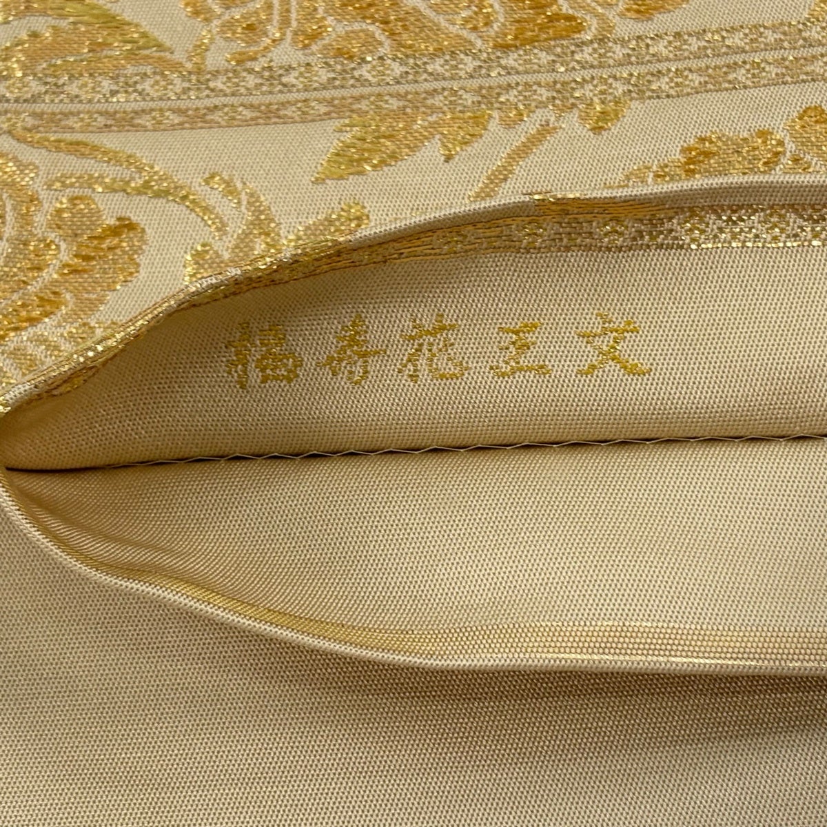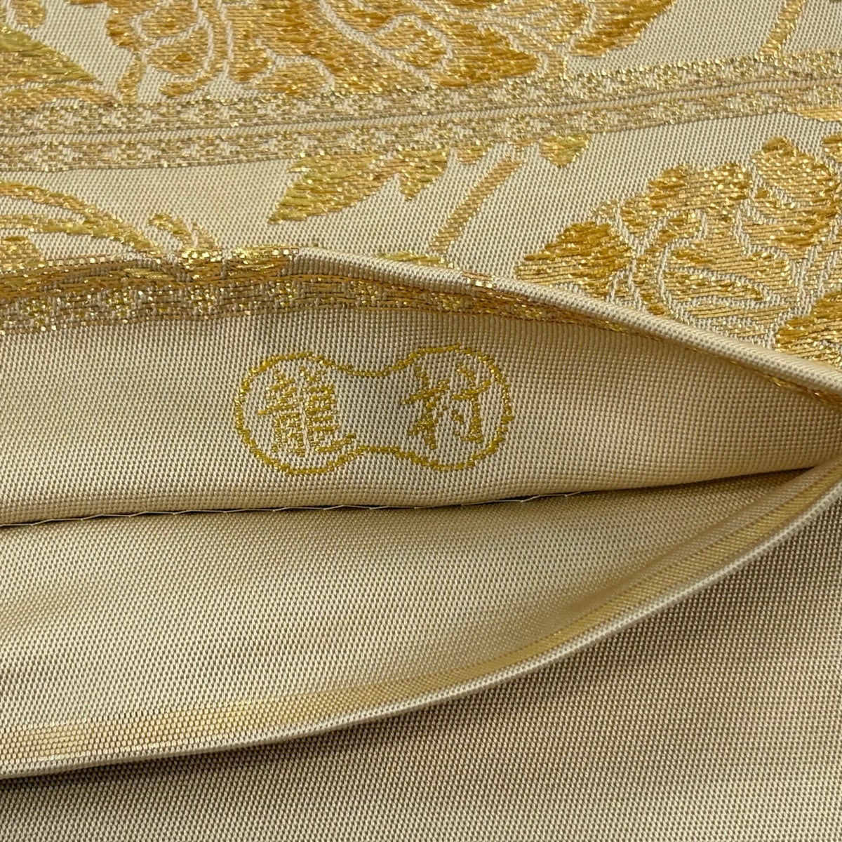 【美品】 袋帯 逸品 龍村美術織物 落款あり 福寿花王文 箔 ベージュ お太鼓柄 正絹