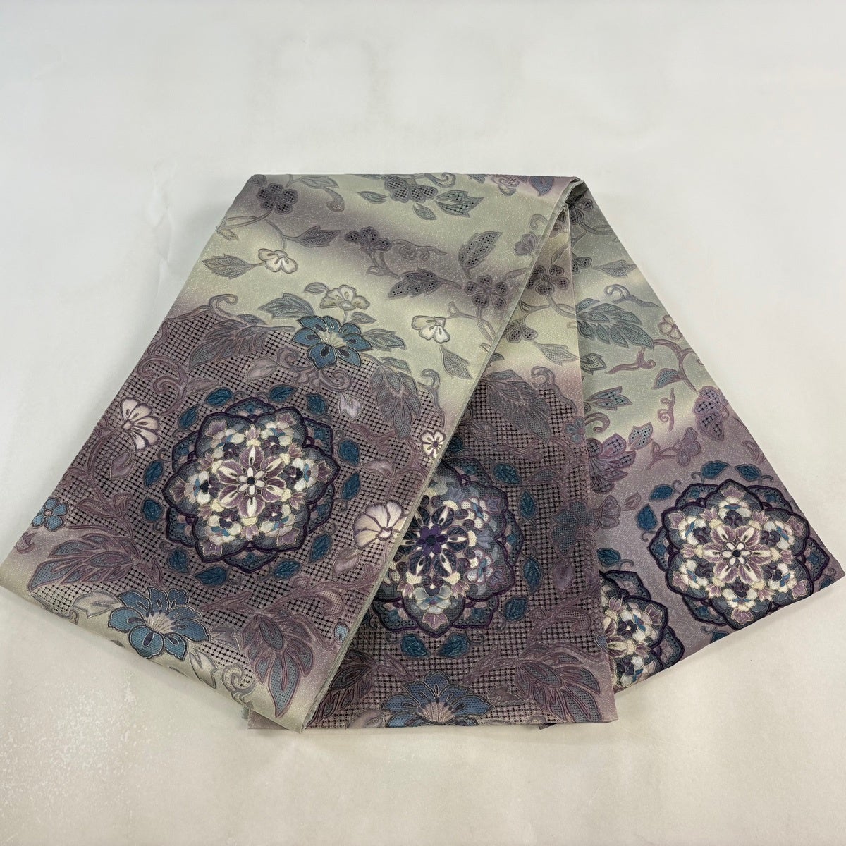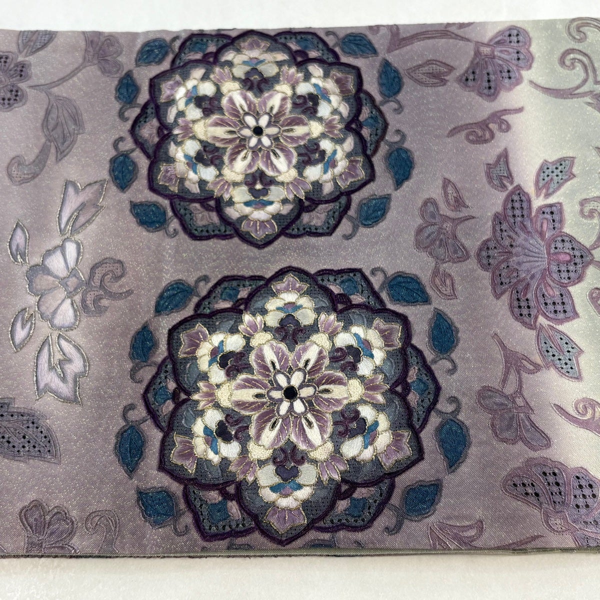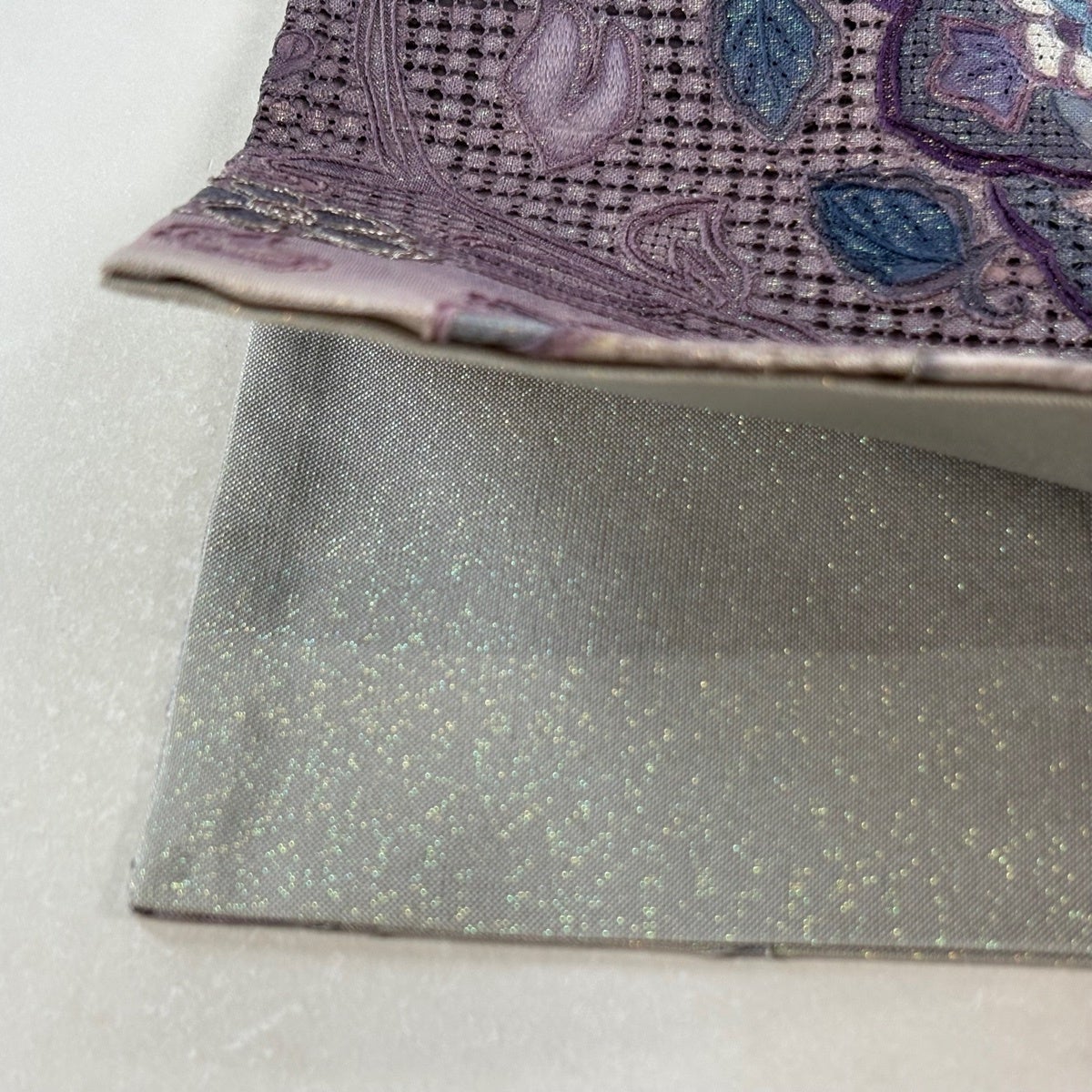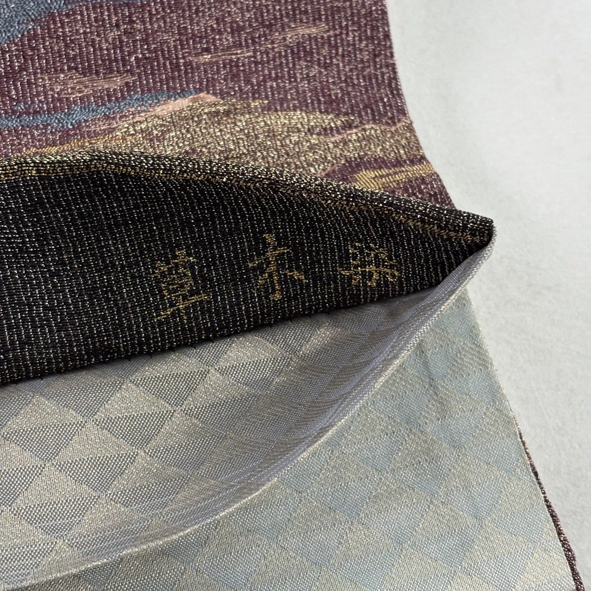名古屋帯 秀品 落款あり 紬地 比翼仕立て 草花 霞 灰紫 正絹