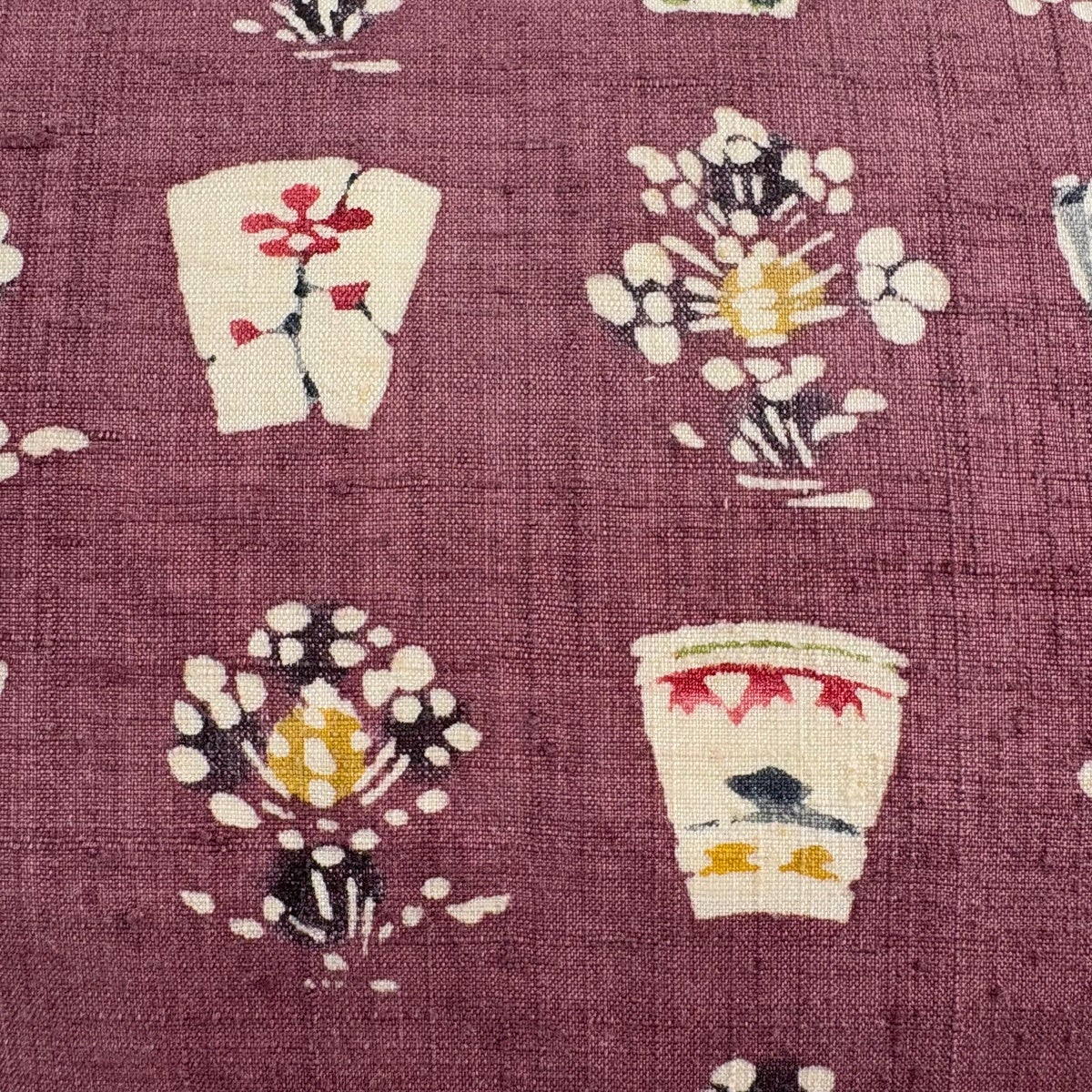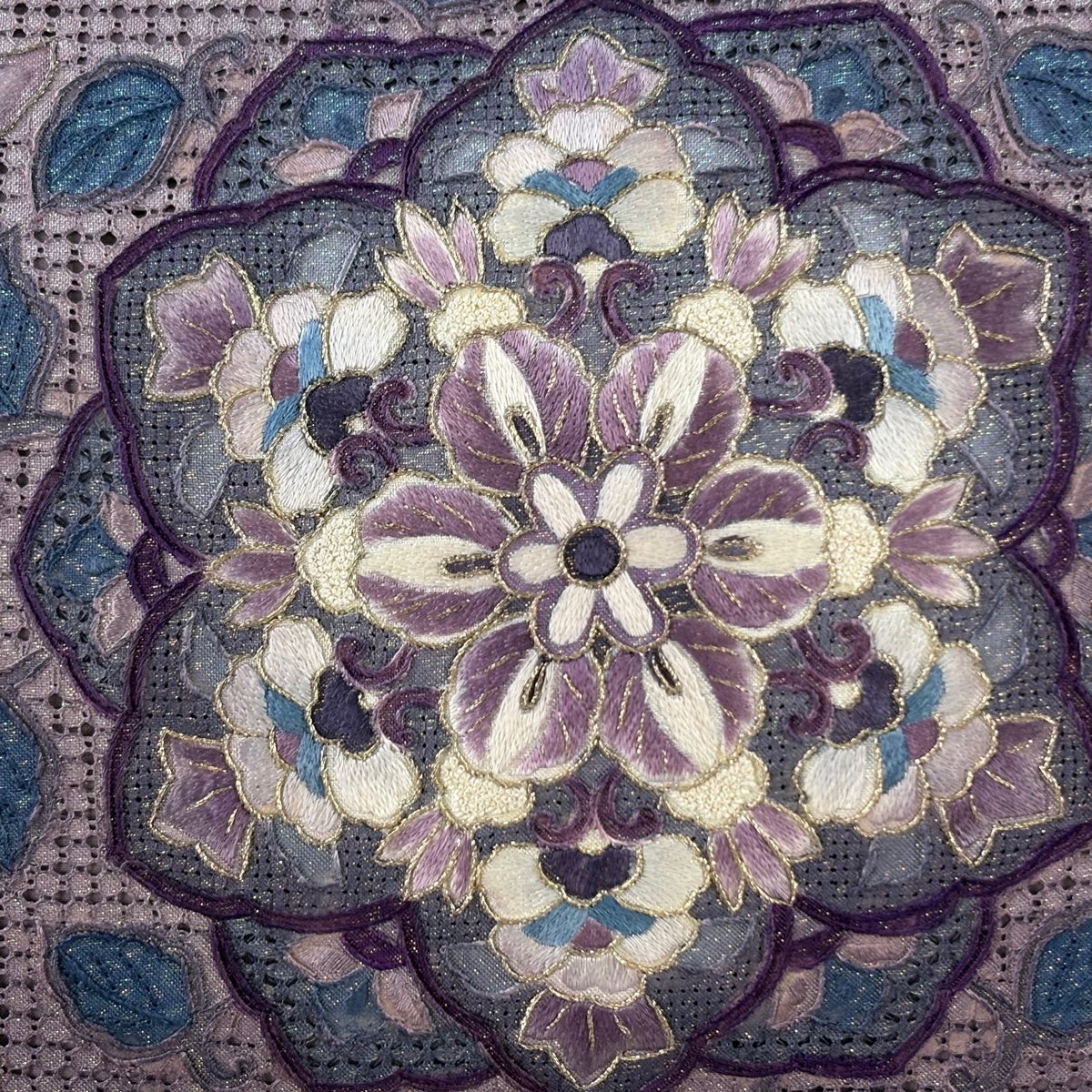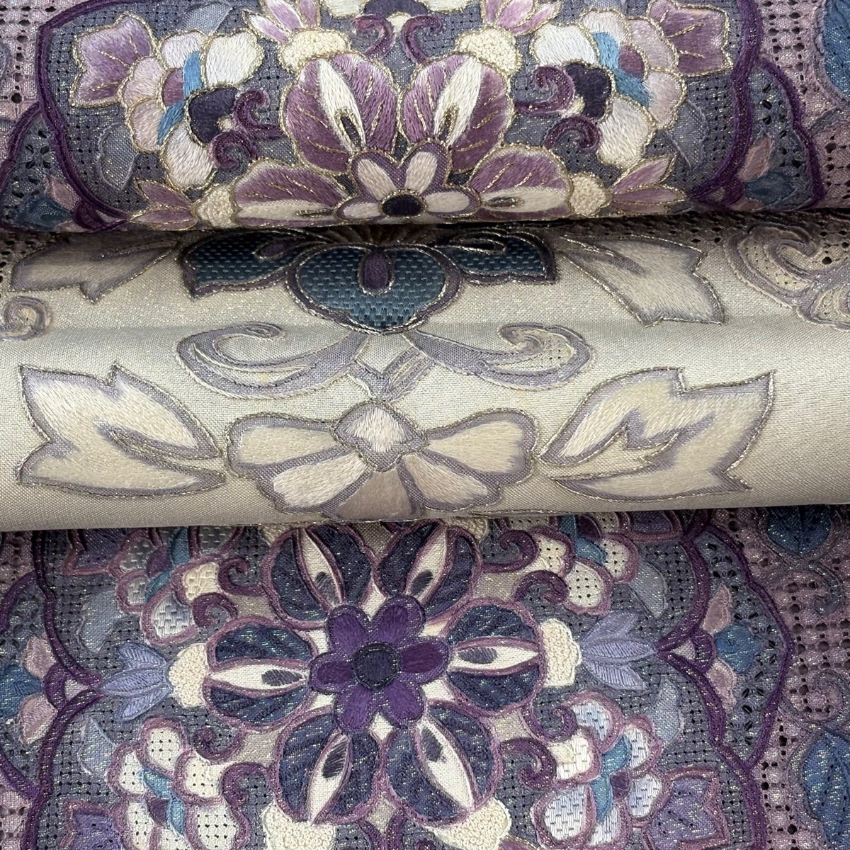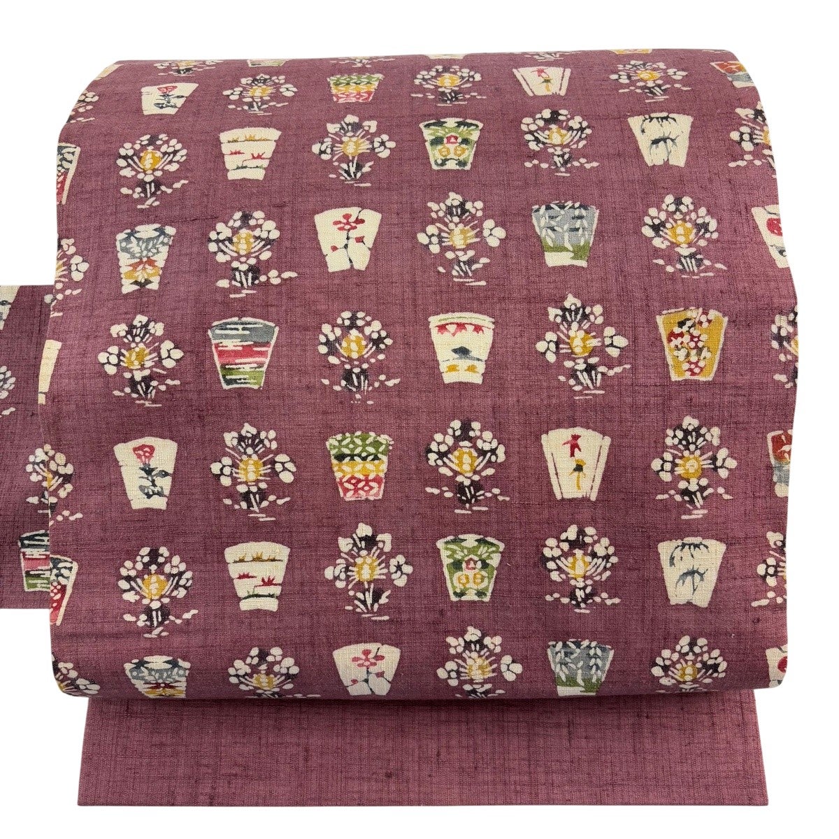 名古屋帯 秀品 落款あり 紬地 比翼仕立て 草花 霞 灰紫 正絹