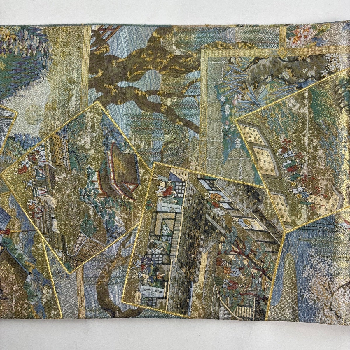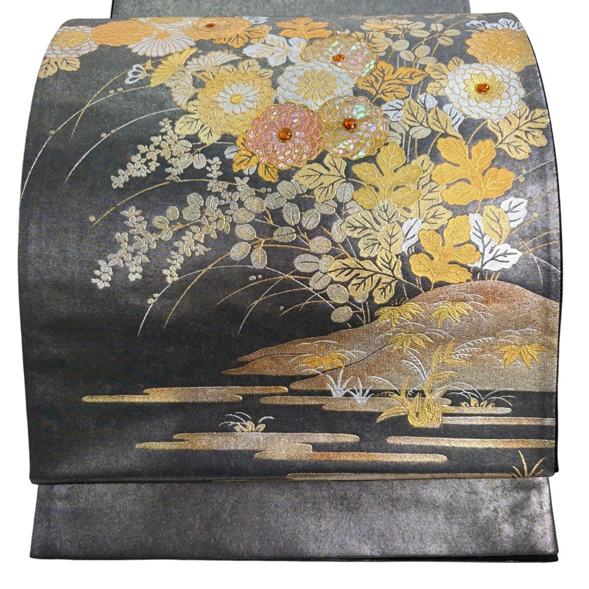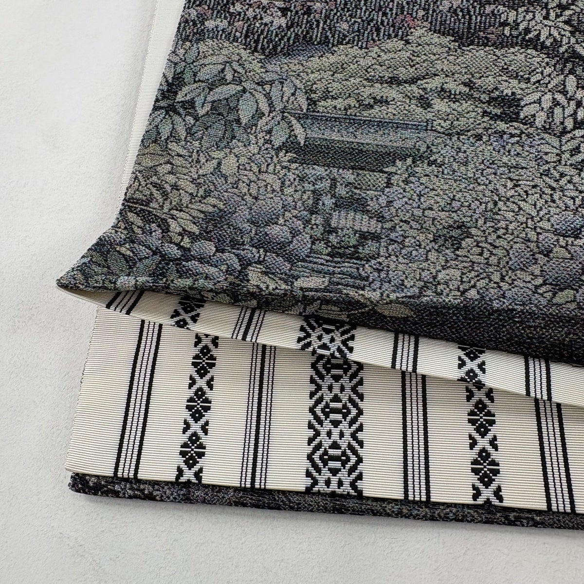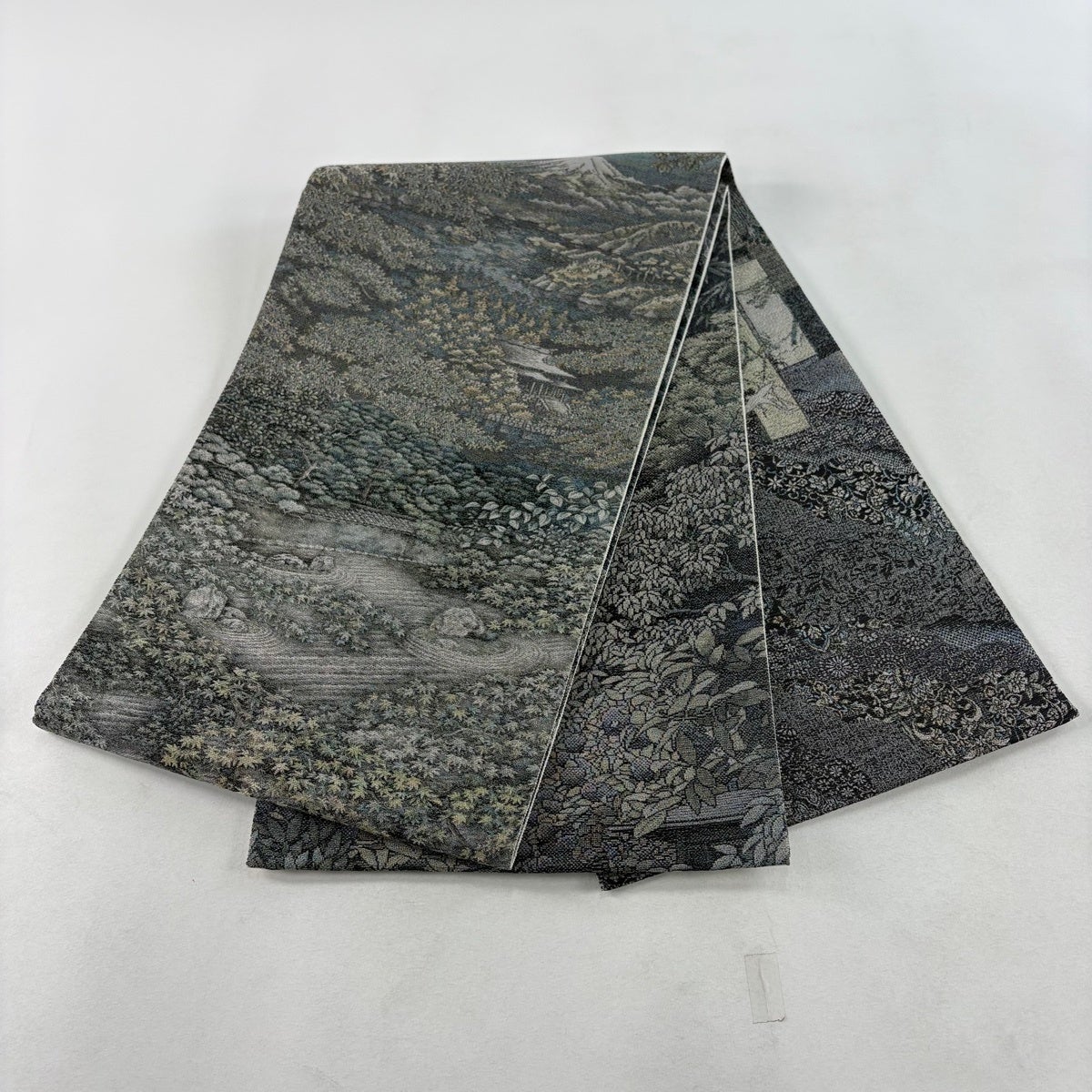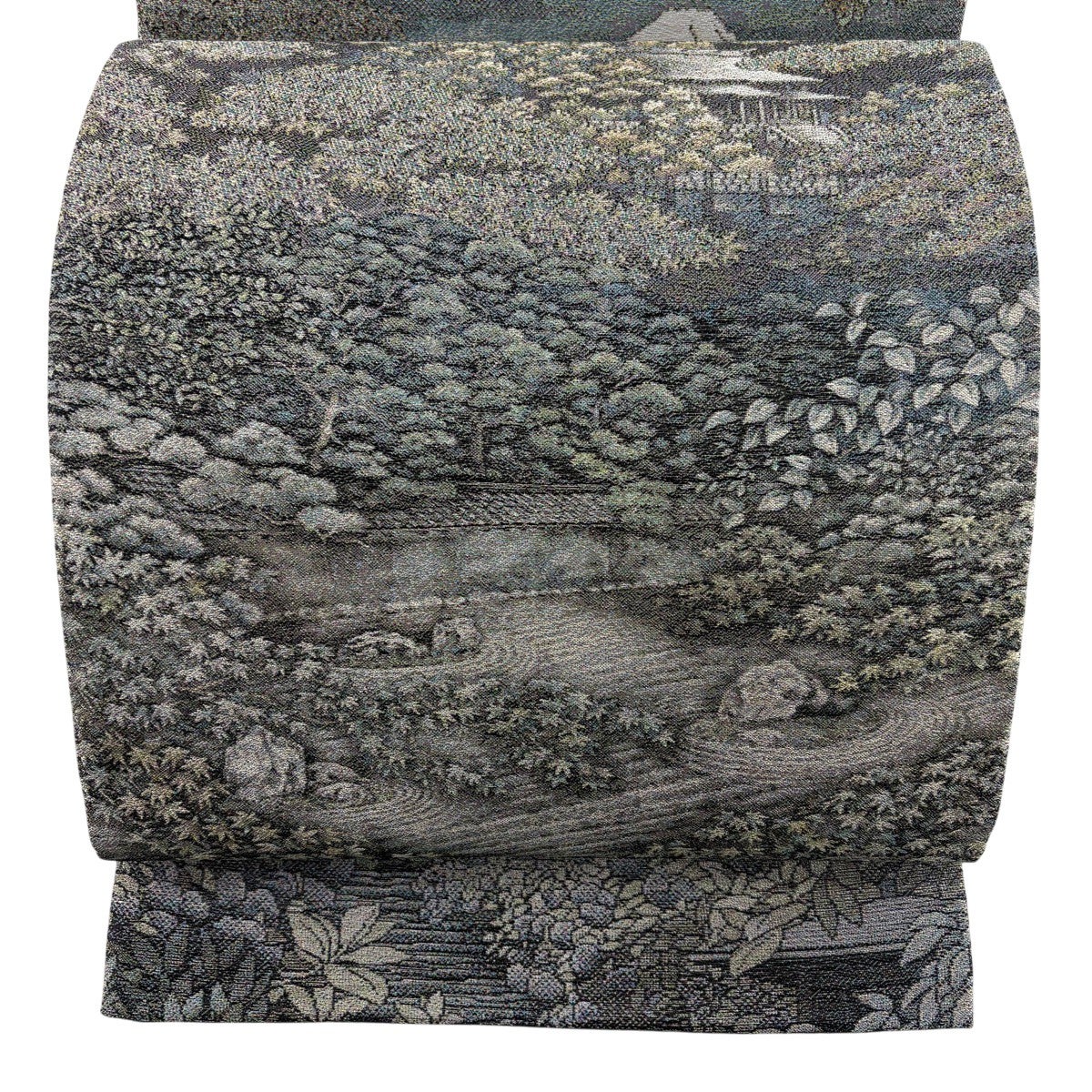 【美品】 袋帯 秀品 風景 枯山水 黒灰 お太鼓柄 正絹