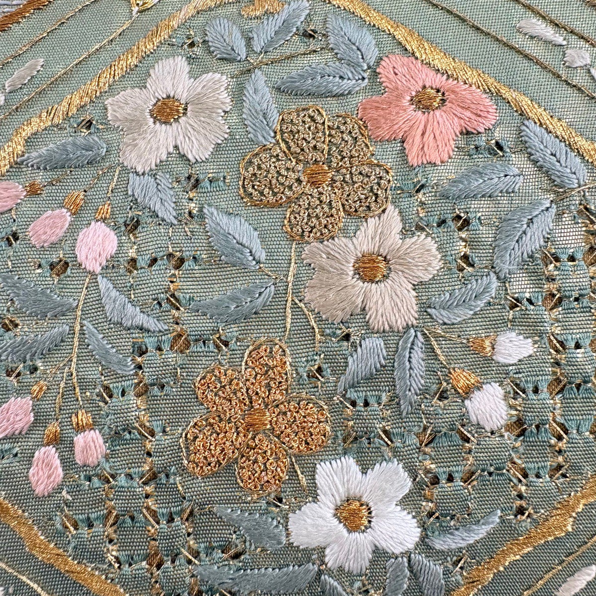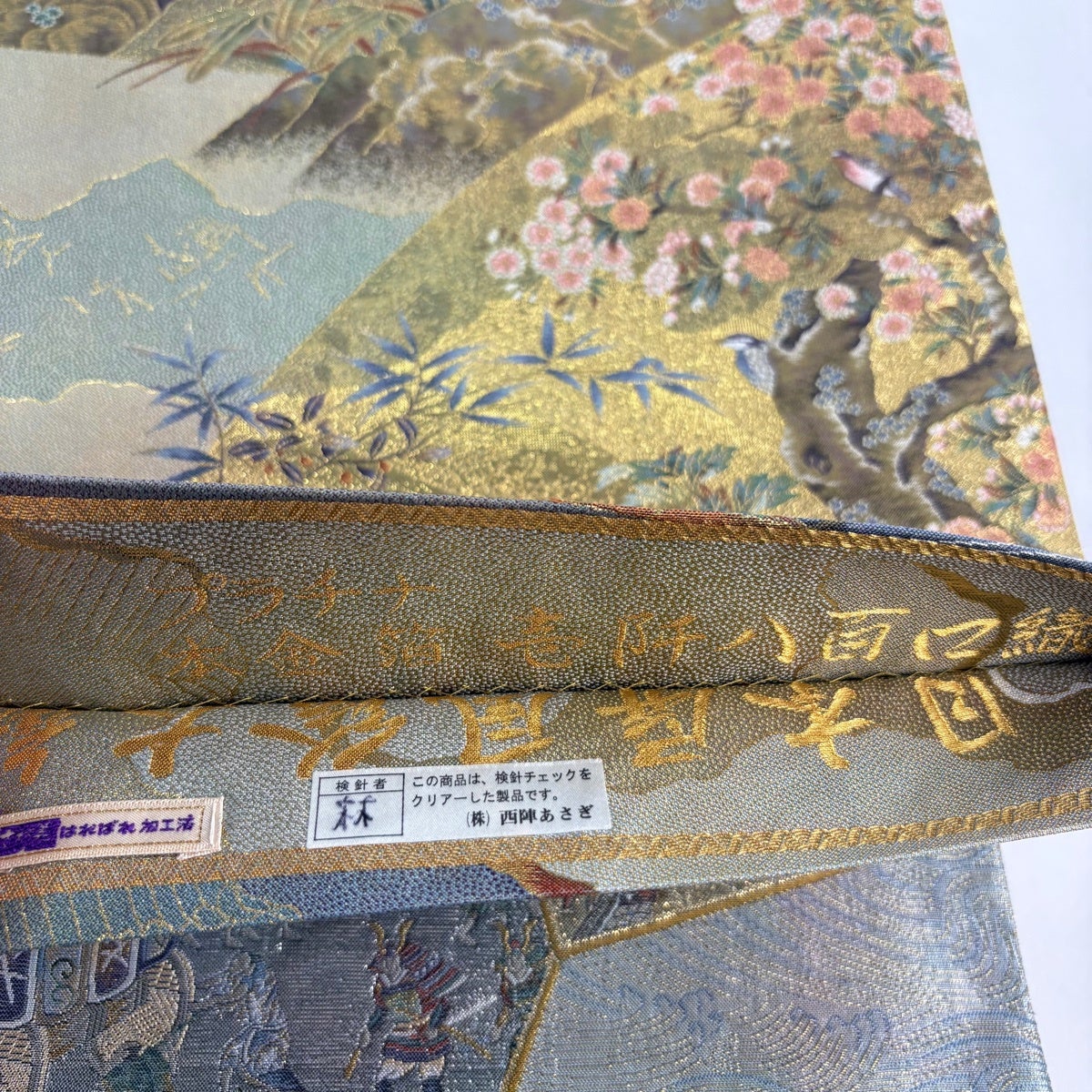 【美品】 袋帯 逸品 華文 相良刺繍 金糸 青灰色 お太鼓柄 正絹