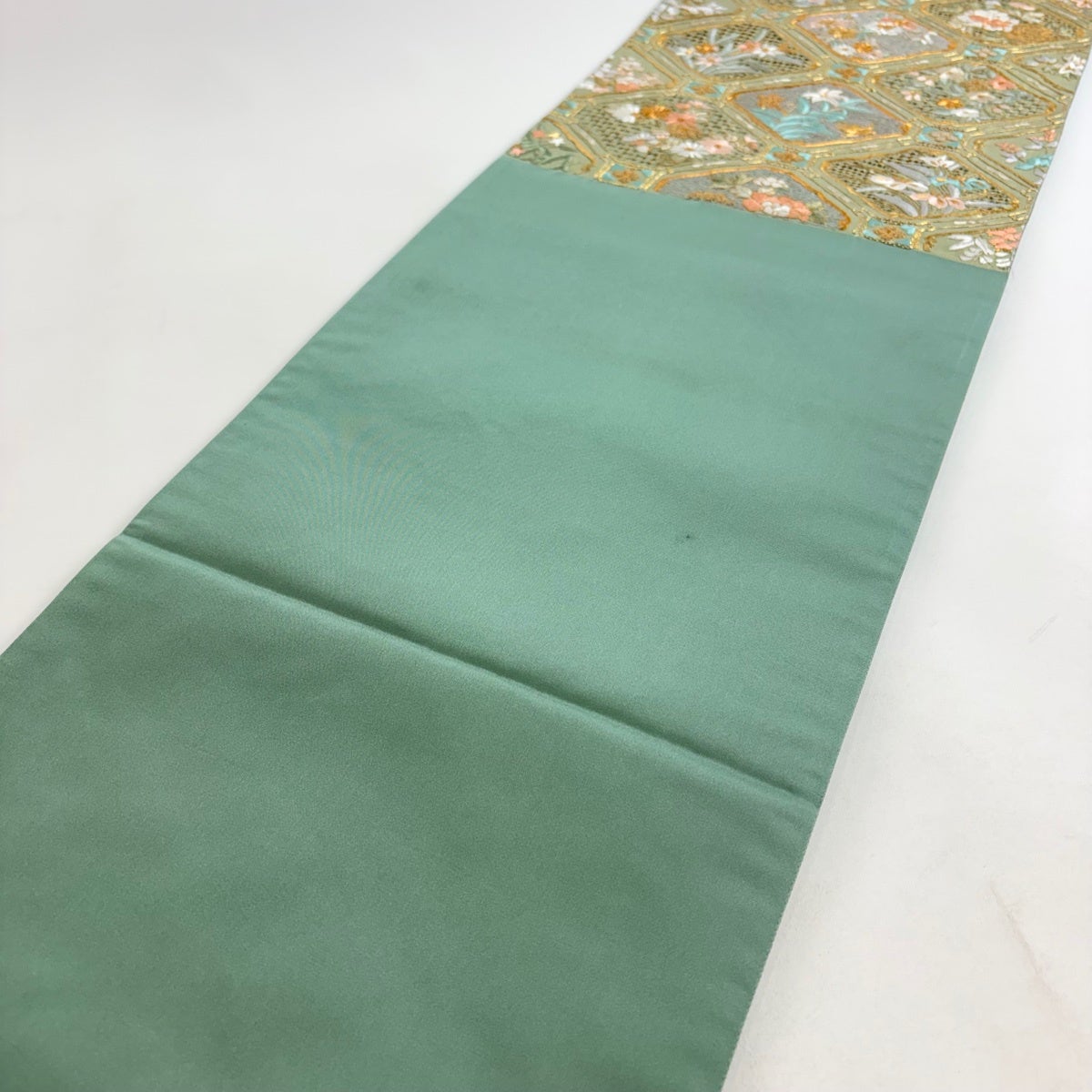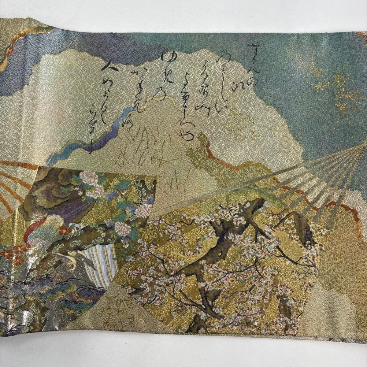 袋帯 秀品 草花 波 箔 銀糸 緑 六通 正絹