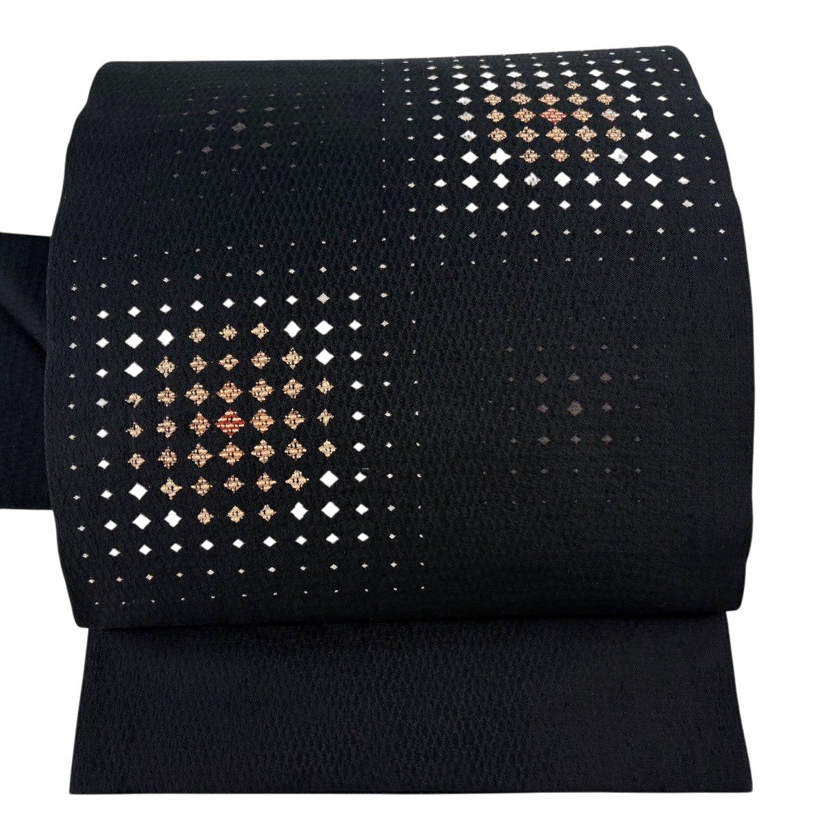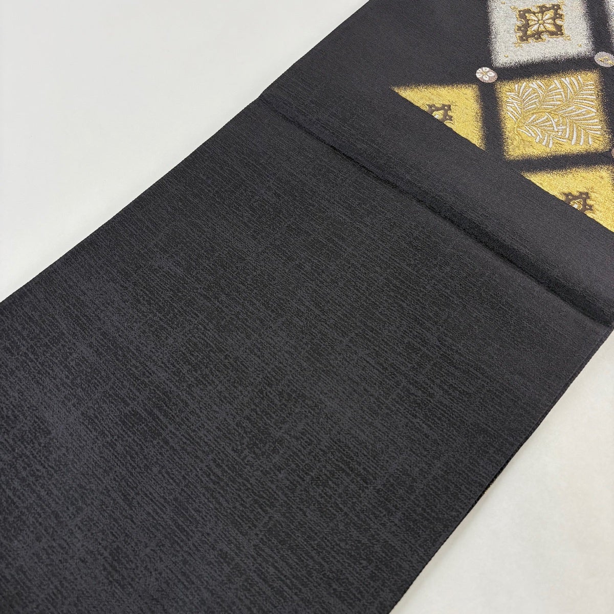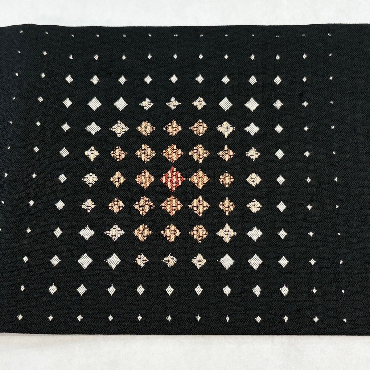 【美品】 名古屋帯 秀品 紬地 菱 刺繍 黒 正絹