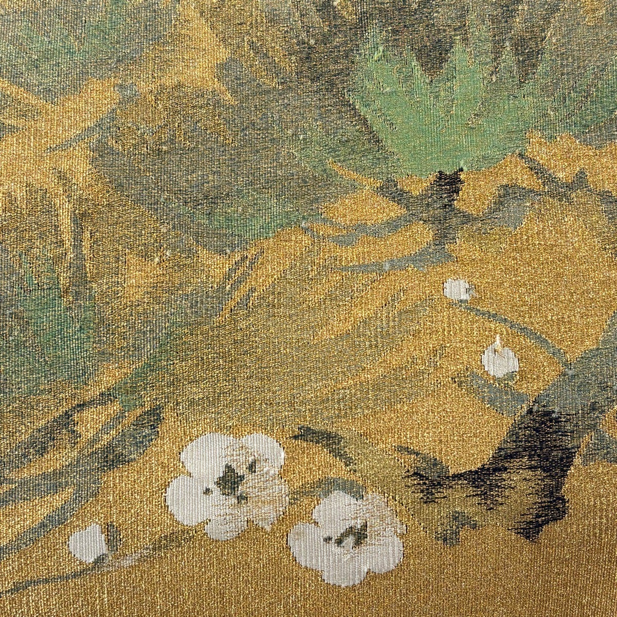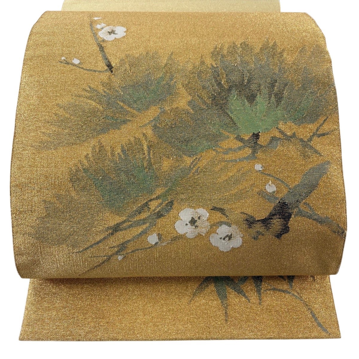 【美品】 袋帯 名品 草木染 若松 花菱 金銀糸 箔 薄黄土色 六通 正絹
