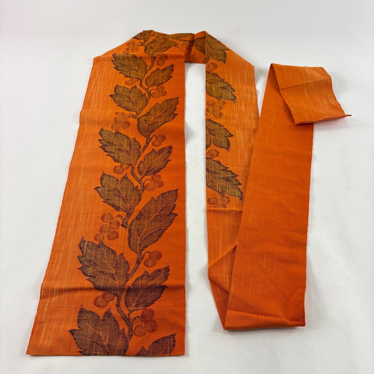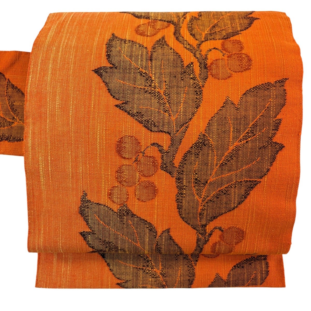【美品】 名古屋帯 優品 八寸名古屋帯 葉と実 オレンジ 正絹