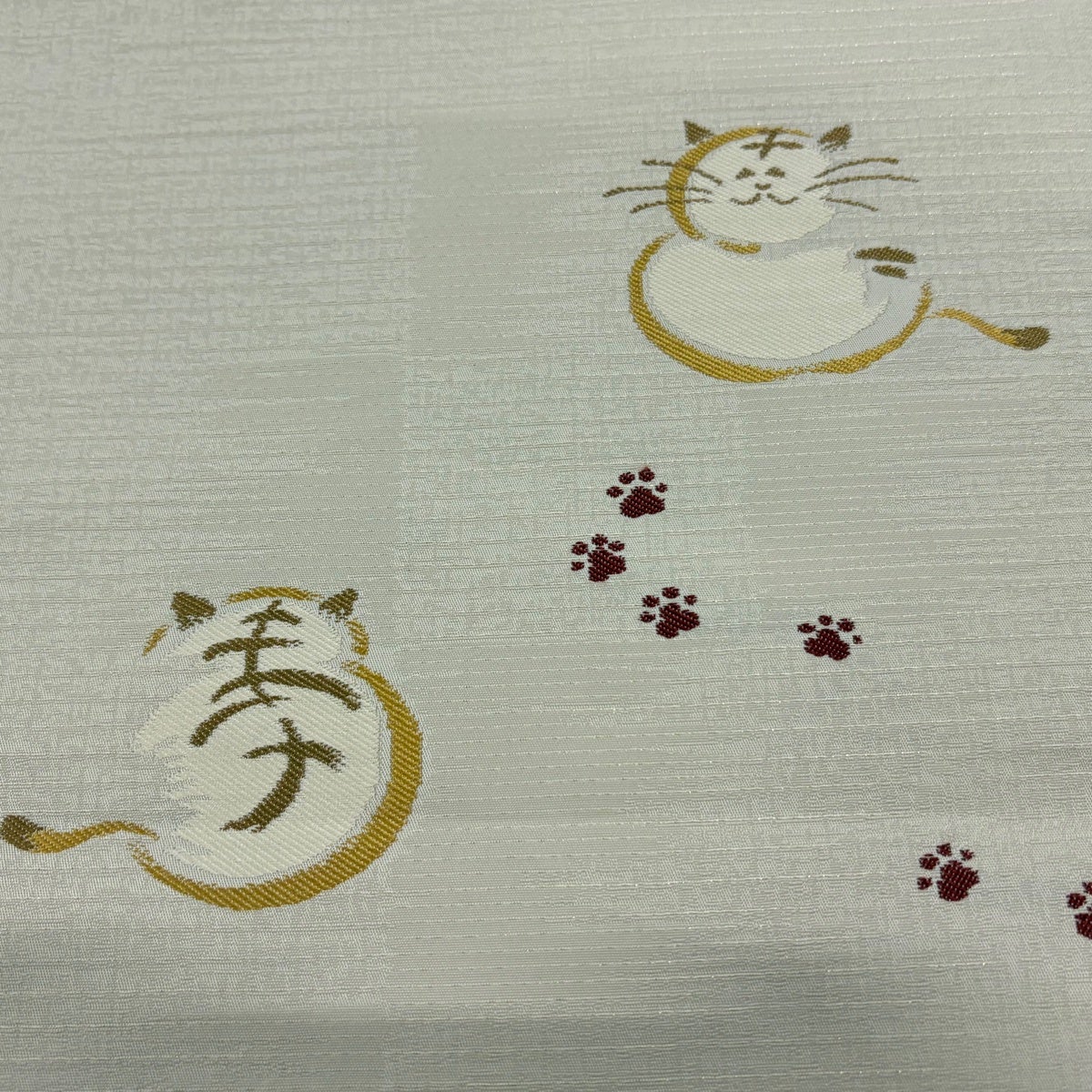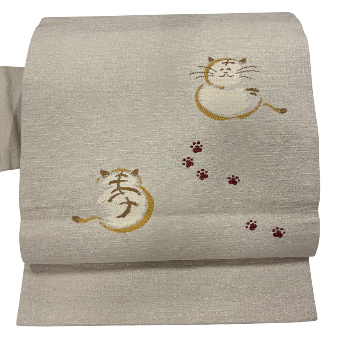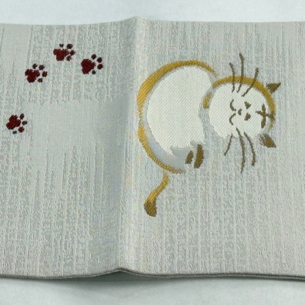 【美品】 名古屋帯 名品 縞猫 肉球 金通し 灰白 正絹