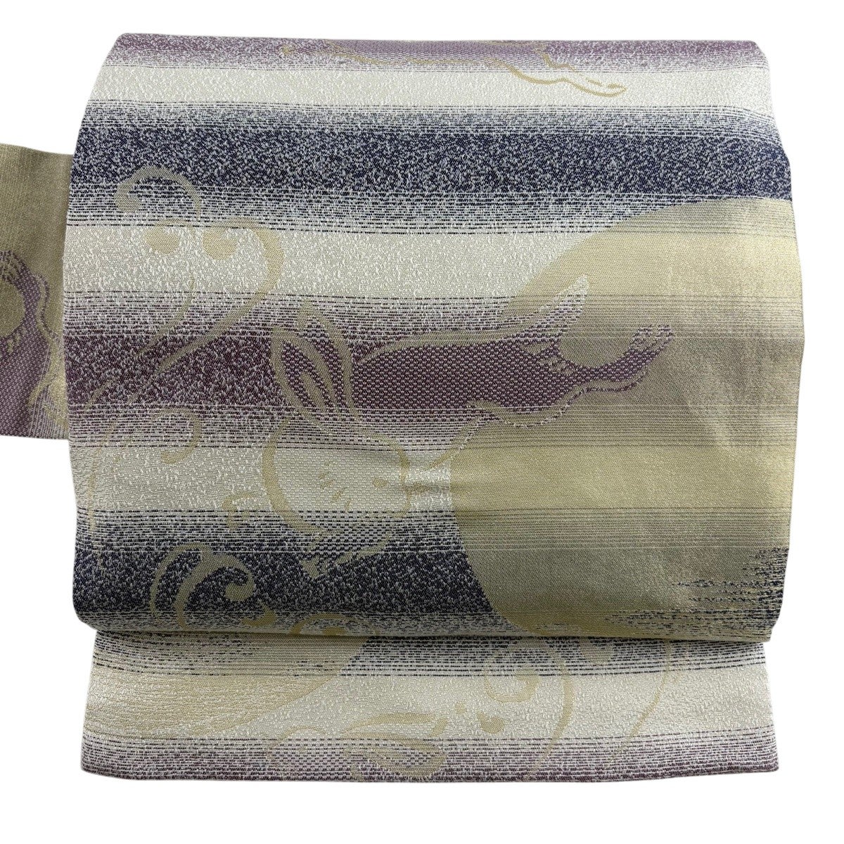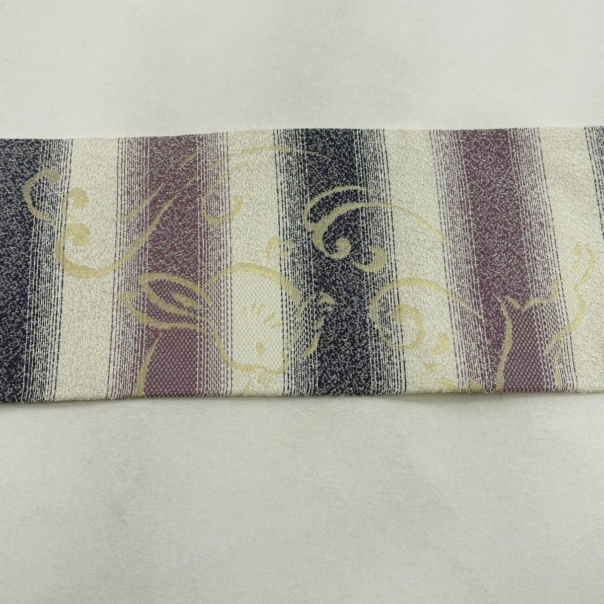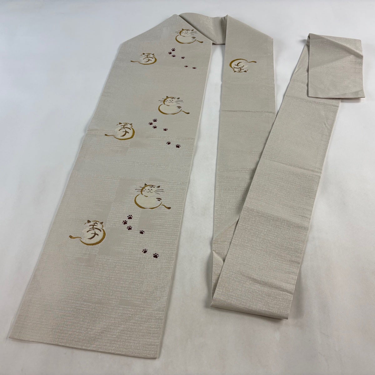 【美品】 名古屋帯 名品 縞猫 肉球 金通し 灰白 正絹