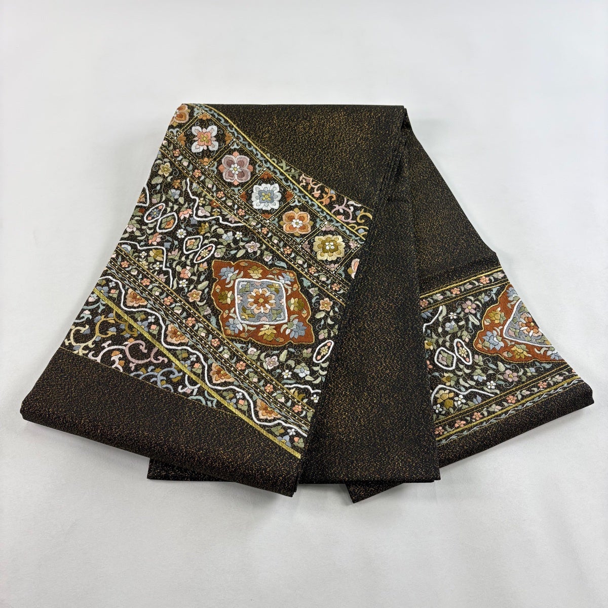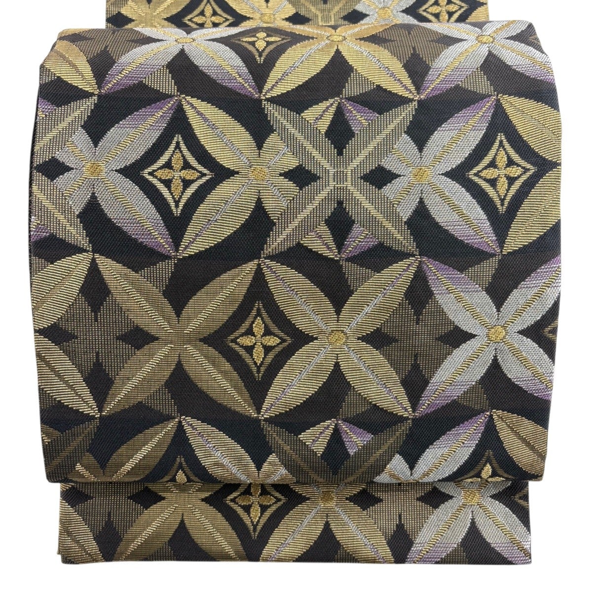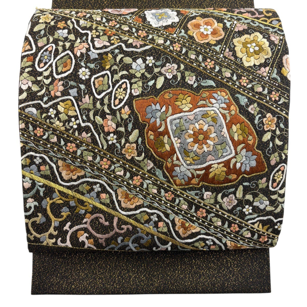 【美品】 袋帯 名品 花菱 花唐草 刺繍 金通し 黒 お太鼓柄 正絹