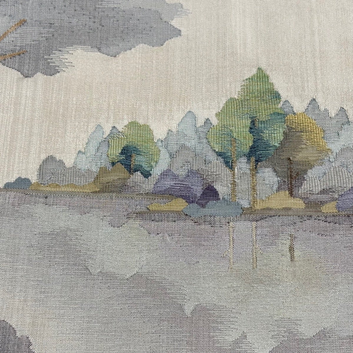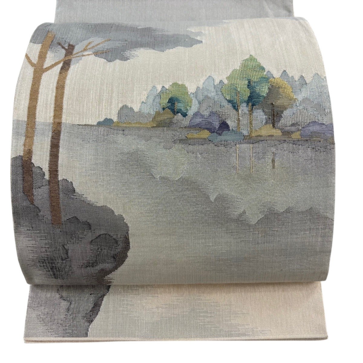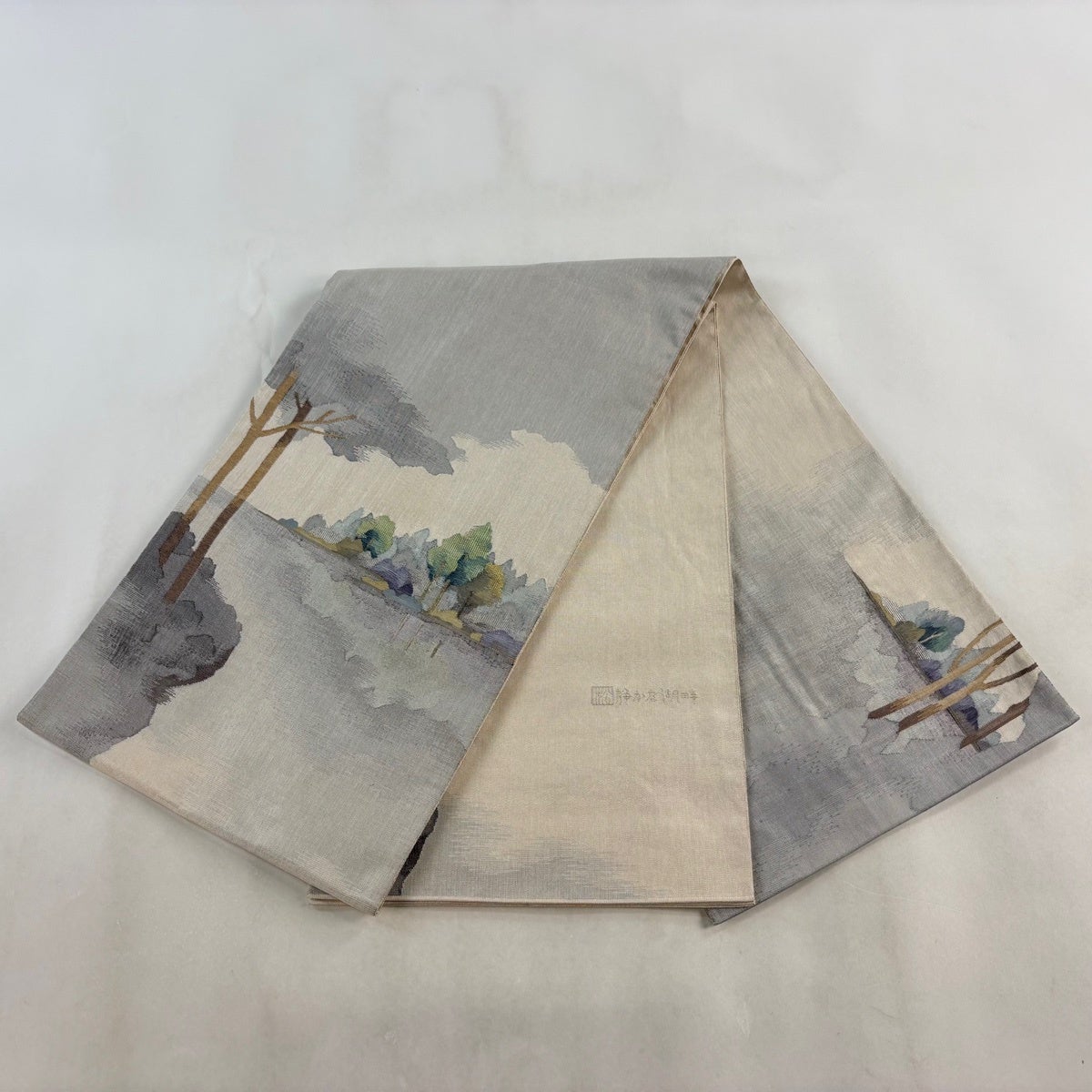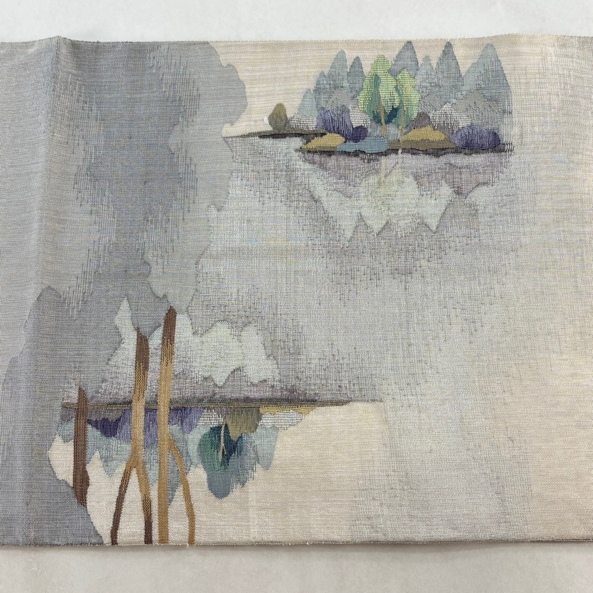 袋帯 秀品 落款あり 樹木 雲文 銀糸 ベージュ お太鼓柄 正絹