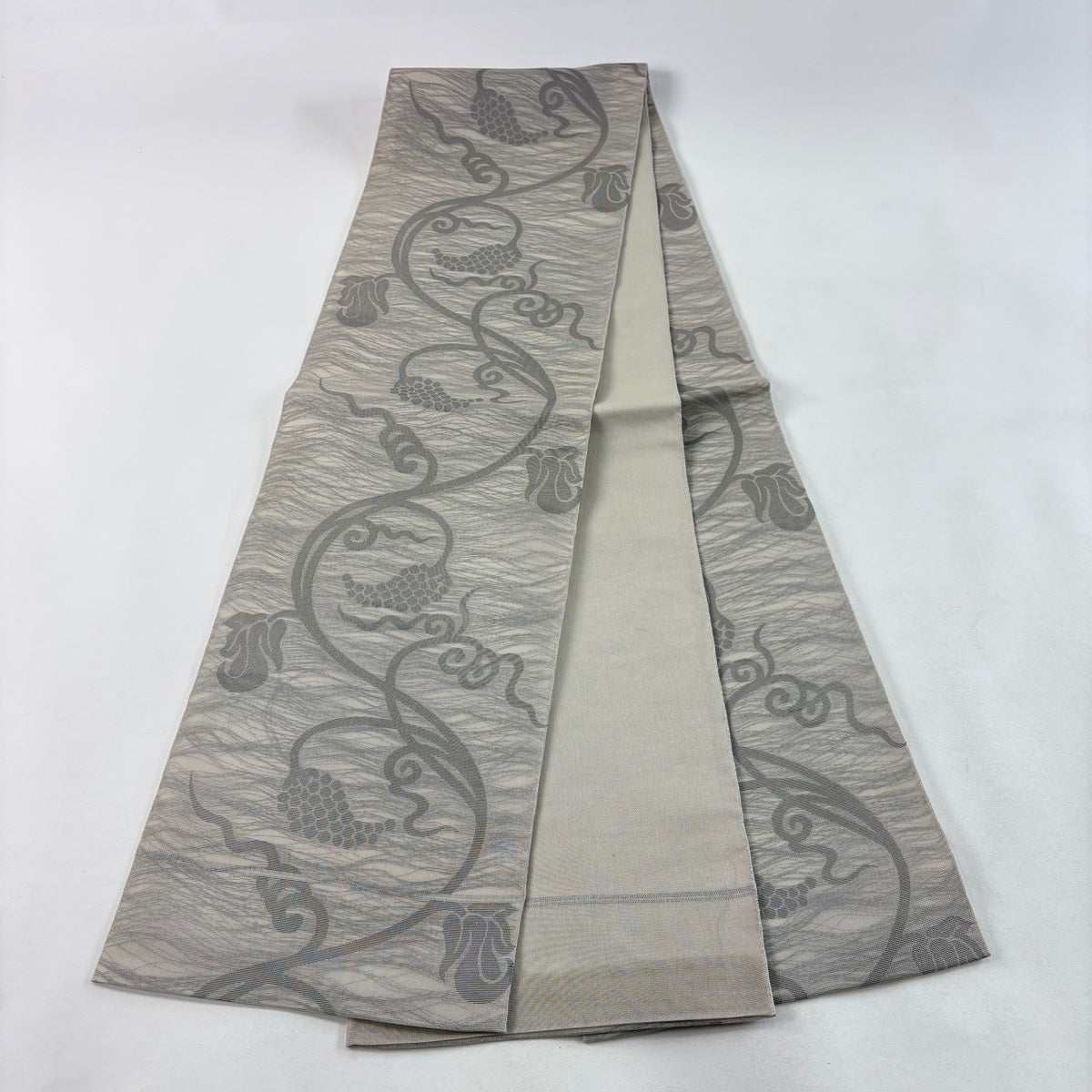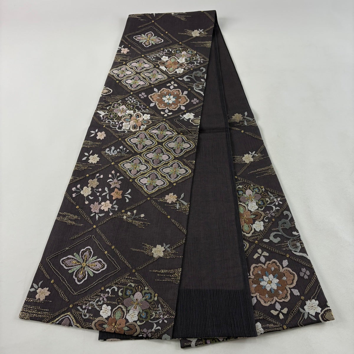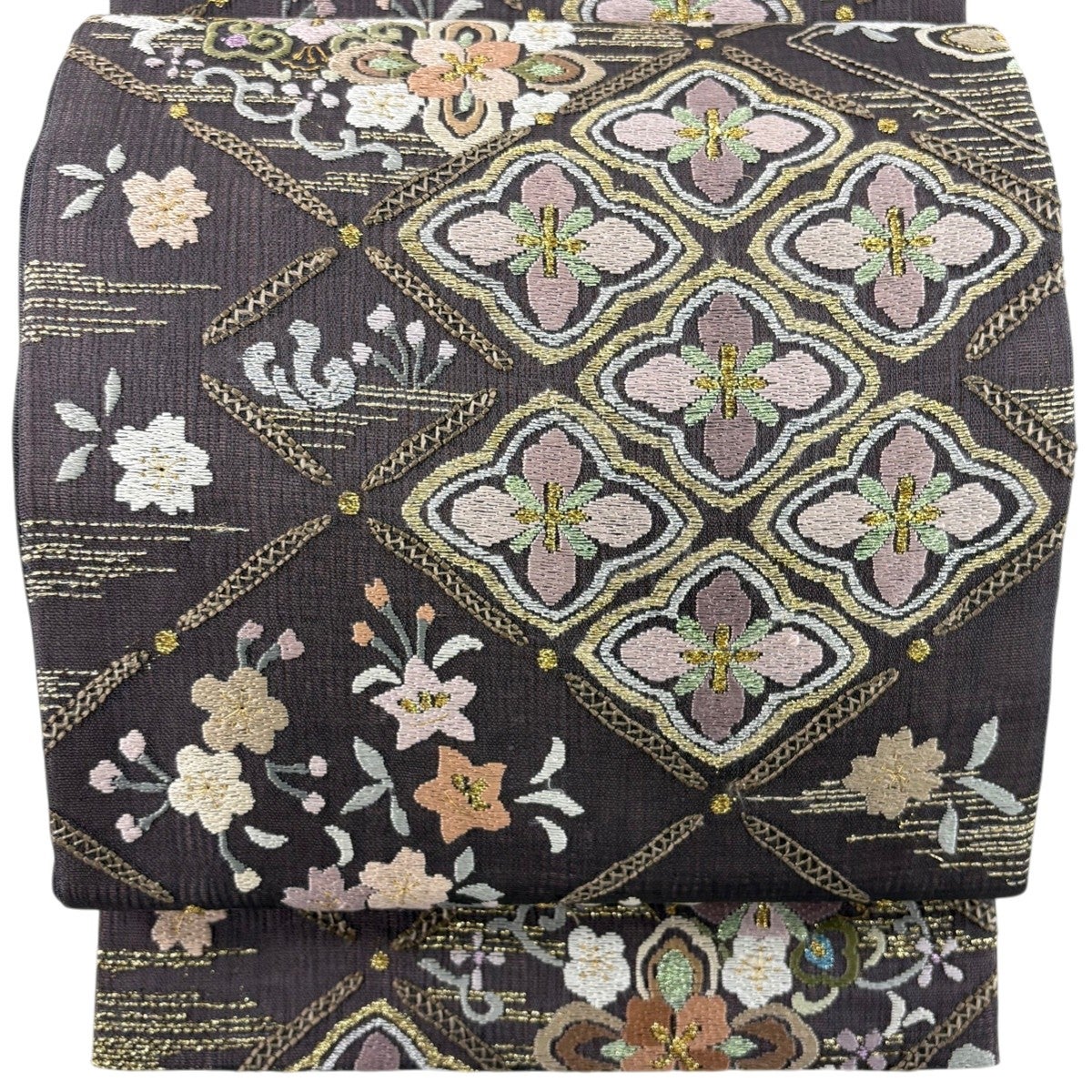 【美品】半幅帯 秀品 博多織 証紙 草花 幾何学模様 灰茶 正絹
