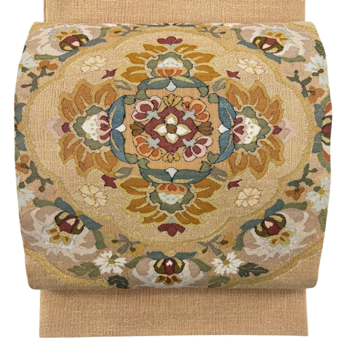 【美品】 袋帯 名品 華文 草花 刺繍 薄オレンジ お太鼓柄 正絹