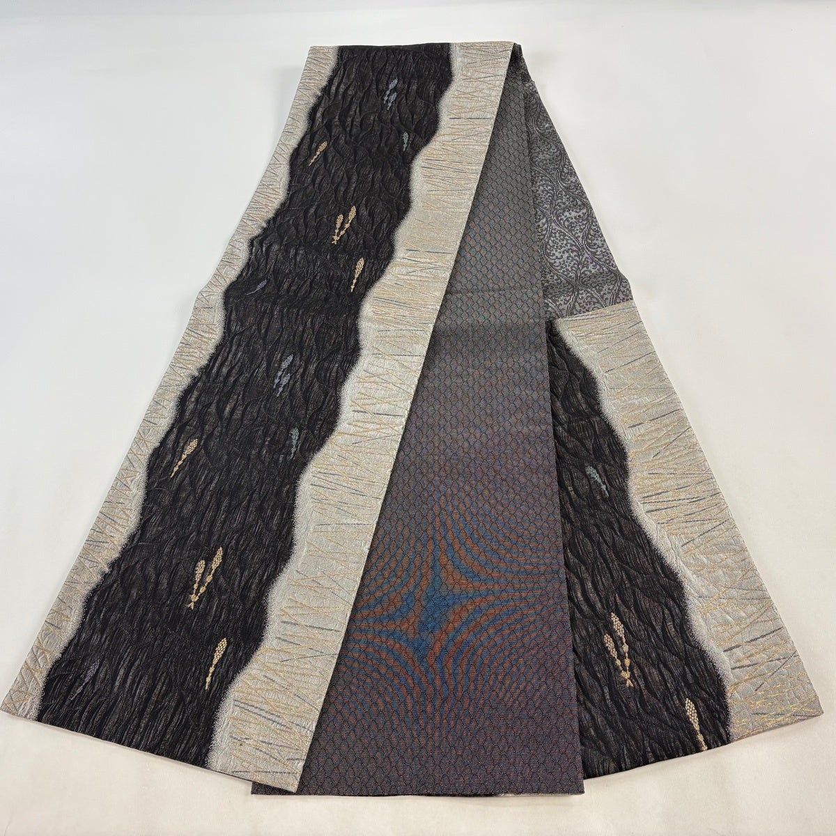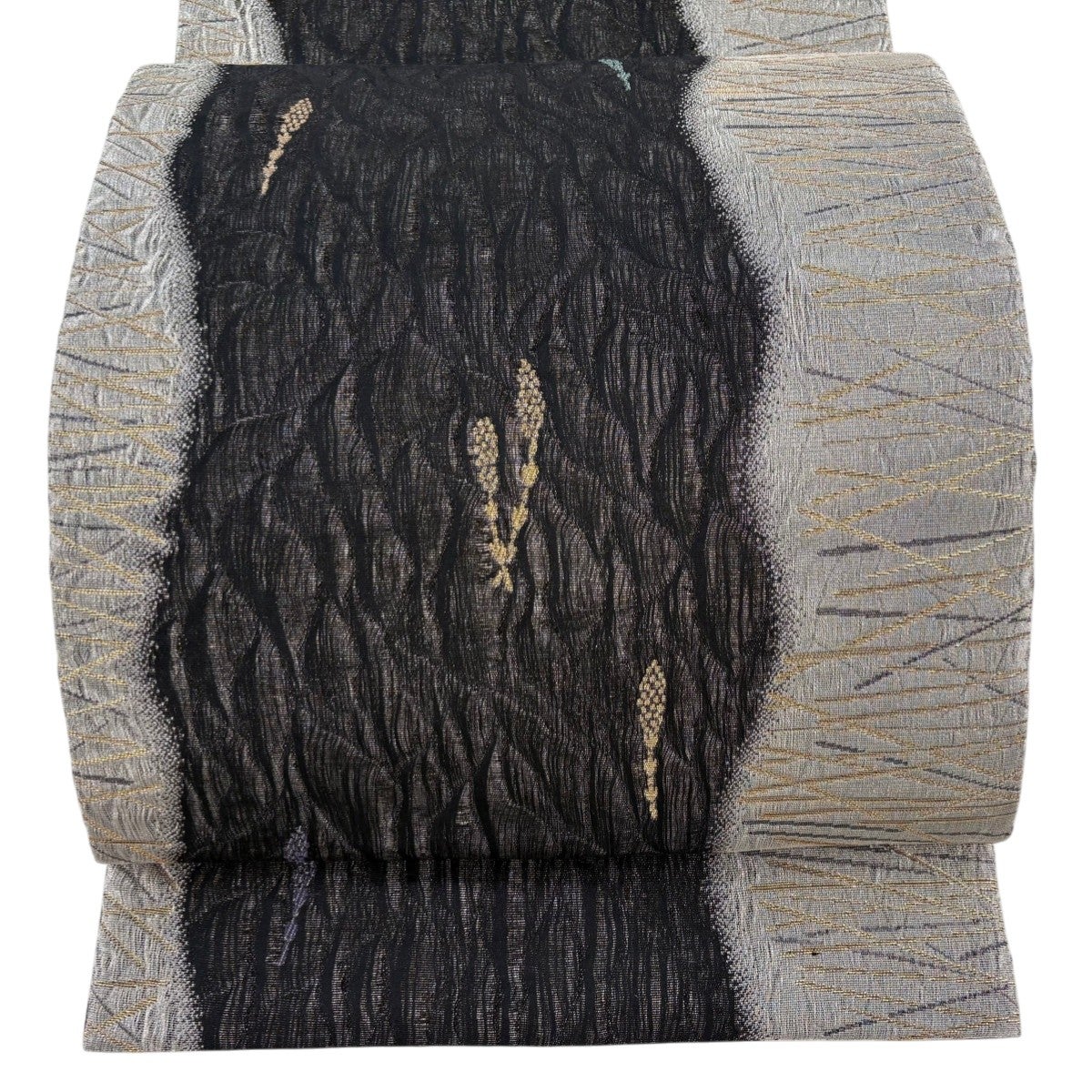 名古屋帯 秀品 紬地 草花 斜縞 黒 正絹
