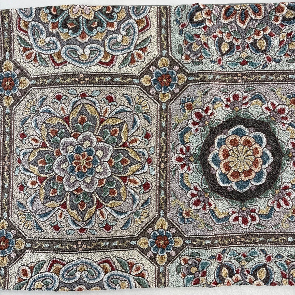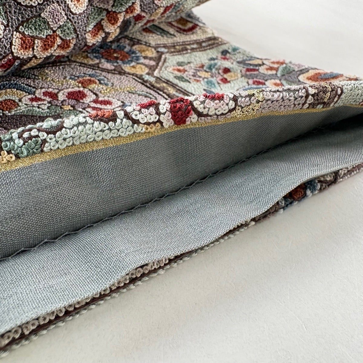【美品】 袋帯 秀品 花鳥 花唐草 刺繍 金糸 灰色 お太鼓柄 正絹