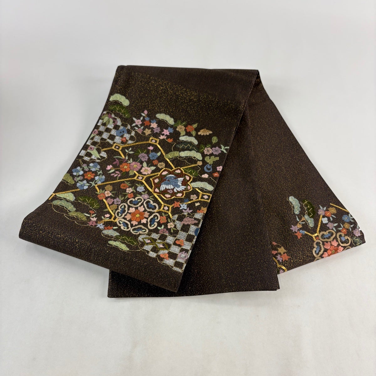 【美品】 袋帯 秀品 華文 花鳥 刺繍 箔 茶緑色 お太鼓柄 正絹