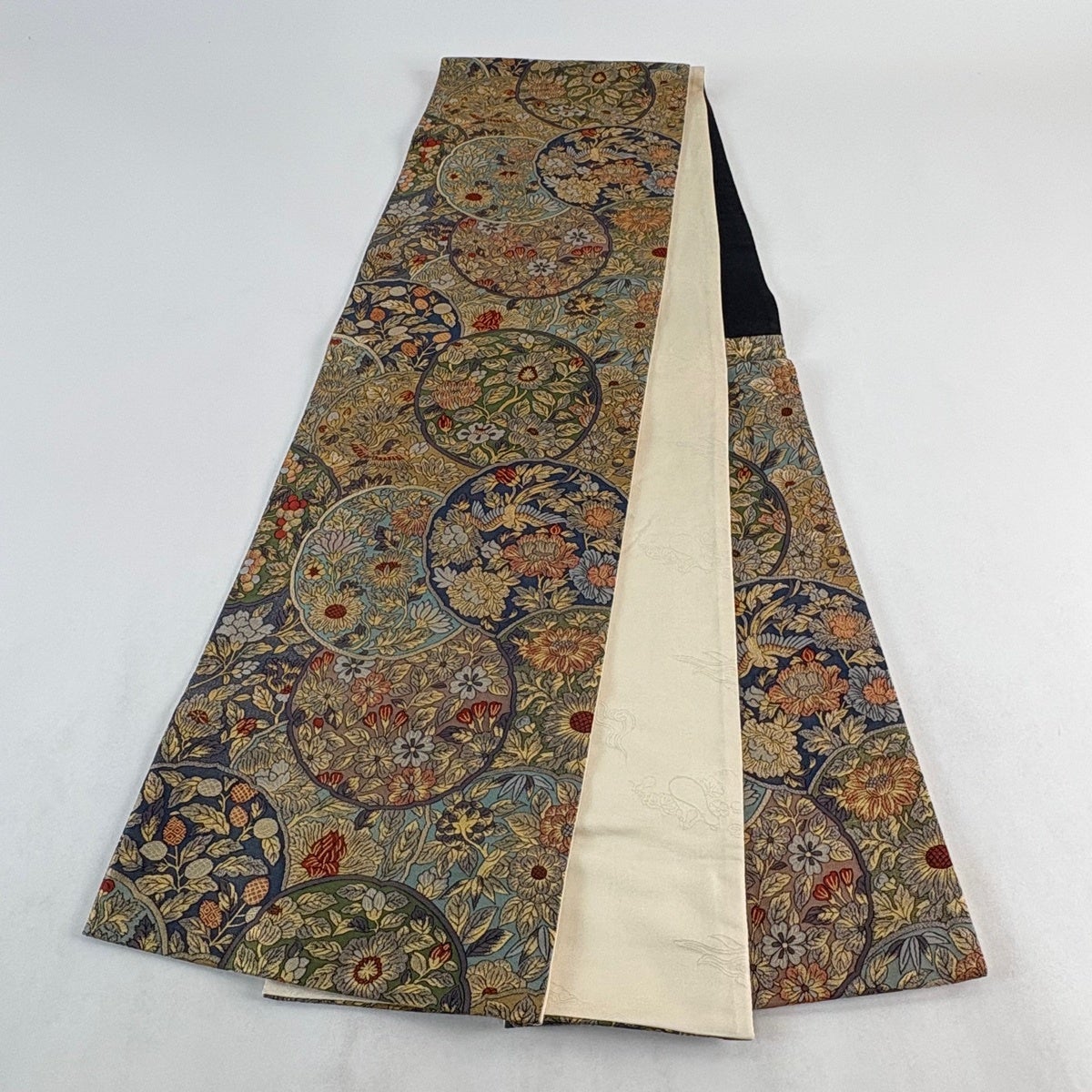 【美品】 袋帯 名品 草花 花丸文 金糸 唐織 ベージュ 六通 正絹