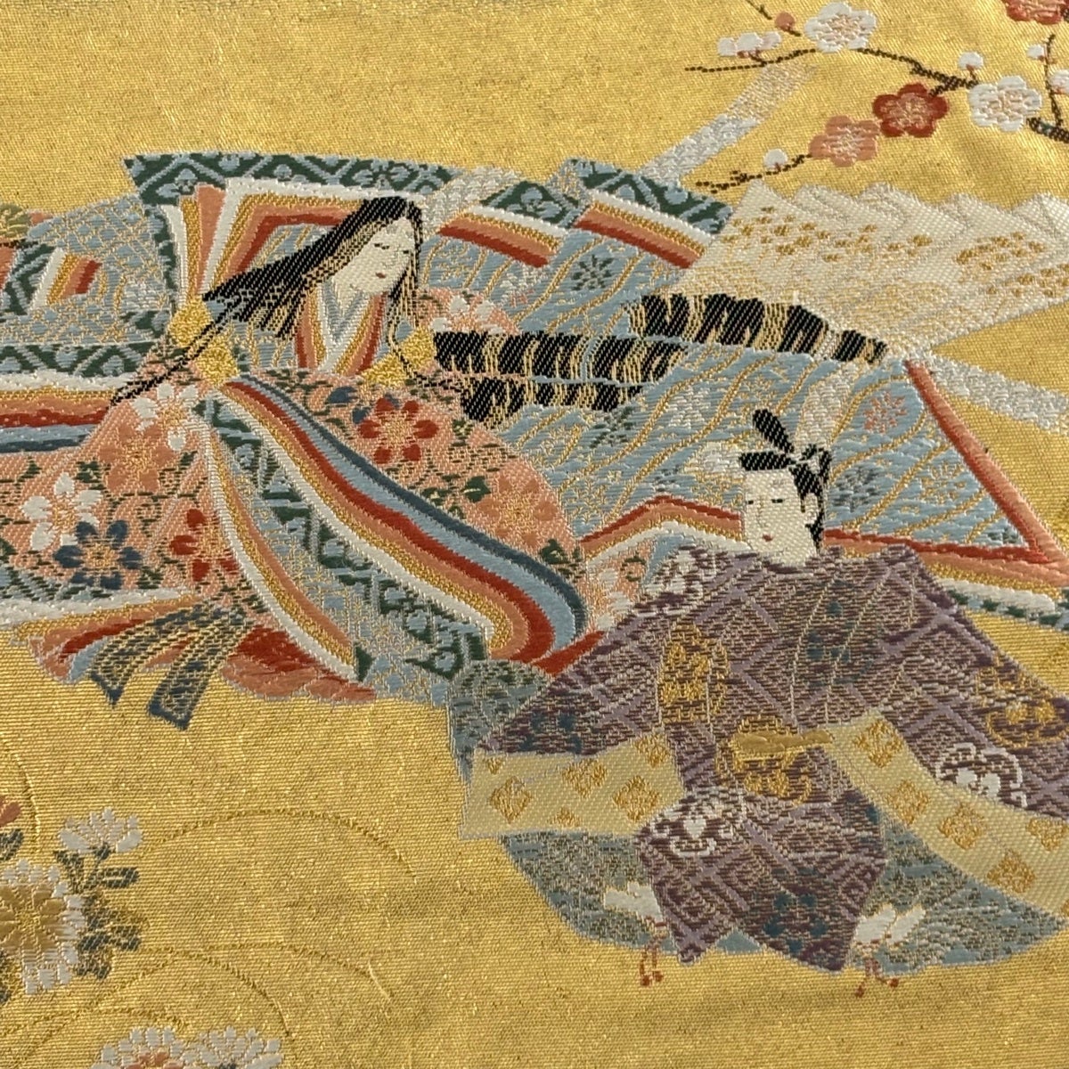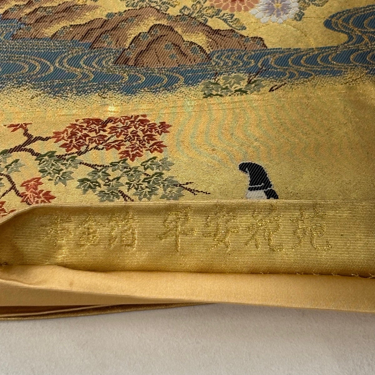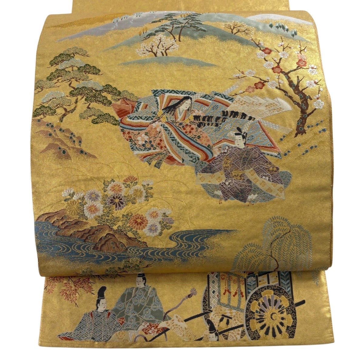 袋帯 秀品 長嶋成織物 落款あり 平安花苑 人物 刺繍 本金箔 金色 お太鼓柄 正絹
