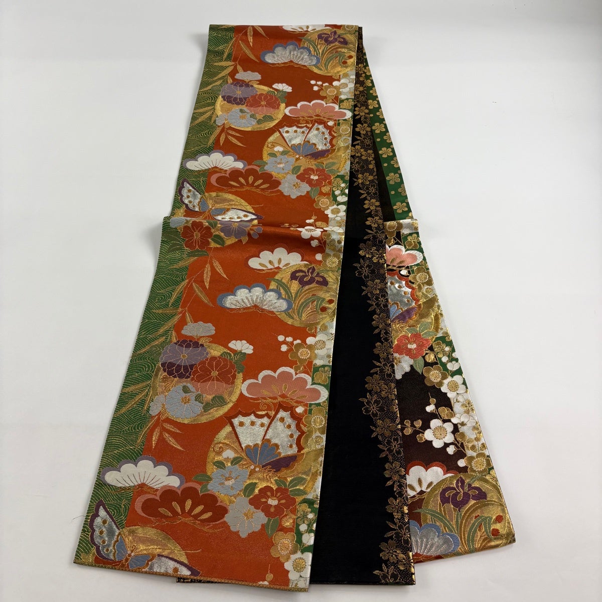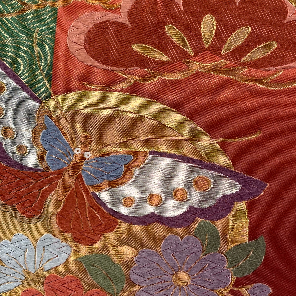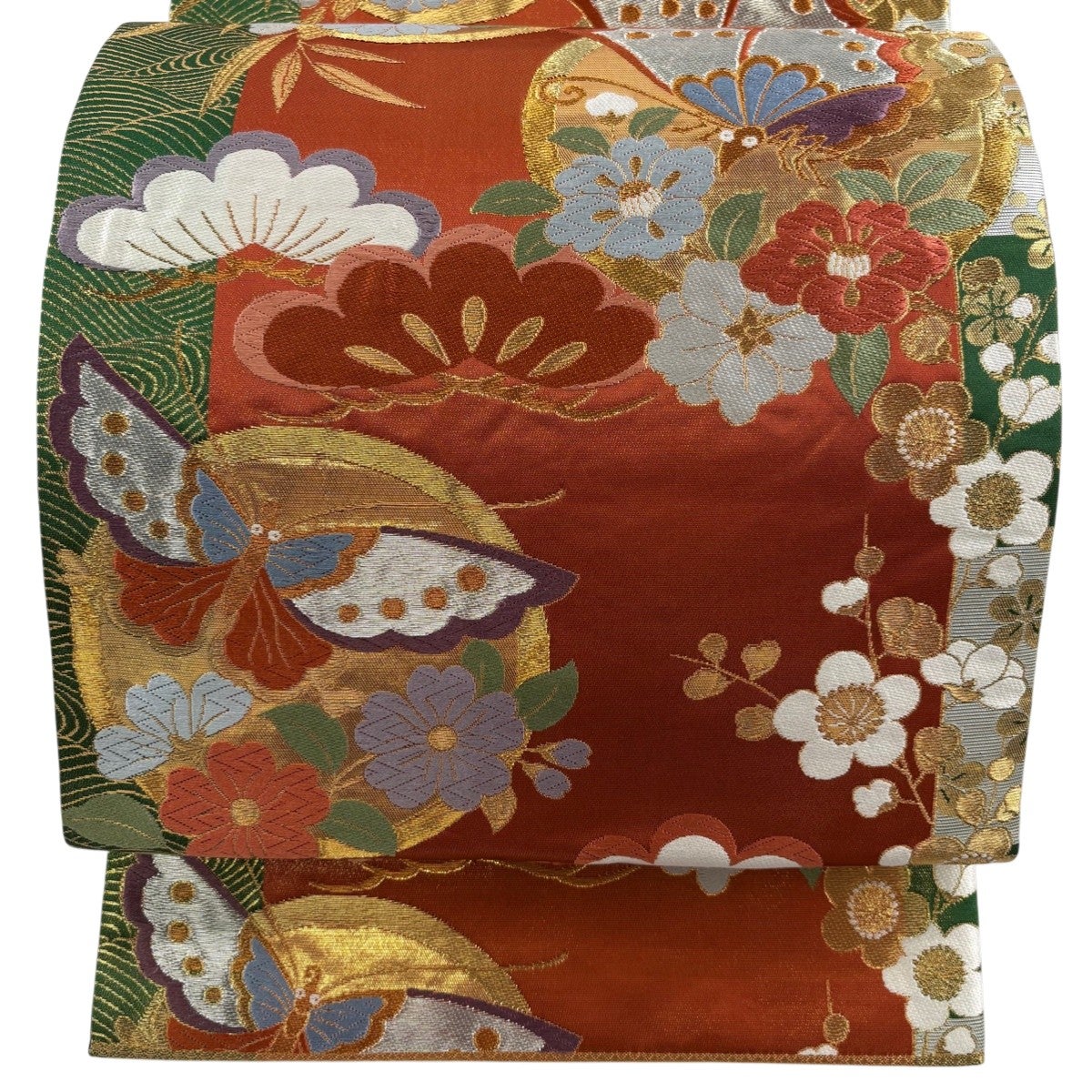 袋帯 秀品 振袖向き 二色染 松竹梅 蝶 金糸 箔 朱色 六通 正絹