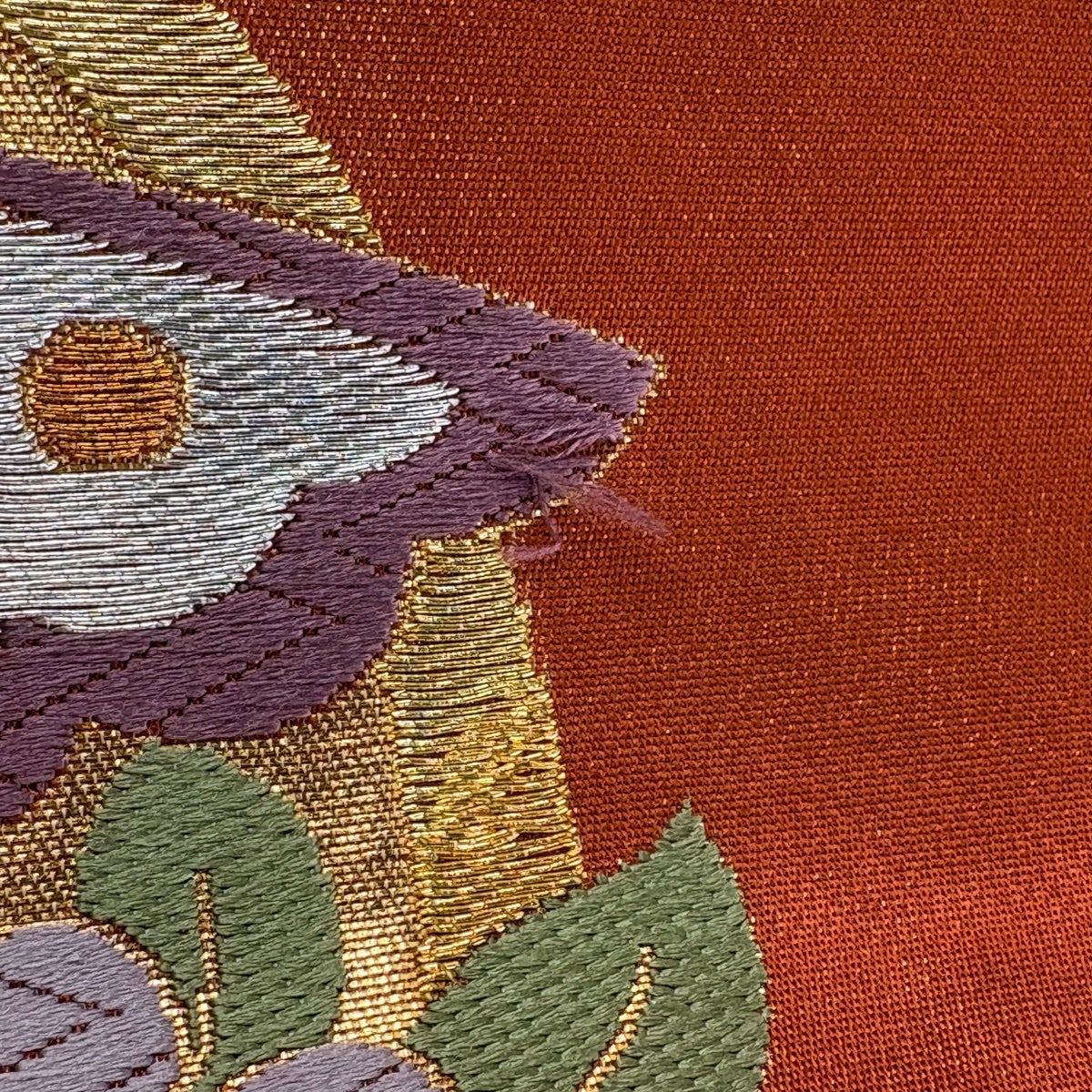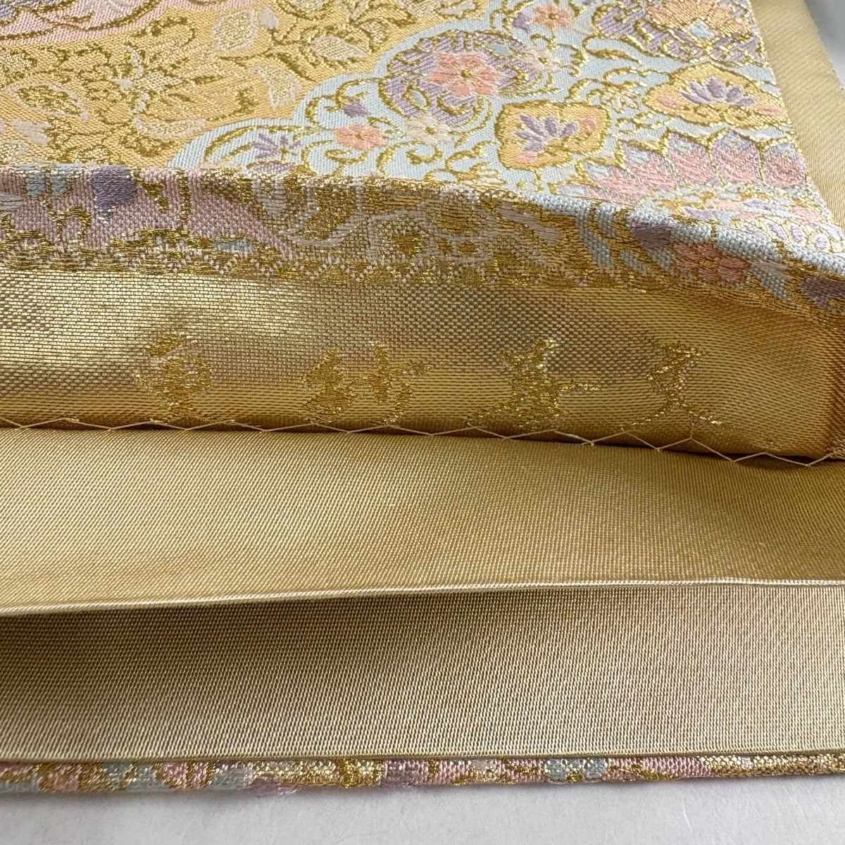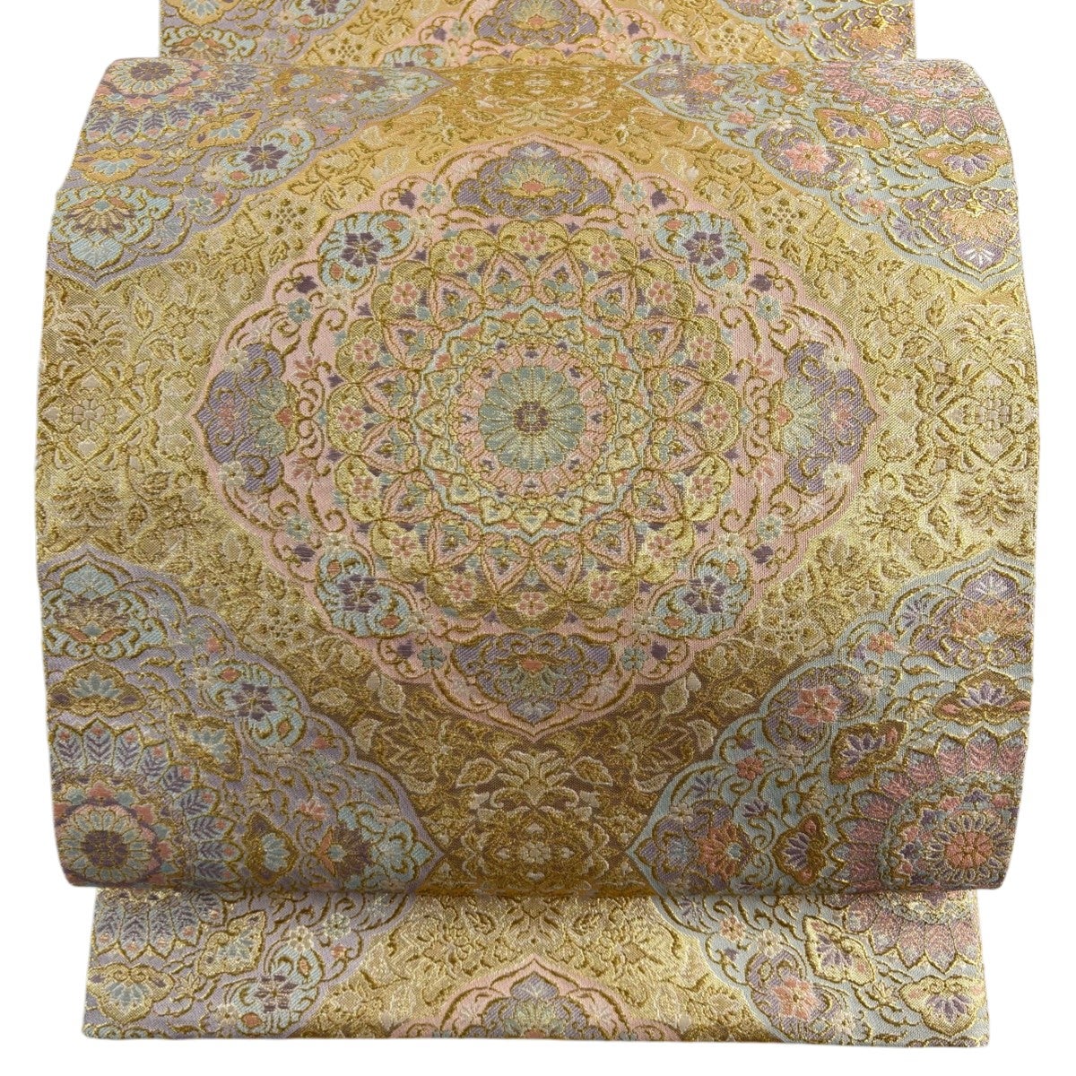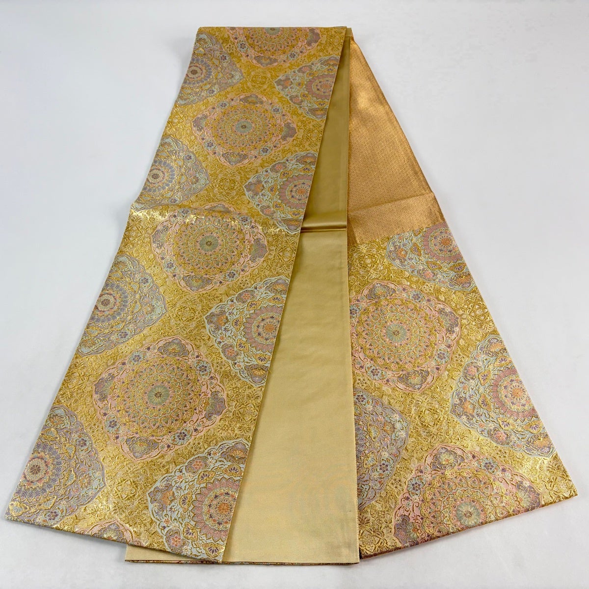 袋帯 秀品 蜀江文 華文 螺鈿 汕頭刺繍 金色 お太鼓柄 正絹