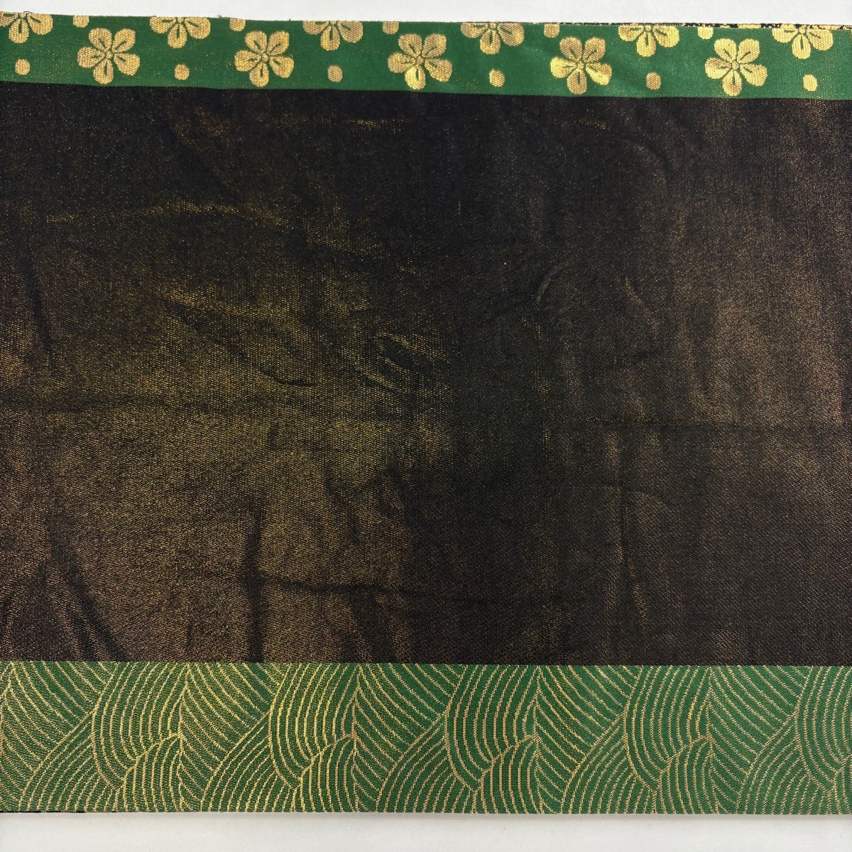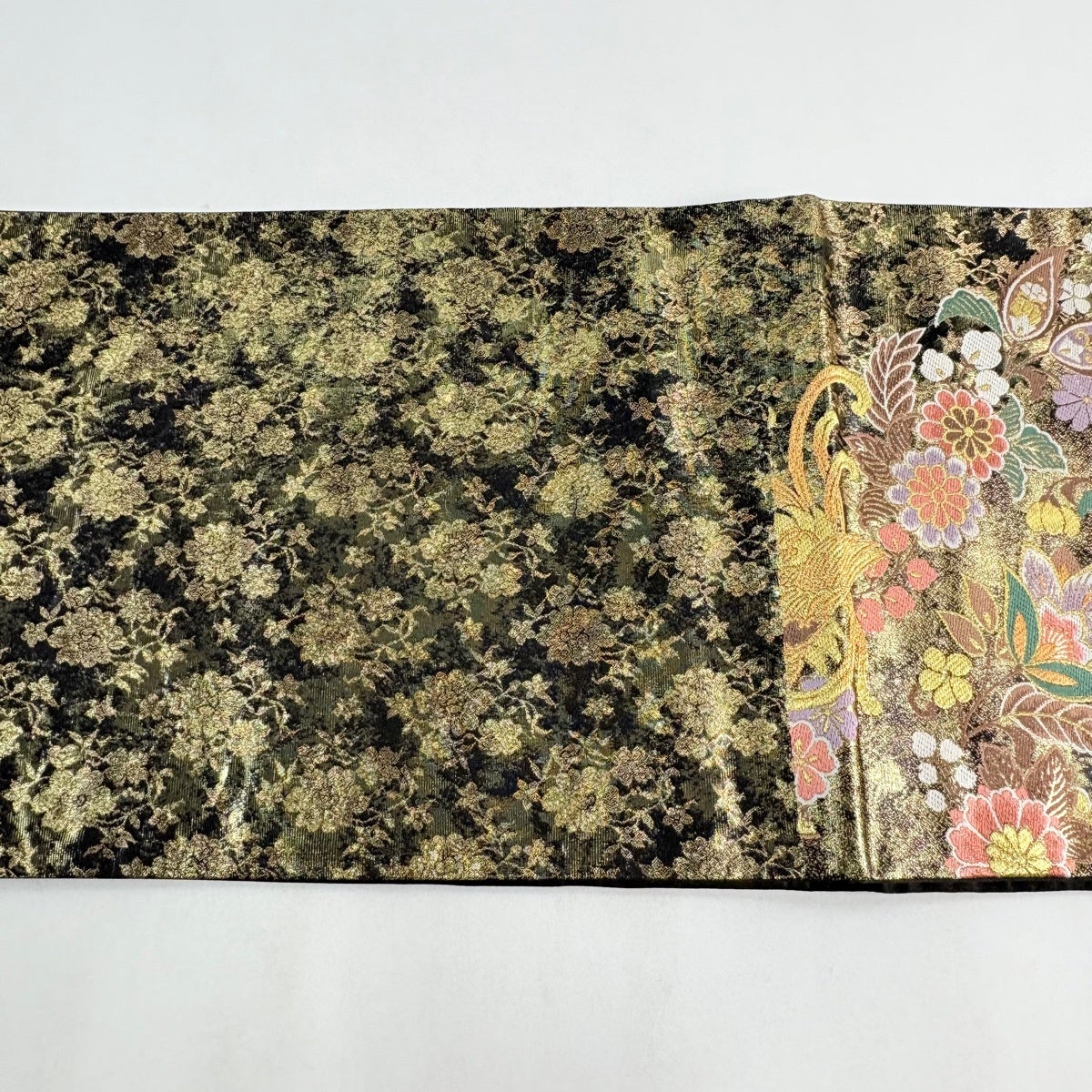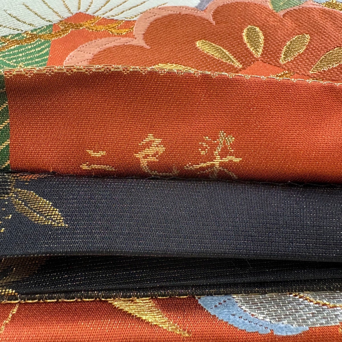 袋帯 秀品 裂取華文 草花 刺繍 箔 緑 六通 正絹