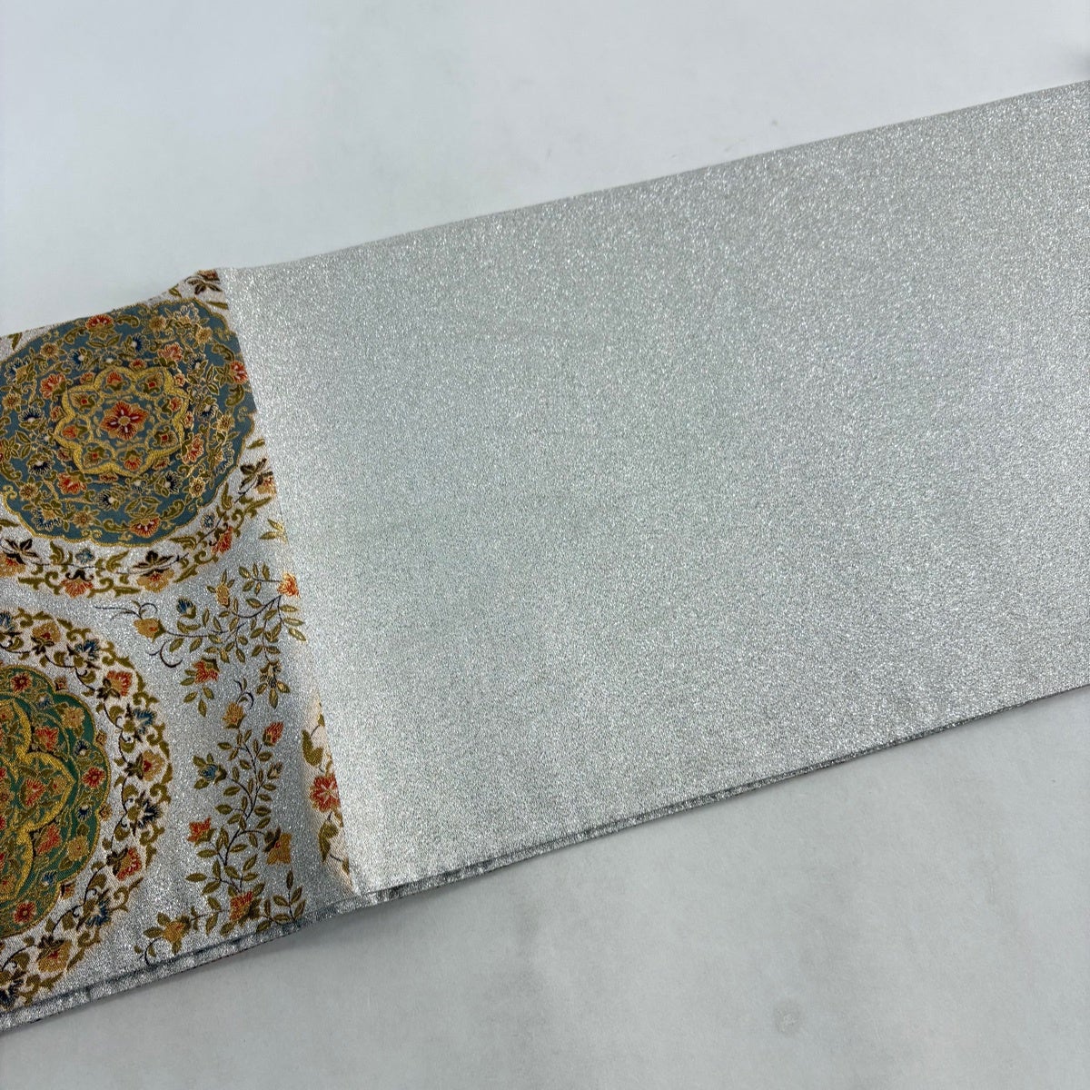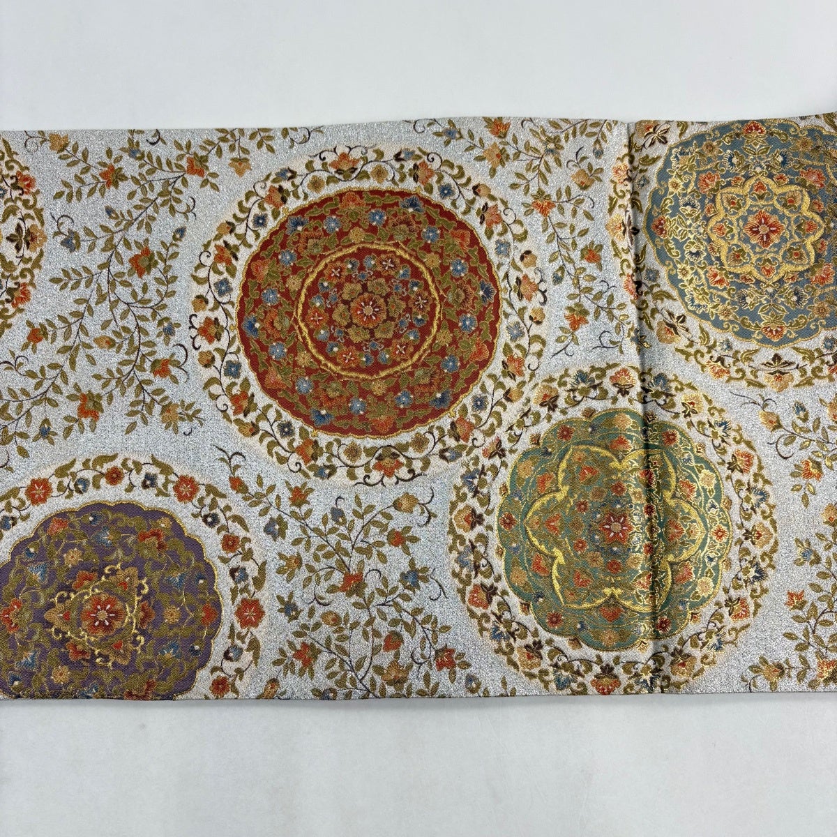 【美品】 袋帯 秀品 落款あり 華文 花唐草 金糸 箔 銀色 六通 正絹