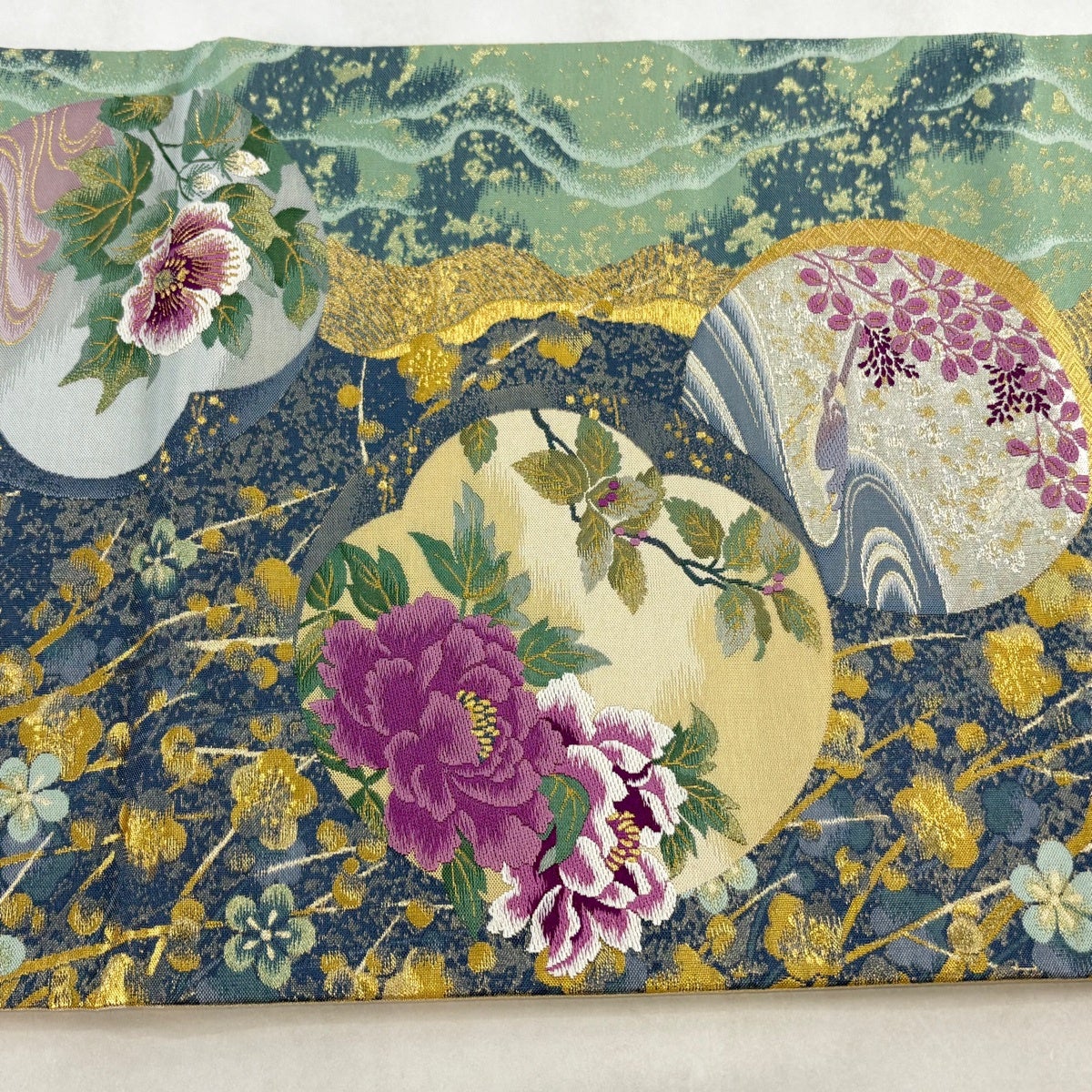 【美品】 袋帯 名品 草花 枝梅 金糸 箔 青灰色 お太鼓柄 正絹