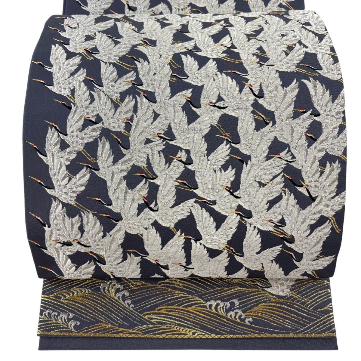 【美品】 袋帯 名品 落款あり 鶴 波頭 金銀糸 青灰色 全通 正絹