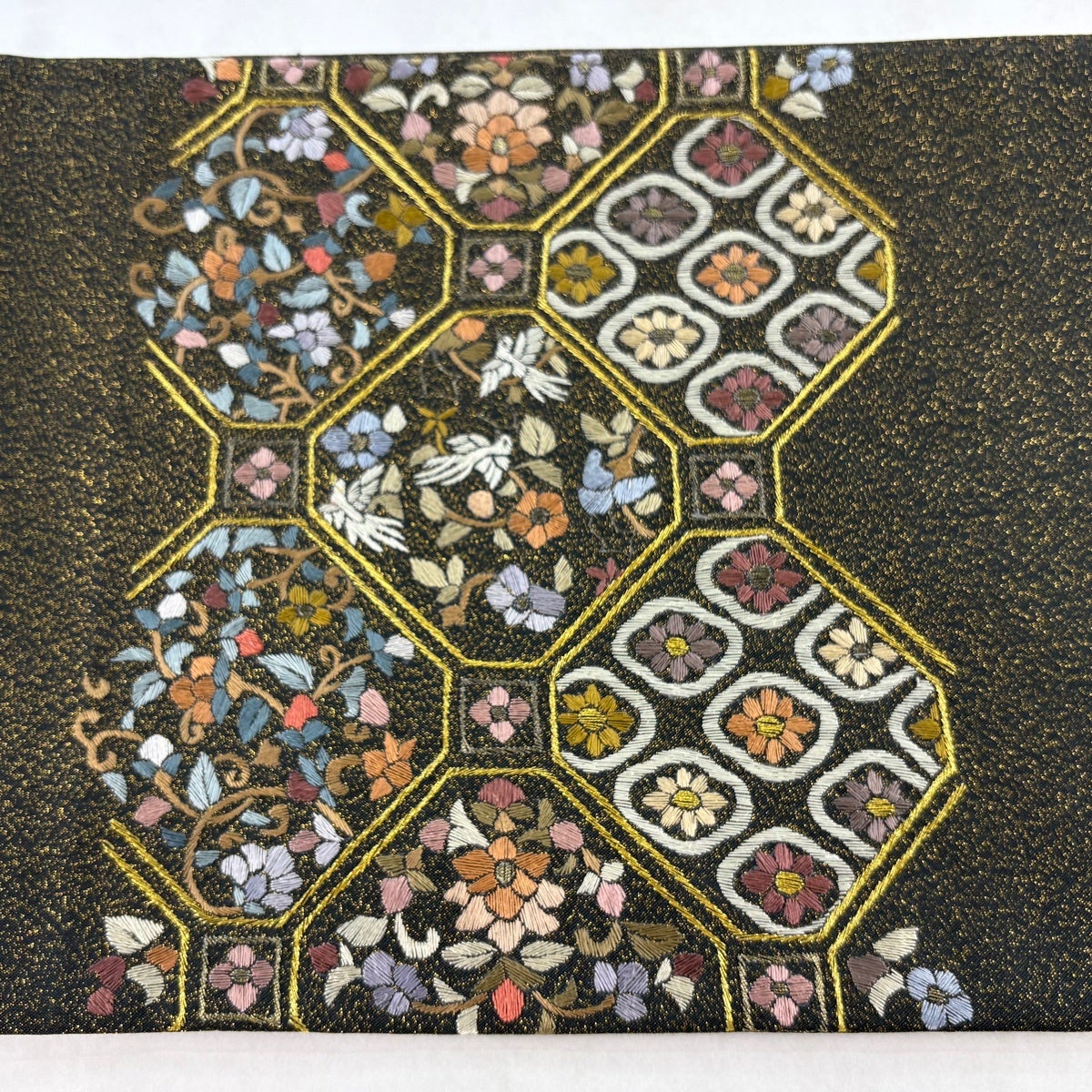 袋帯 名品 華文 向かい鳥 螺鈿箔 金彩 金色 お太鼓柄 正絹