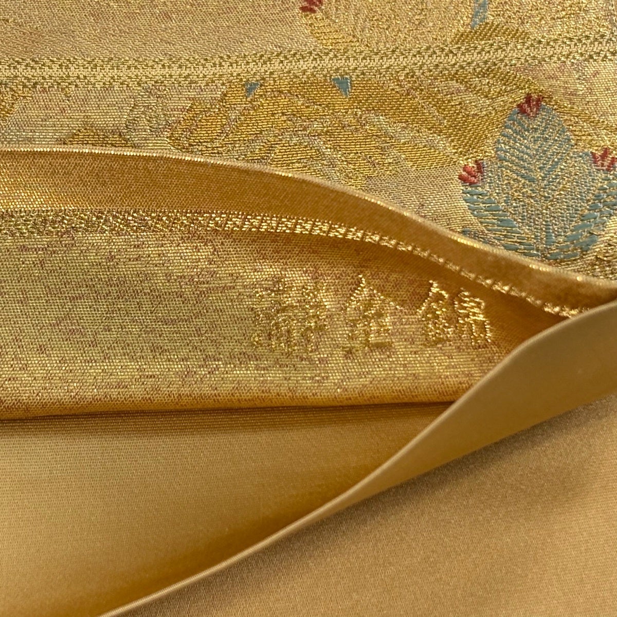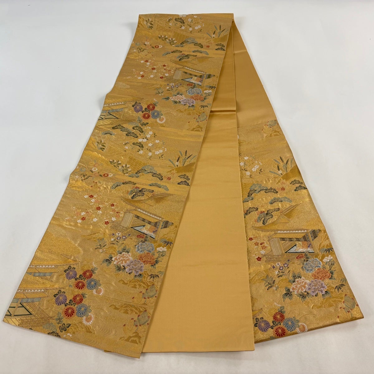 袋帯 名品 長嶋成織物 落款あり 瀞金錦 桃山栄華 建物 草花 本金箔 刺繍 金色 六通 正絹
