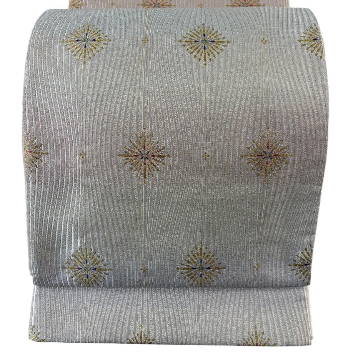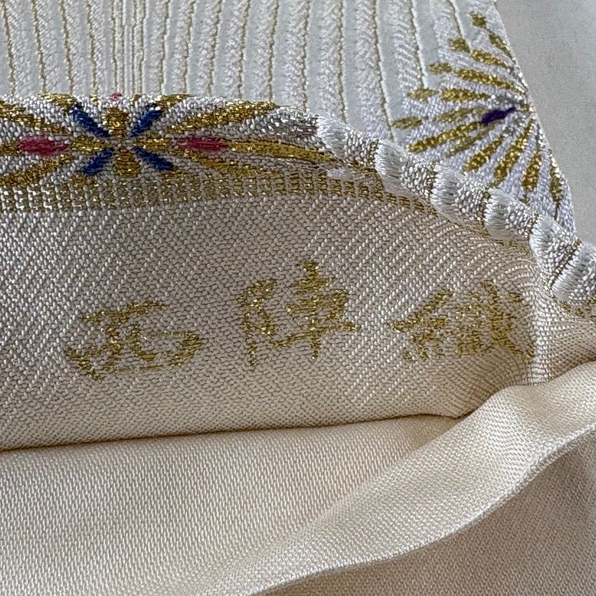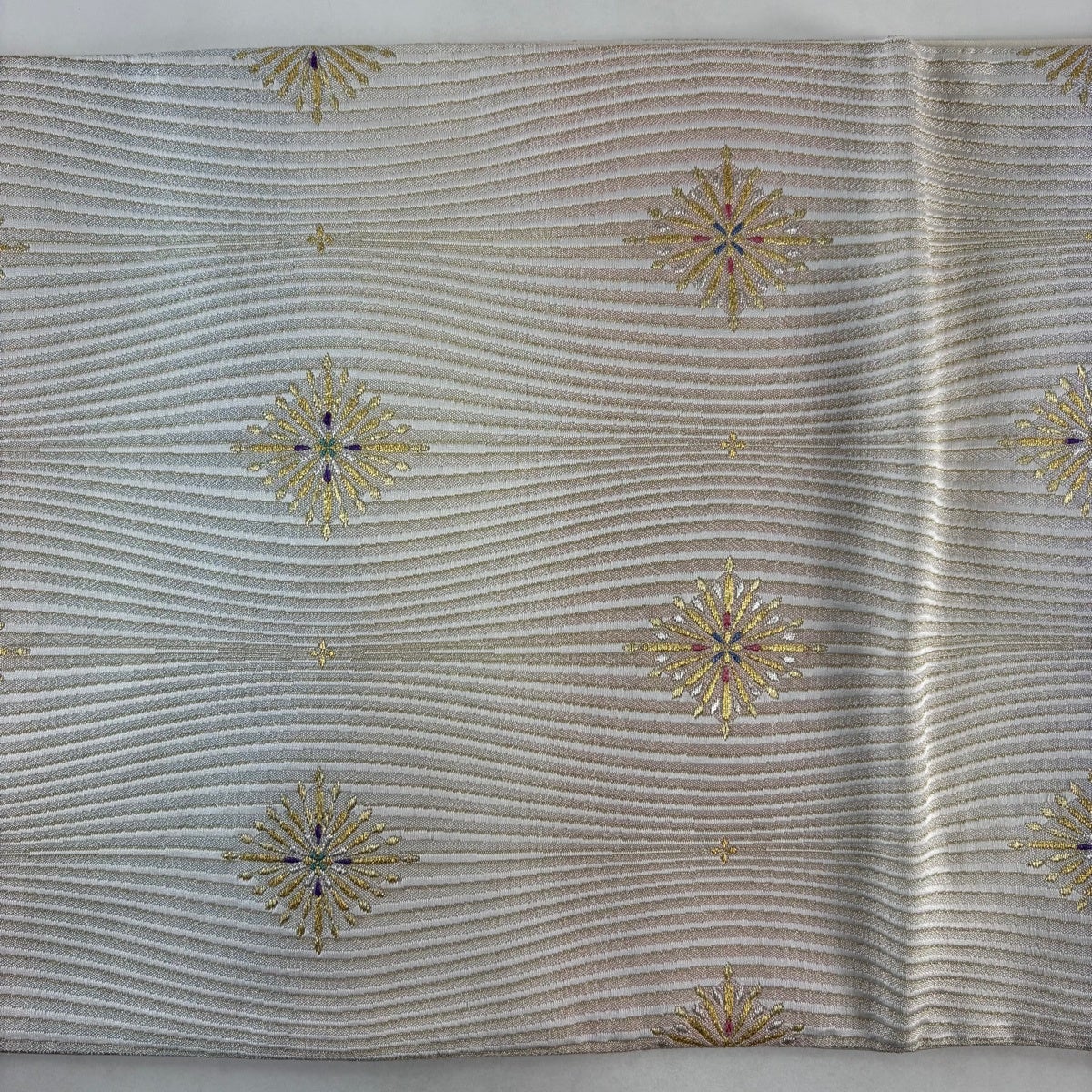 名古屋帯 逸品 段縞 燕 刺し子刺繍 クリーム 正絹
