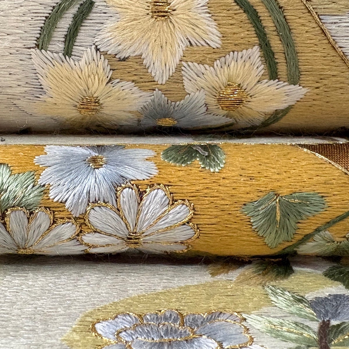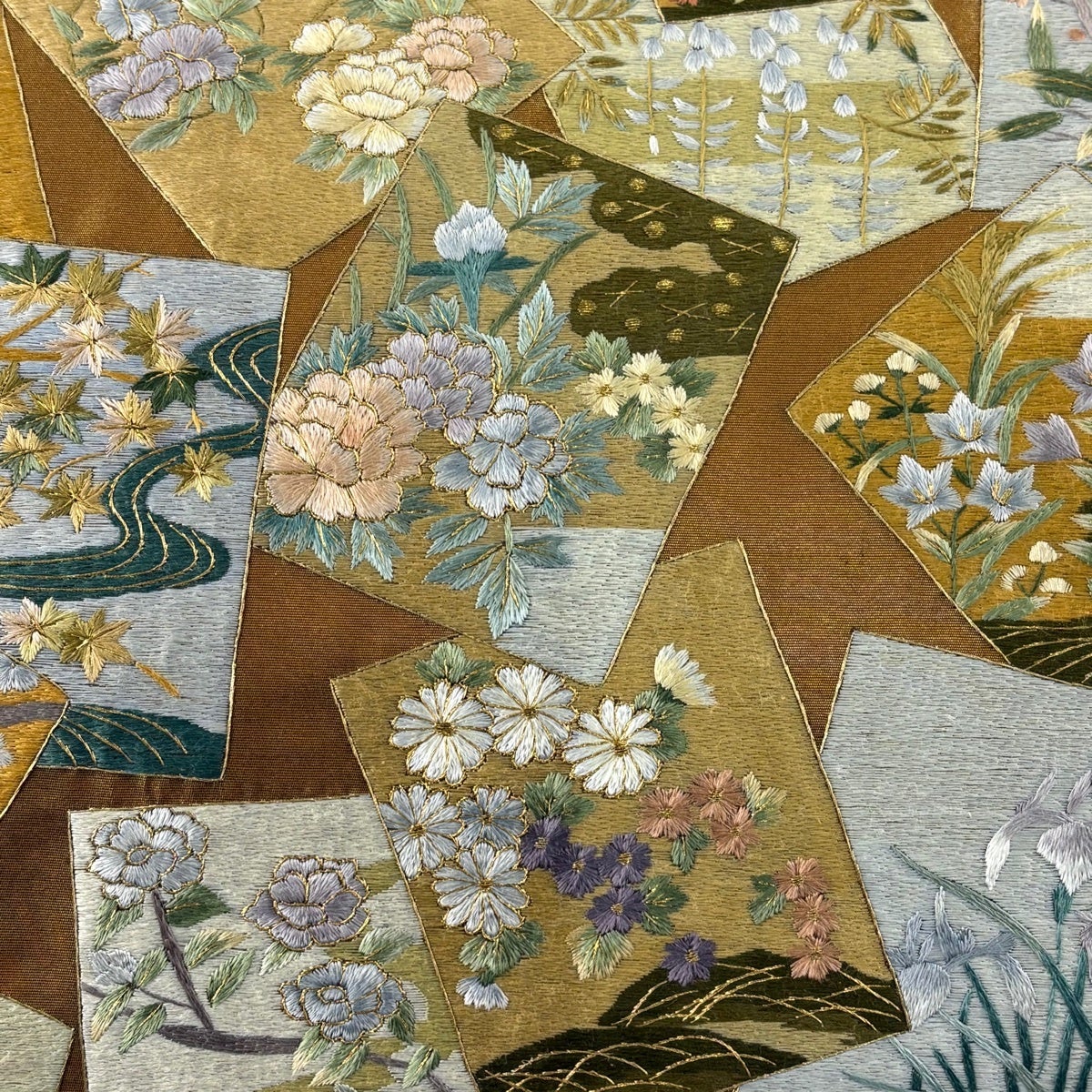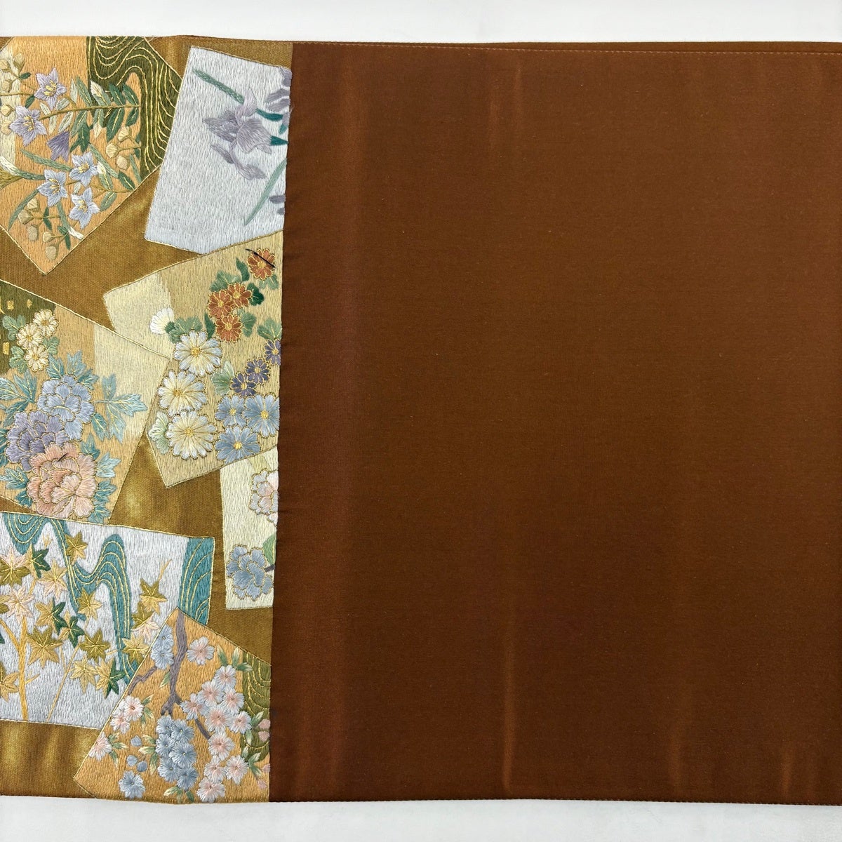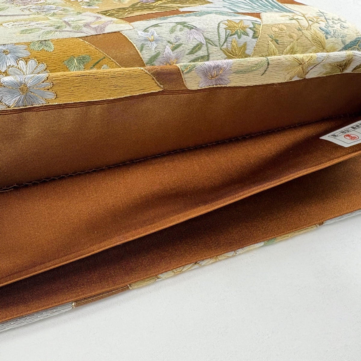 【美品】 袋帯 逸品 やまと 色紙 草花 刺繍 金糸 金茶 六通 正絹